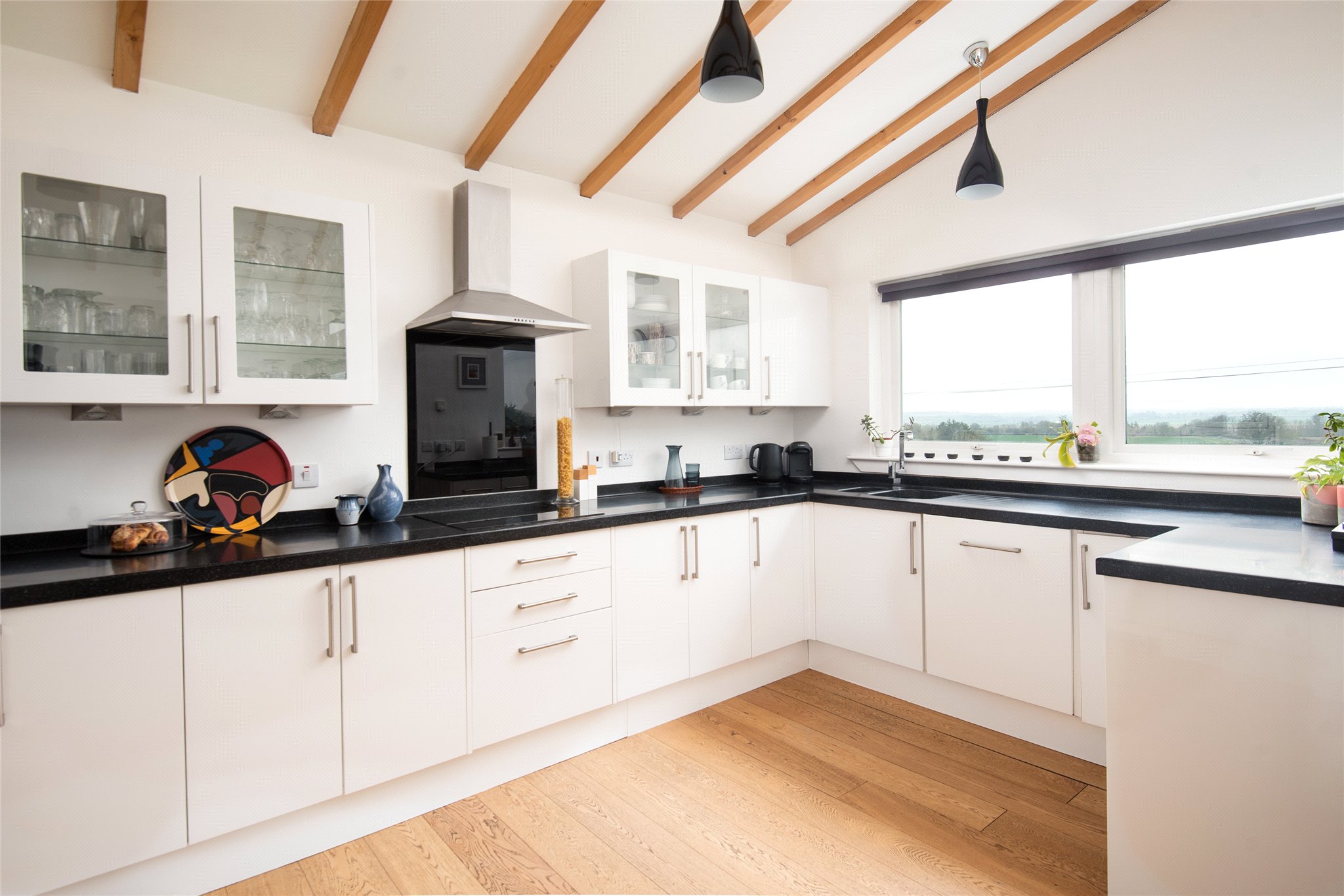 On arrival, wide steps through the garden take you to the front door and upon entering the hallway, there is a large double height lounge with glass fronted gable end offering views to the landscaped garden and Cheviot Hills. The room benefits from wood beams, oak floors and a wood burning stove.