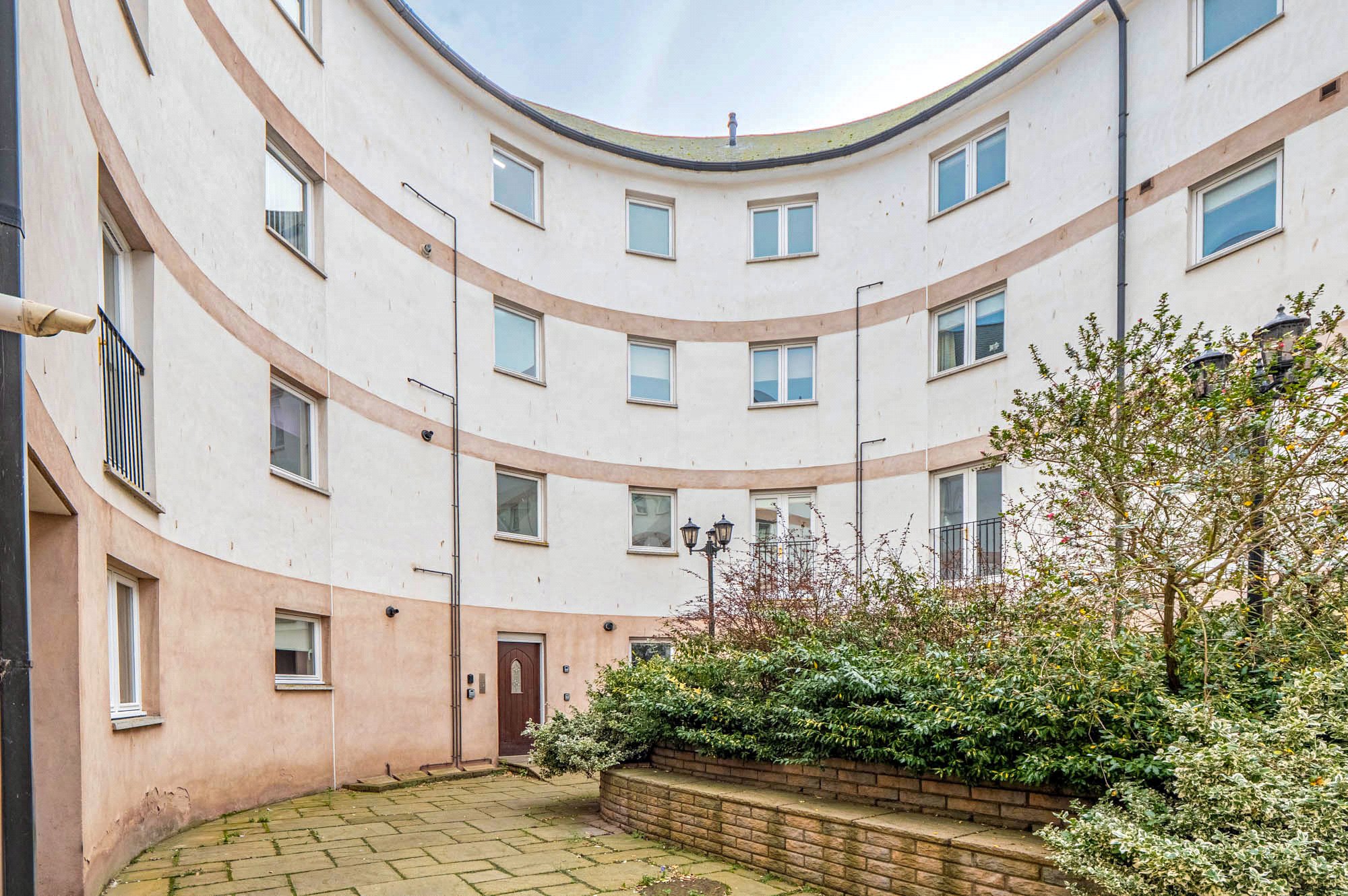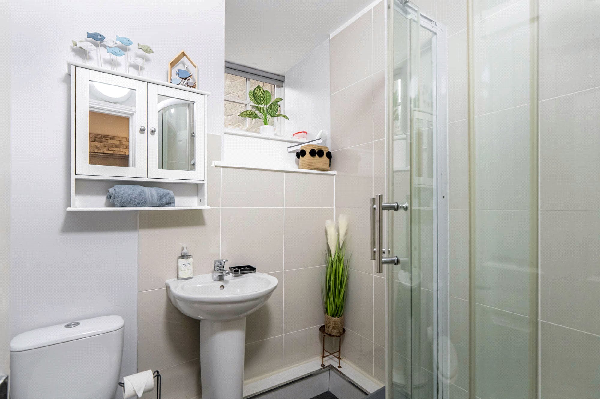 A door with an intercom secure-entry system leads into a communal hall and the front door is on the right hand-side. The front door opens into a vestibule with wall-mounted hooks for coats. A door from the vestibule opens into the open plan living and kitchen. There is a window overlooking the courtyard and a window to the rear of the flat. The kitchen has a range of floor and wall-mounted units with counters over, a stainless-steel sink and drainer and integral appliances including electric oven and hob with extractor over, fridge and freezer and plumbing for a washing machine. The bedroom has a window to the rear of the apartment and the shower room next door also has a window to the rear and comprises corner shower, hand basin and WC.