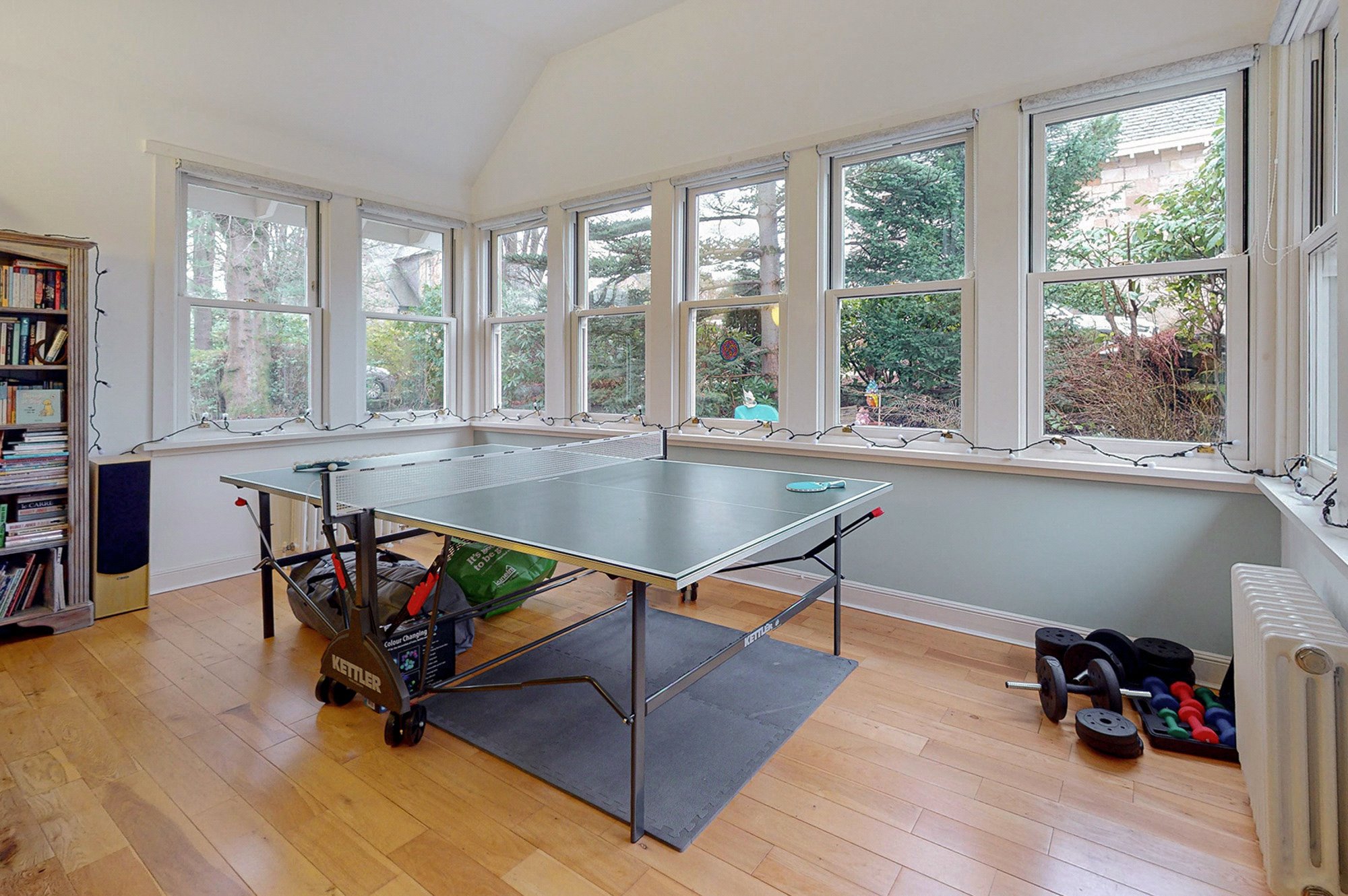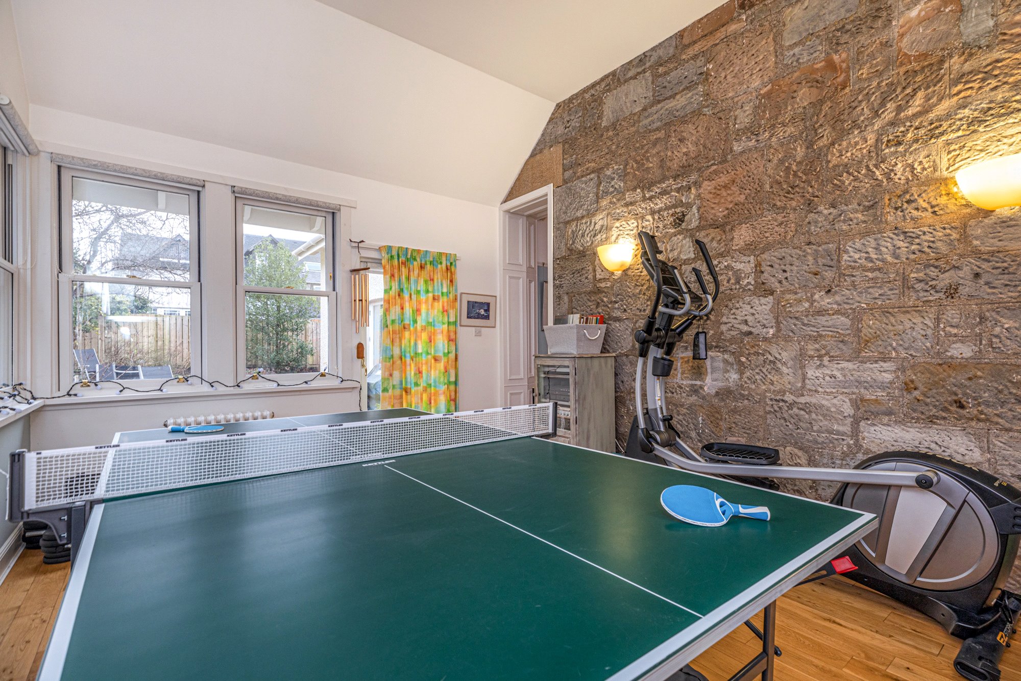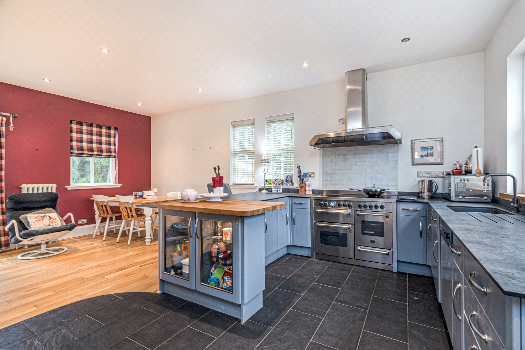 A most handsome house, the extensions, finished in stone and render, blend effortlessly with the original stonework, are all set beneath regularly maintained pitched roofs in Scots and Welsh slate. The double-glazed sash and case windows, in all rooms of the original house, were bespoke made by the craftsmen of Custom-Built Joinery who also made the reproduction front door, with traditional etched glass panel. Blairs of Greenock were commissioned for the sash and case windows. In the garden/family room.