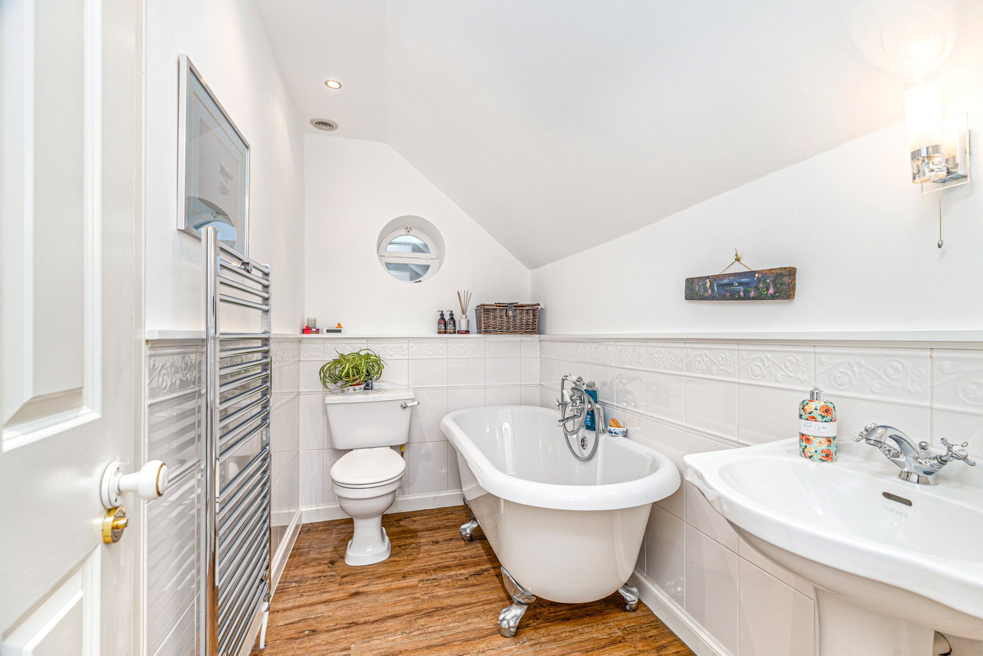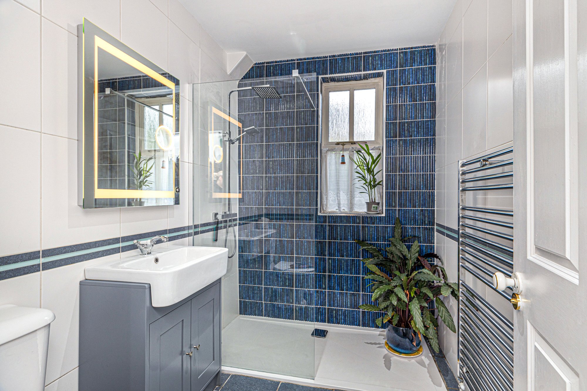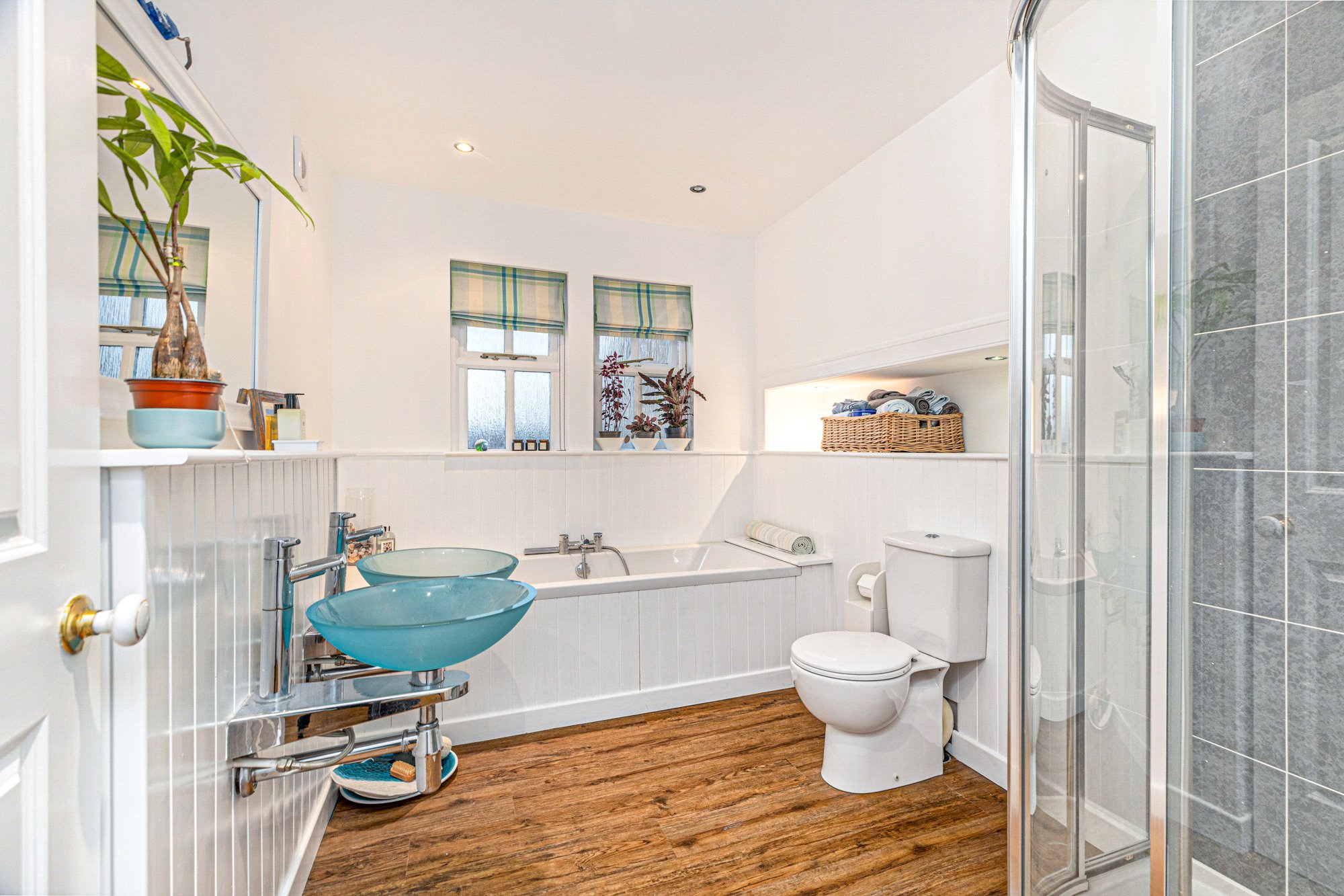 The dining kitchen is very much the heart of this home and is a great space with lots of windows featured on three sides (east, west, and north) including a set of French doors to a lovely, sheltered, garden patio to the “west garden” and a” back door” to the east side of the house and to the garage and driveway. Sanitary ware is white and contemporary in the two ensuite bathrooms and the ground floor shower room. Central heating is mains gas with a Vokera regular boiler serving a 200-litre unvented hot water cylinder to ensure plenty of pressure to showers and taps. Traditionally styled, reproduction, “column” radiators are in all public rooms, bedrooms, and halls with modern chrome towel radiators in the two ensuite bathrooms and the shower room.