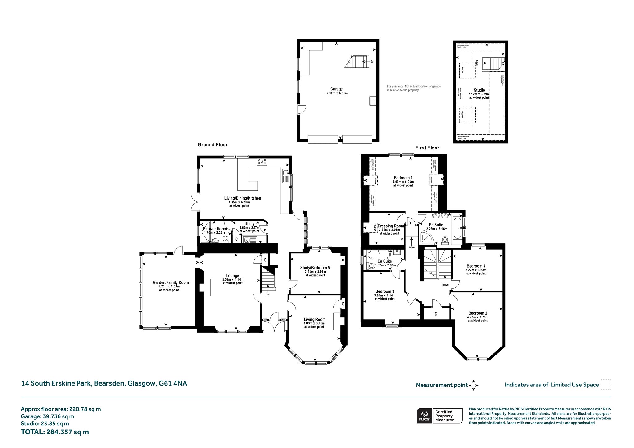 - Very large (7.12 m x 5.58 m) detached Double Garage with Studio Room above