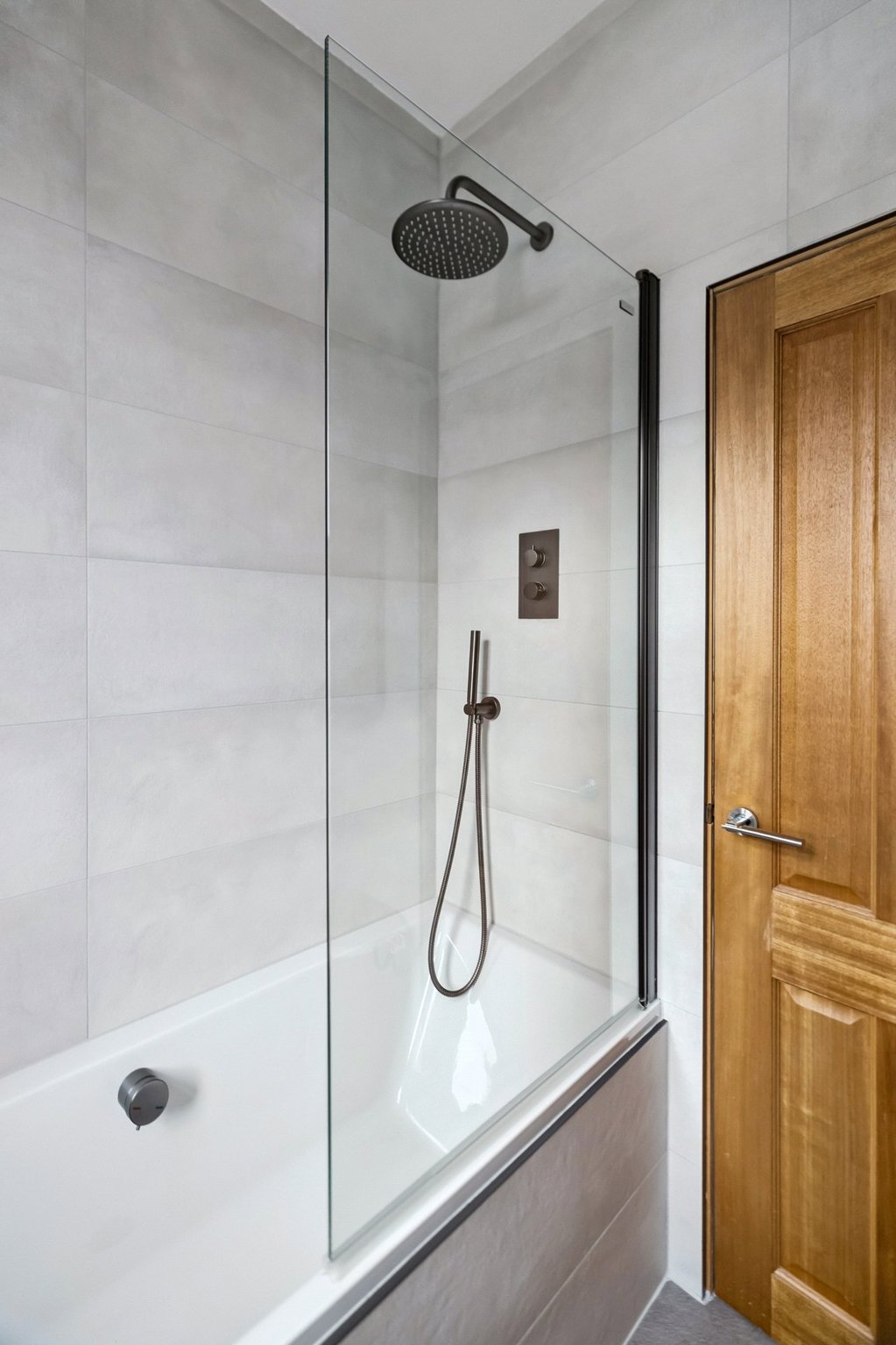 - Threepiece bathroom with rainfall shower over bath