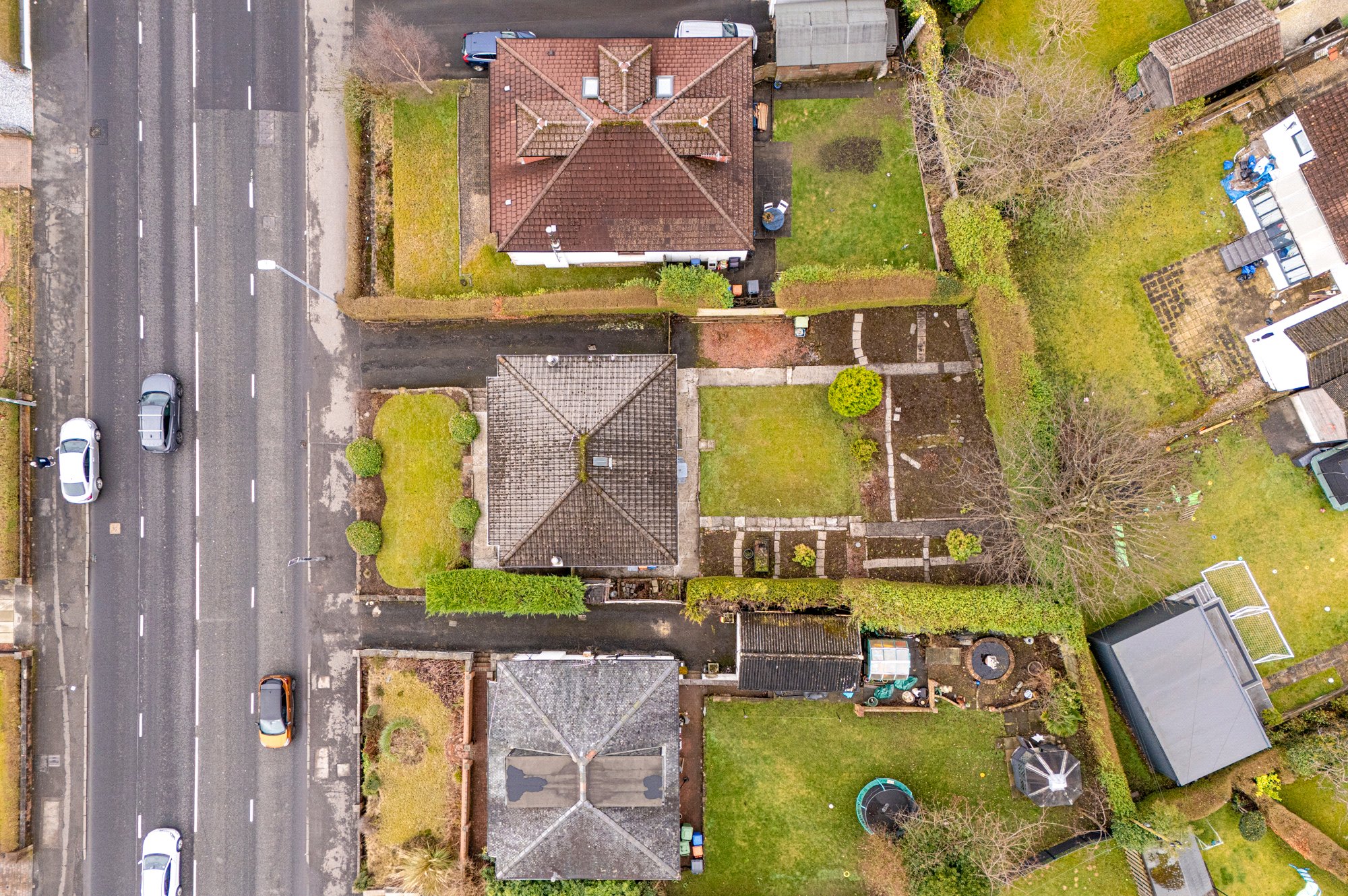 The front garden is laid mainly to lawn with wellkept hedging, while the expansive rear garden incorporates lawn, stone paths, and defined planting beds—an ideal setting for outdoor dining, family use or further landscaping.