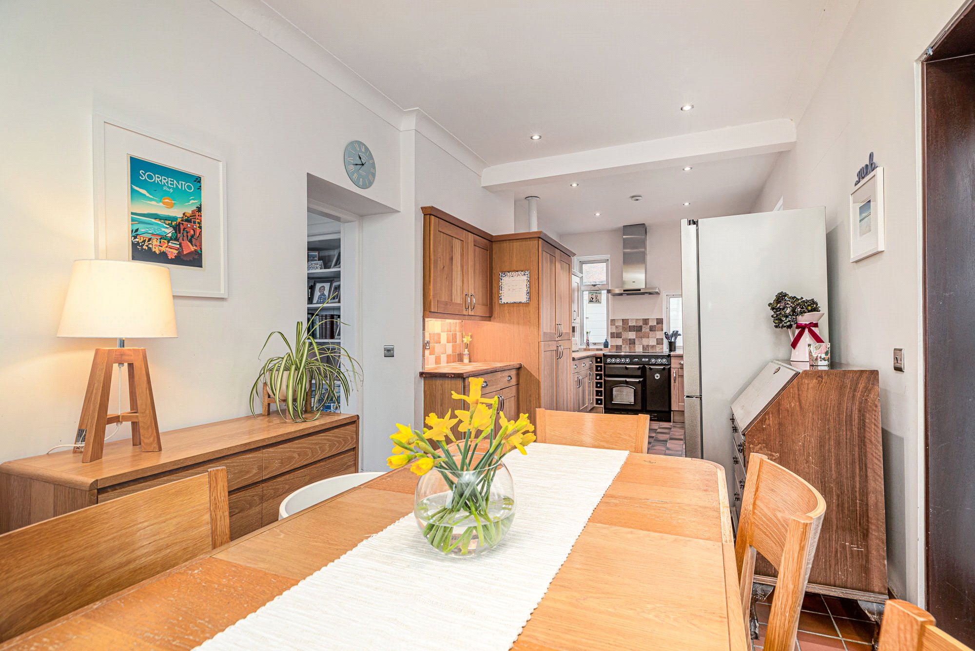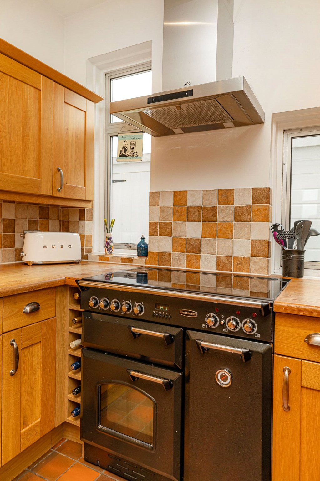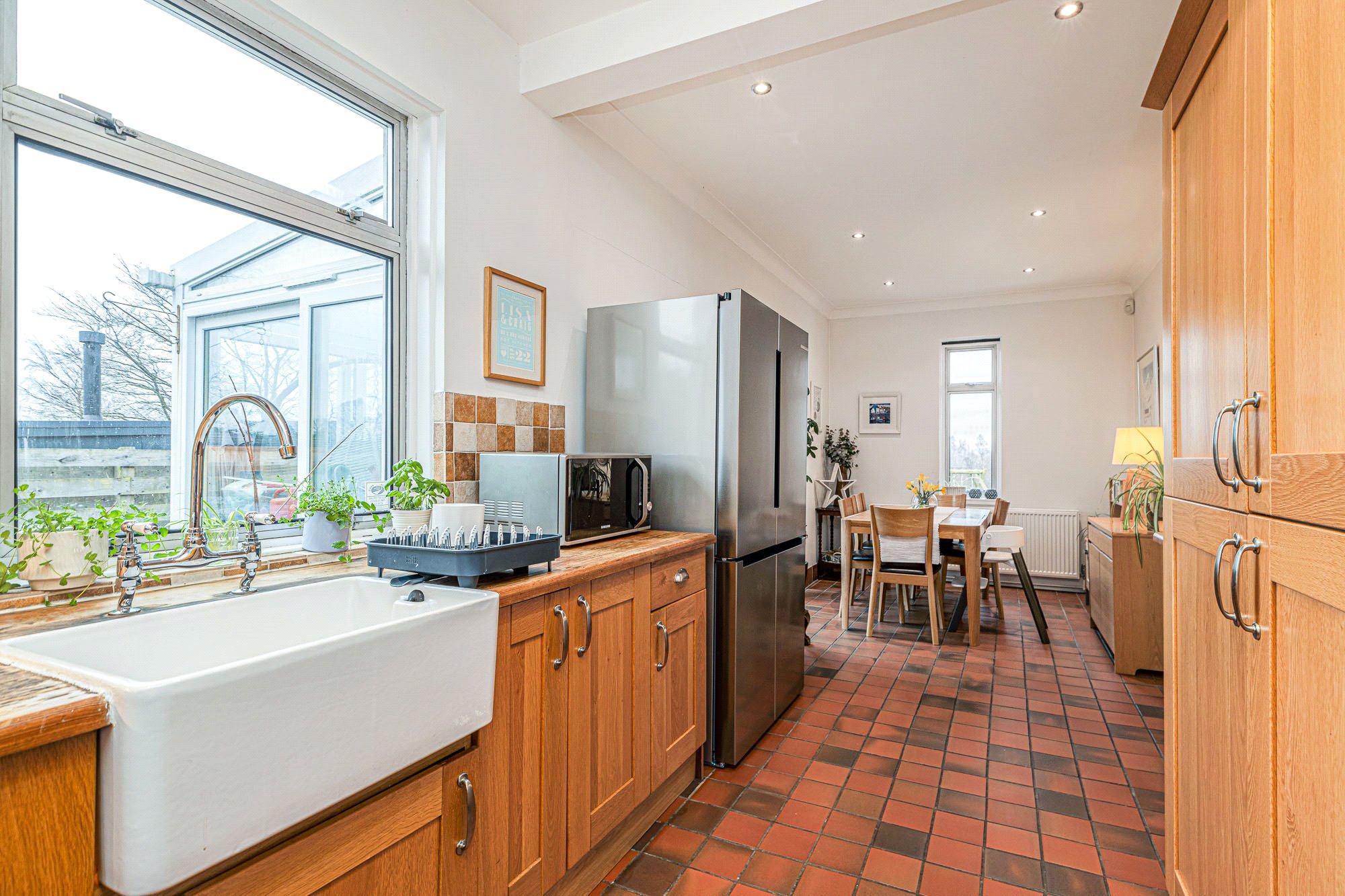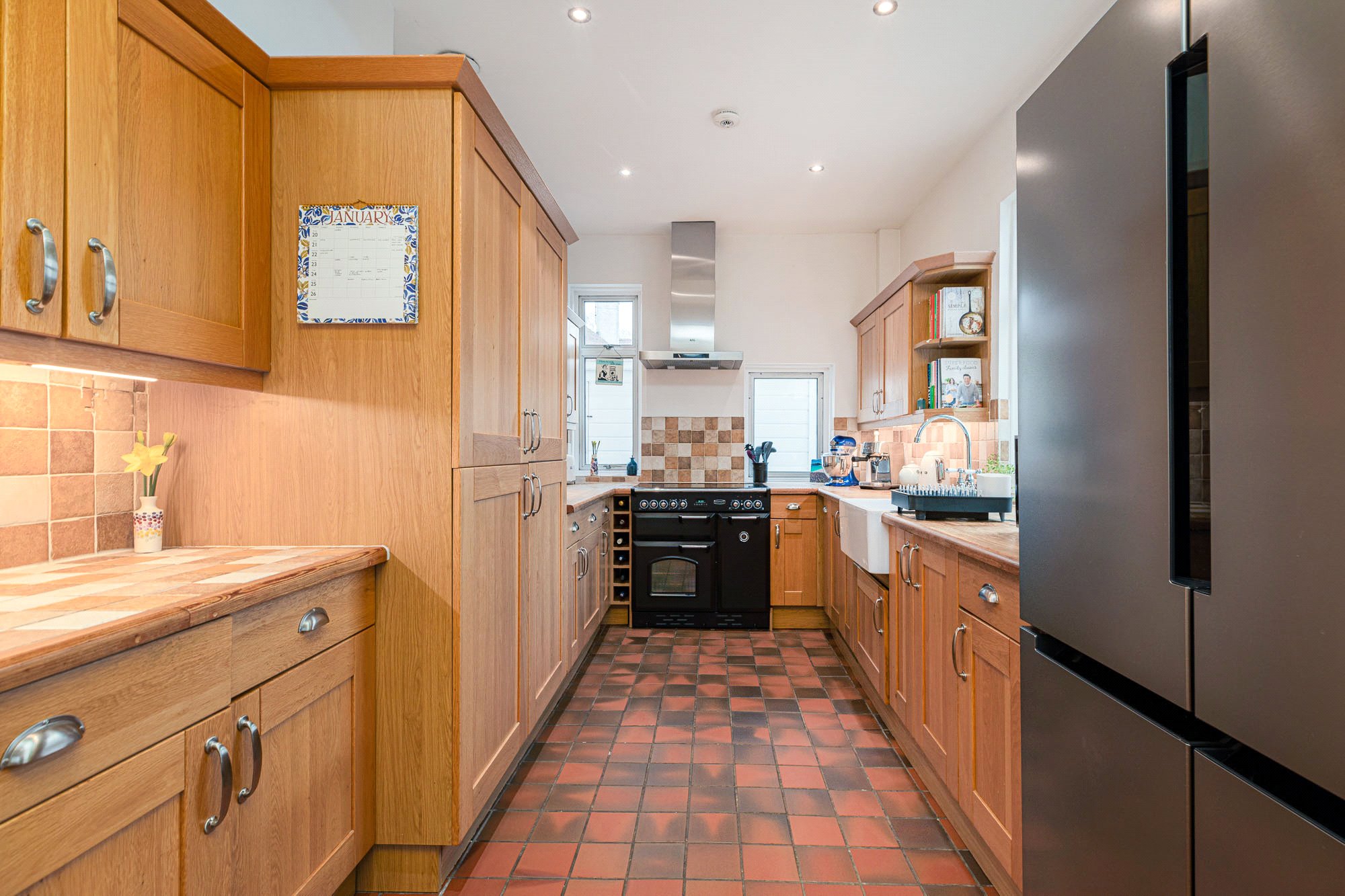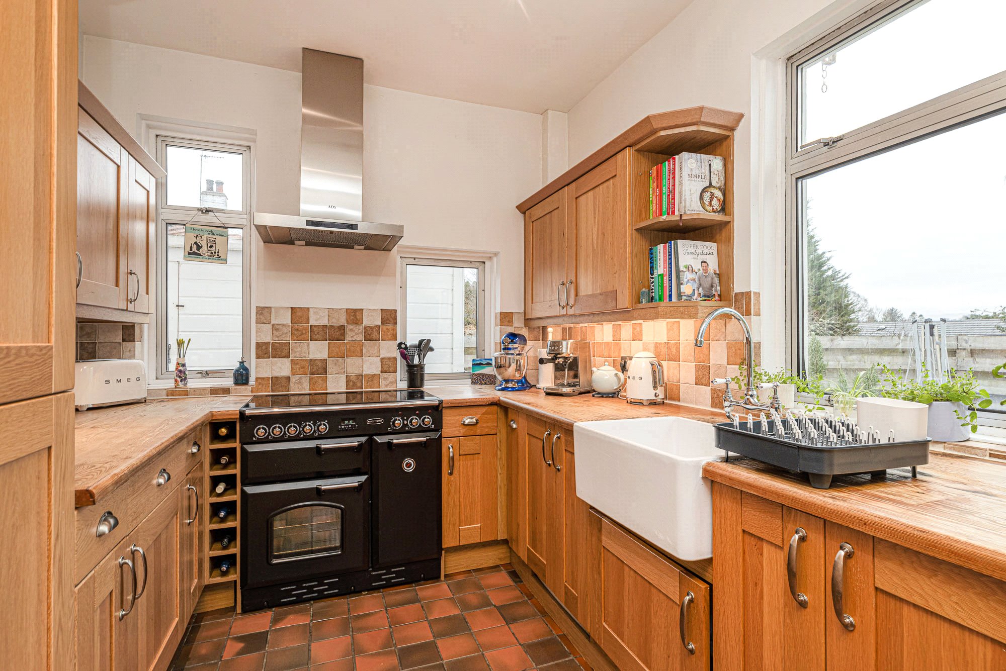 - Dining Kitchen - with oak cabinets and thick solid oak worktops into which is set a Belfast sink. Windows featured on three sides and with French door to the conservatory. Attractive quarry tiled floor. Appliances include a Rangemaster cooker with five halogen hobs, cooker hood and concealed dishwasher.