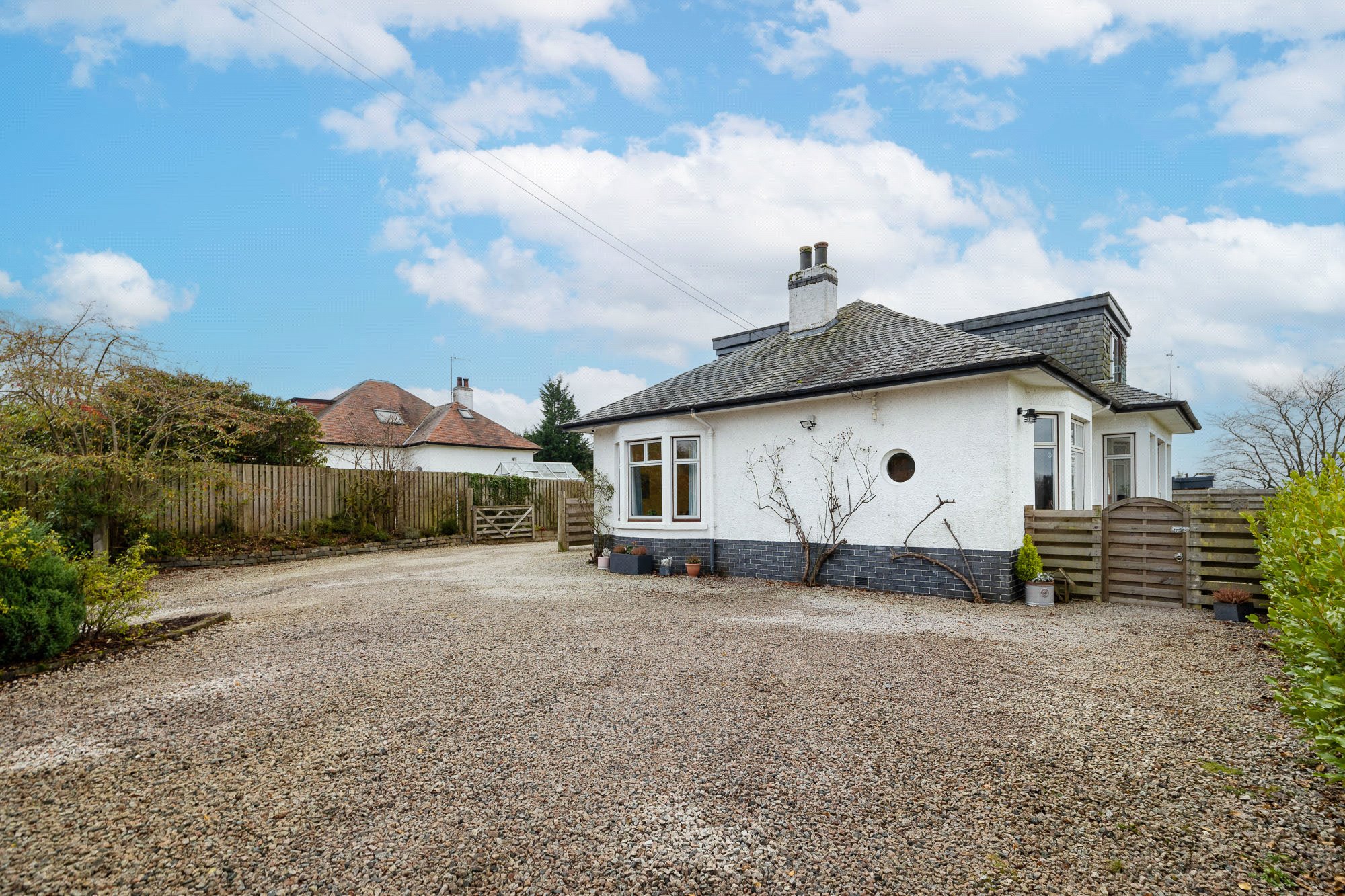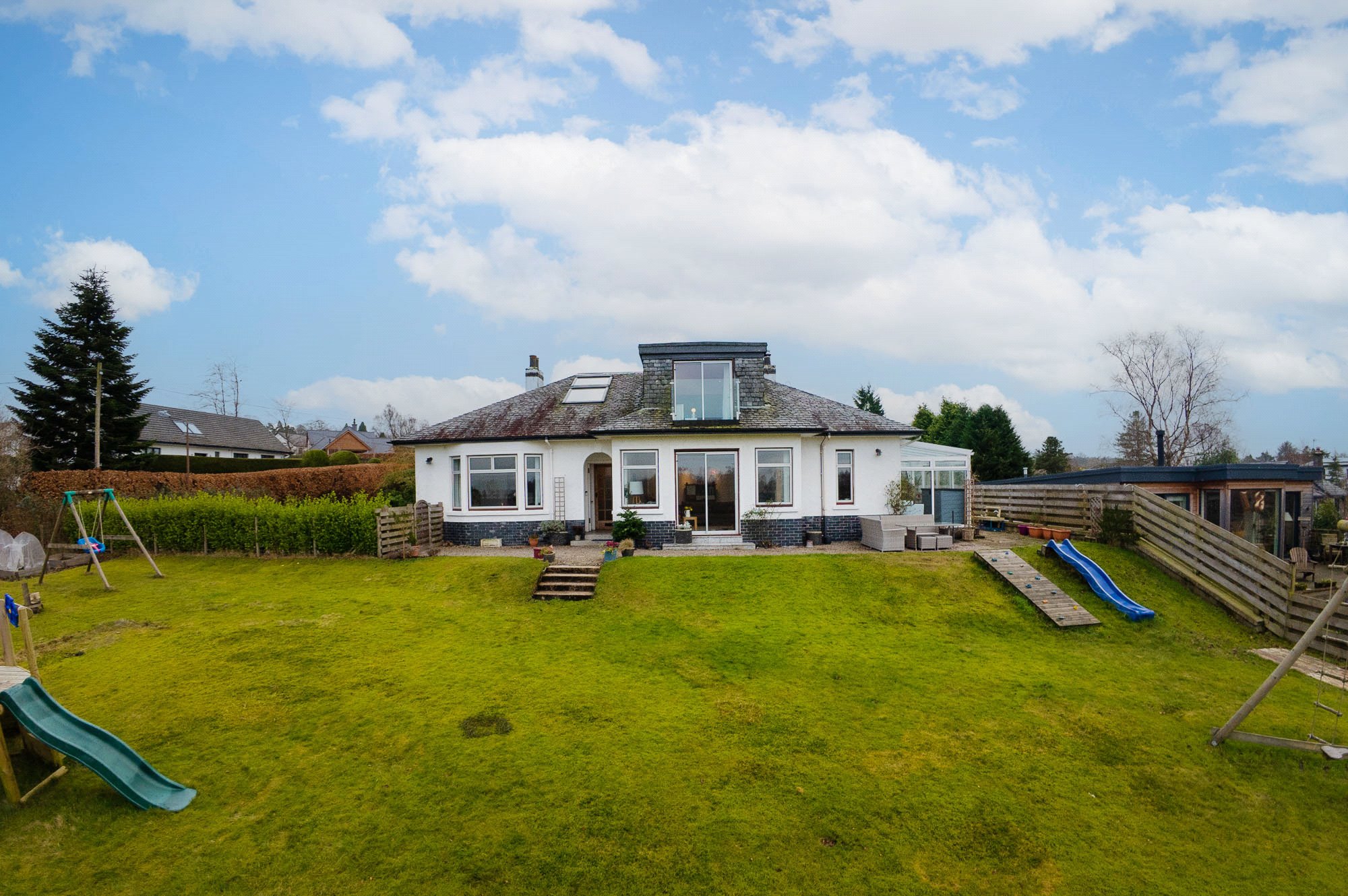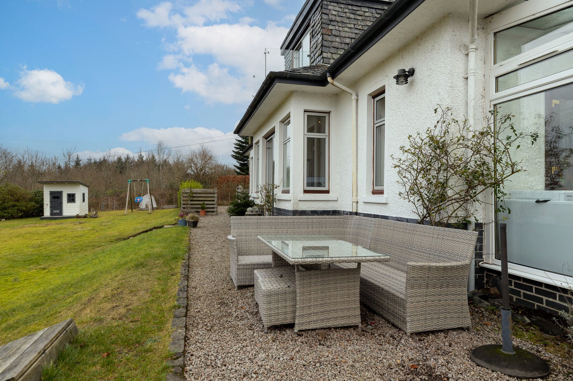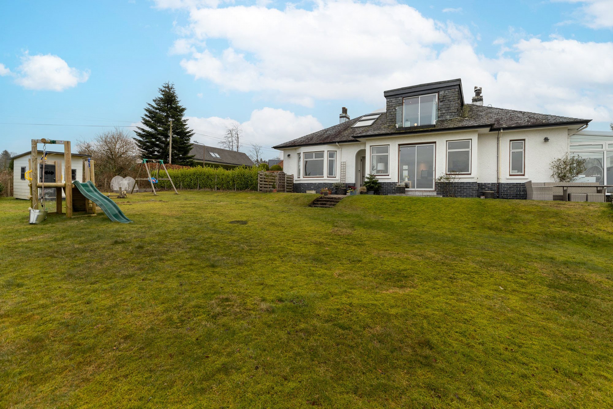 On the westerly edge of the village, but close to its centre, is this charming four-bedroom Detached House, built in 1938. Firfield affords a truly outstanding view to the distant horizons of the Munros of the lower Highlands that flank Loch Lomond, including the summit of Ben Lomond. It is a view of fields, woodland and hilltops never to tire of and one that provides breathtaking sunsets.