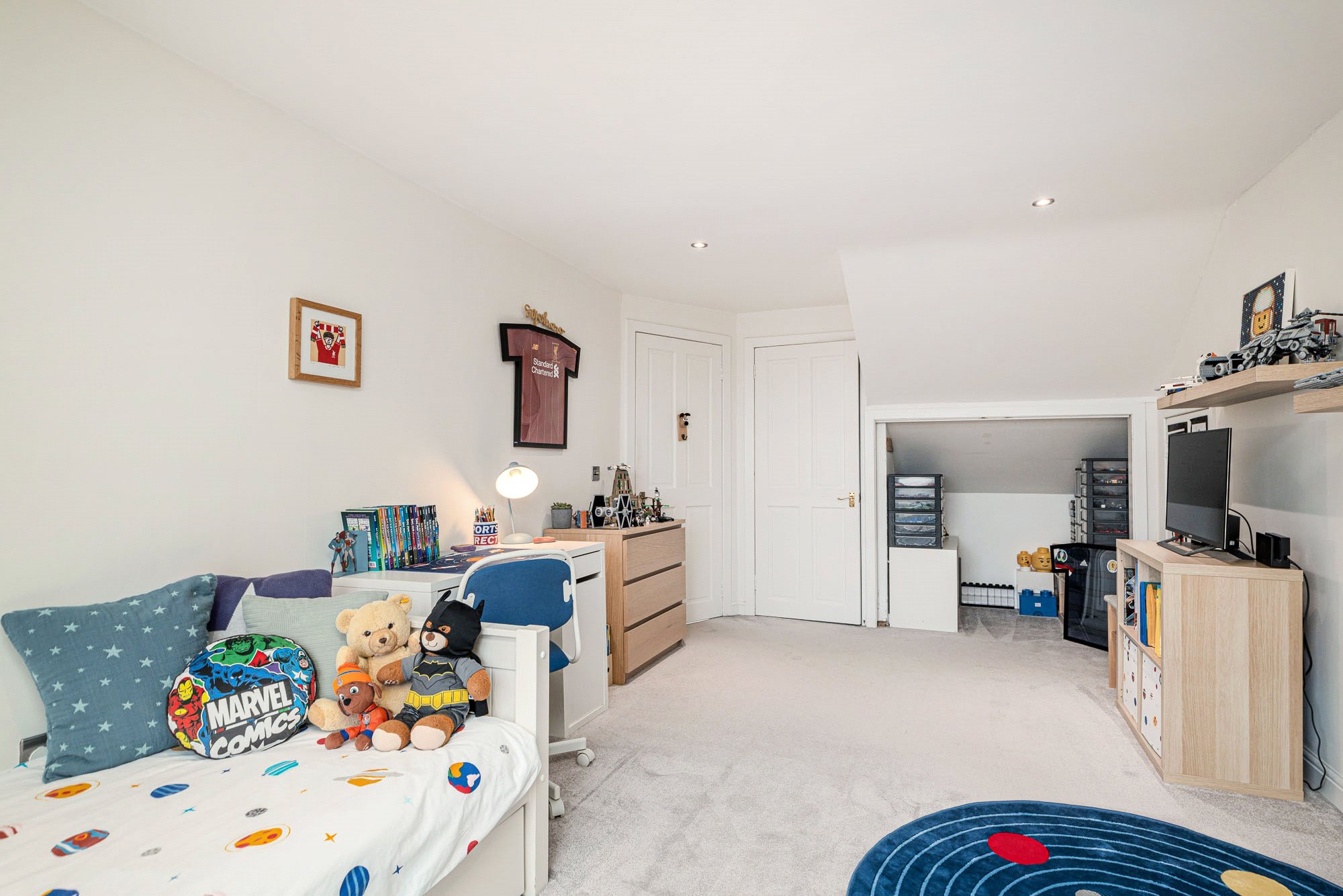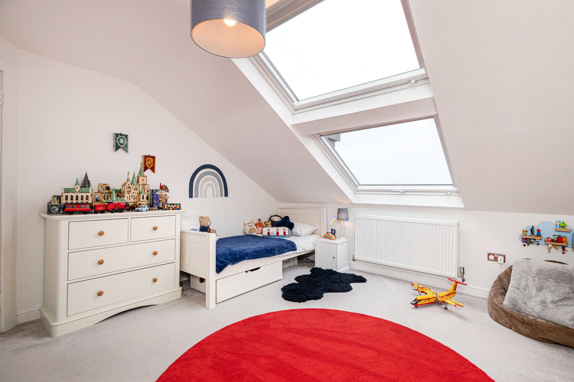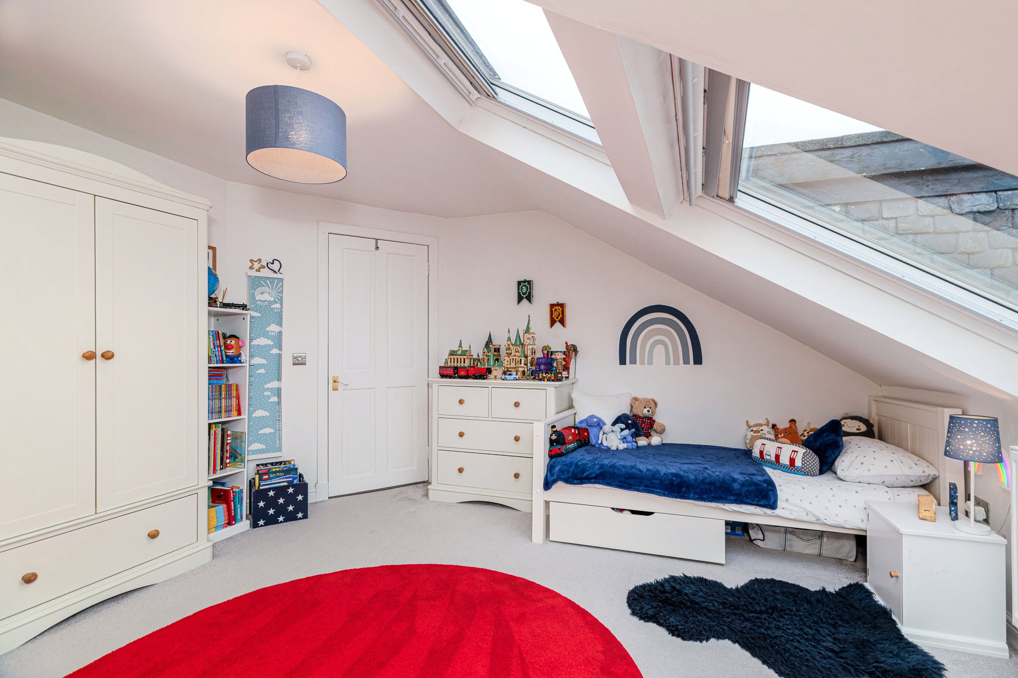 - Bedroom 4 - this has the feature 2-Velux window system. Wardrobe. Access door to more floored eaves storage (light).