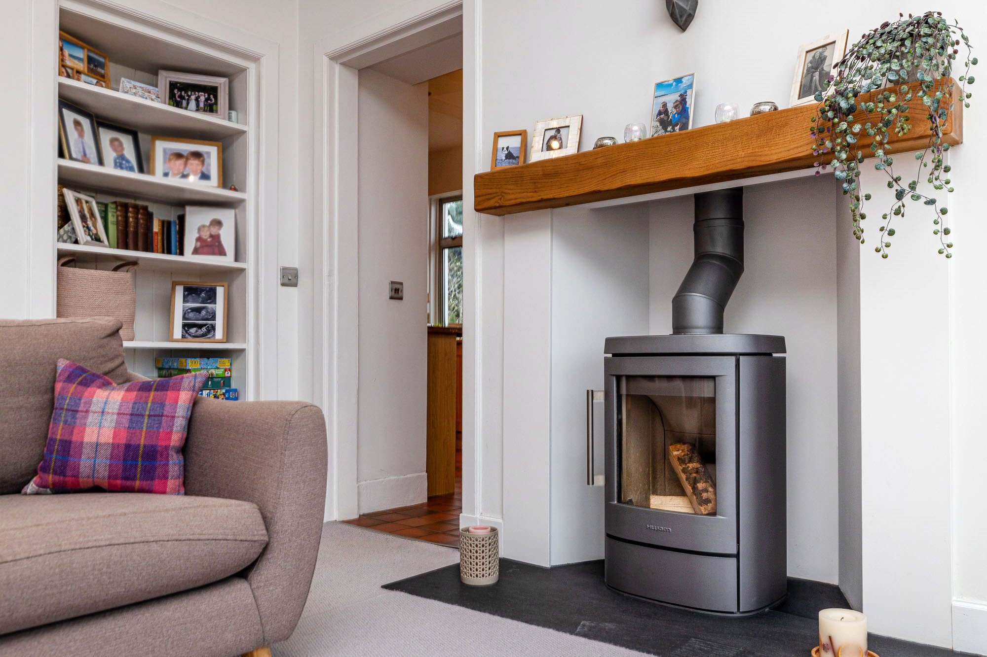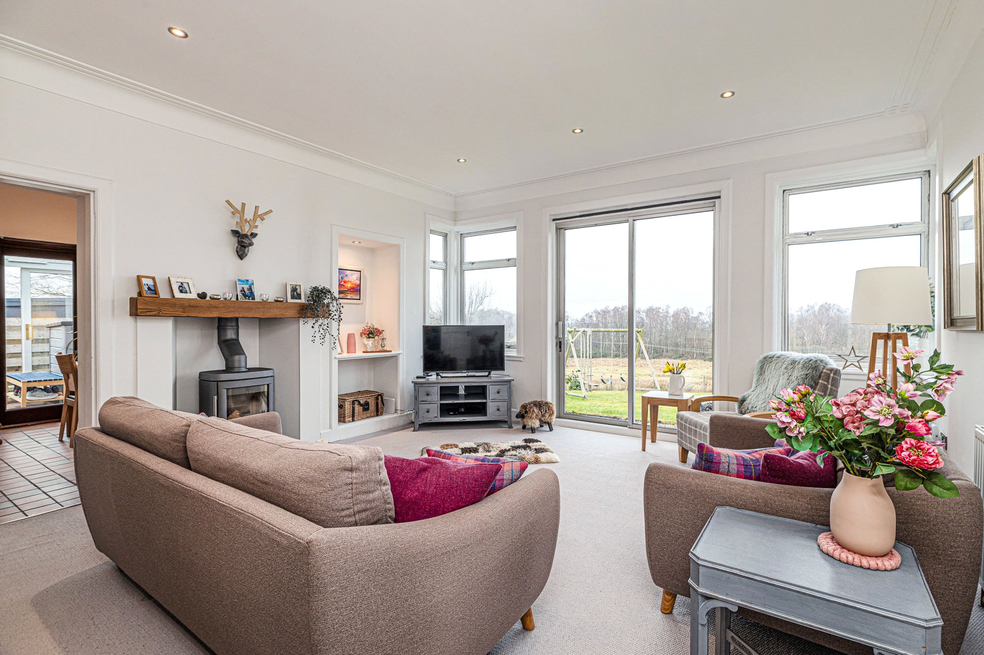 - Lounge with contemporary log burning stove