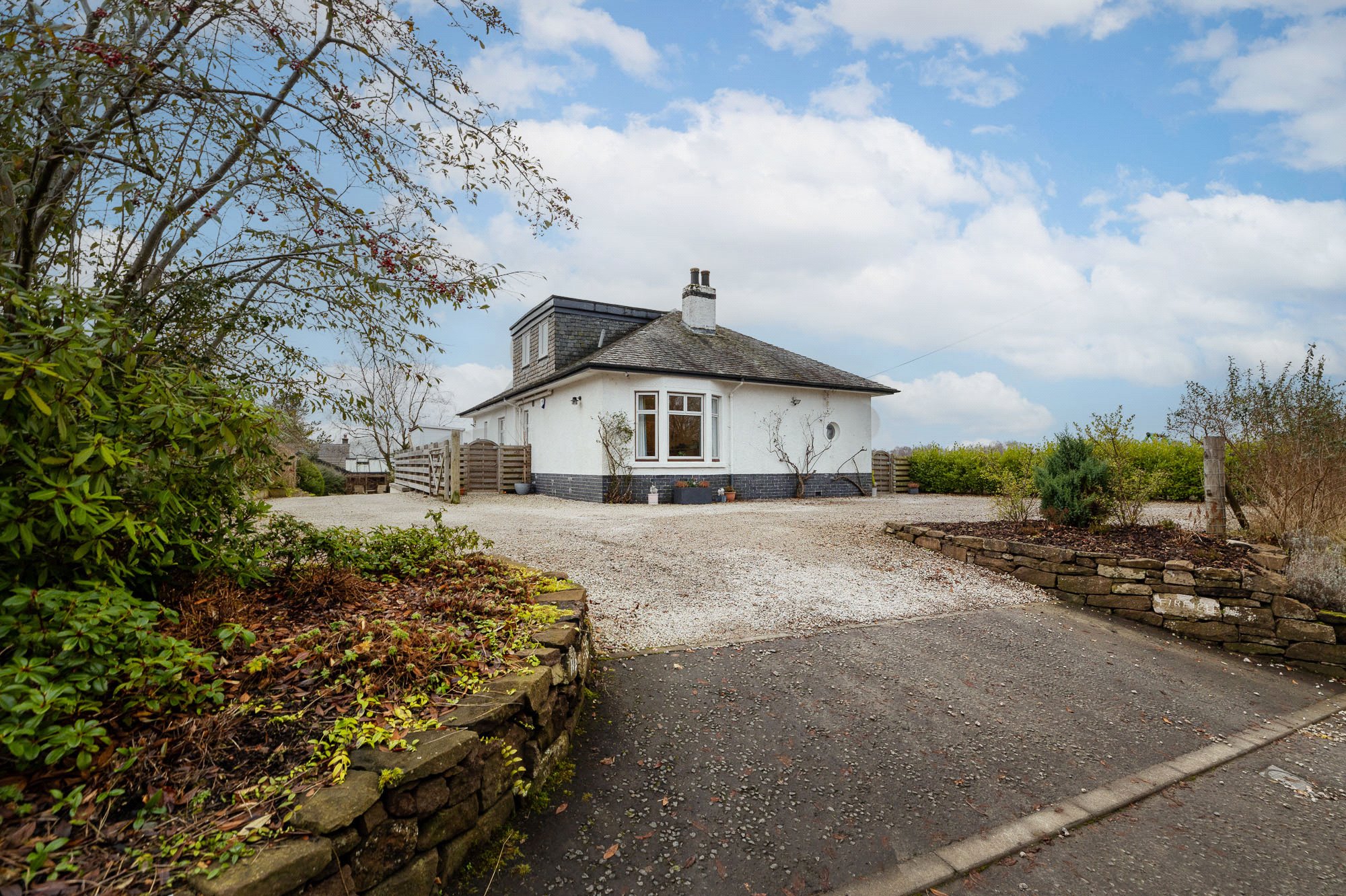 An established garden lying mostly to grass. Pathway terrace and sun deck to the front. A wide gravel drive provides off road parking for four/five cars. A hedgerow, with wall, screens Gartness Road, a fence provides a boundary to the field set to the front/west of the property, and a Ranch fence is to the southern boundary of the small, contemporary designed, neighbouring property, Little Firfield.