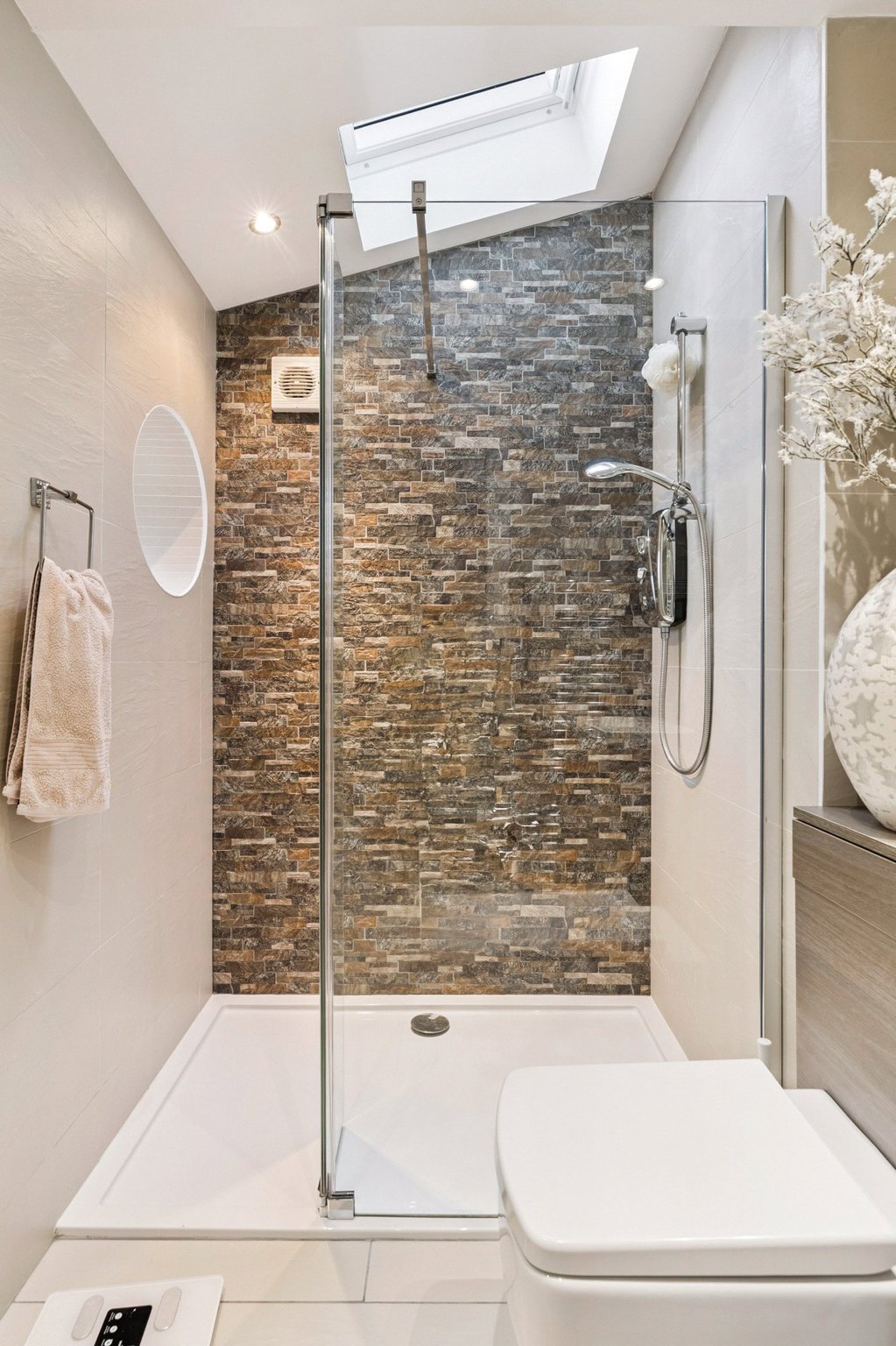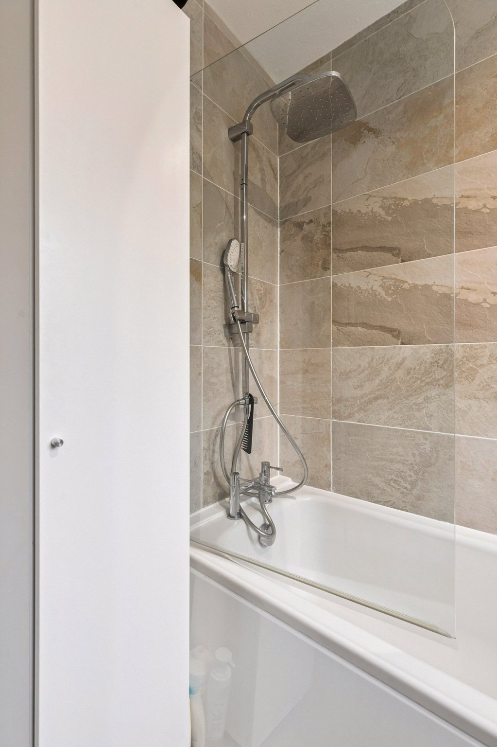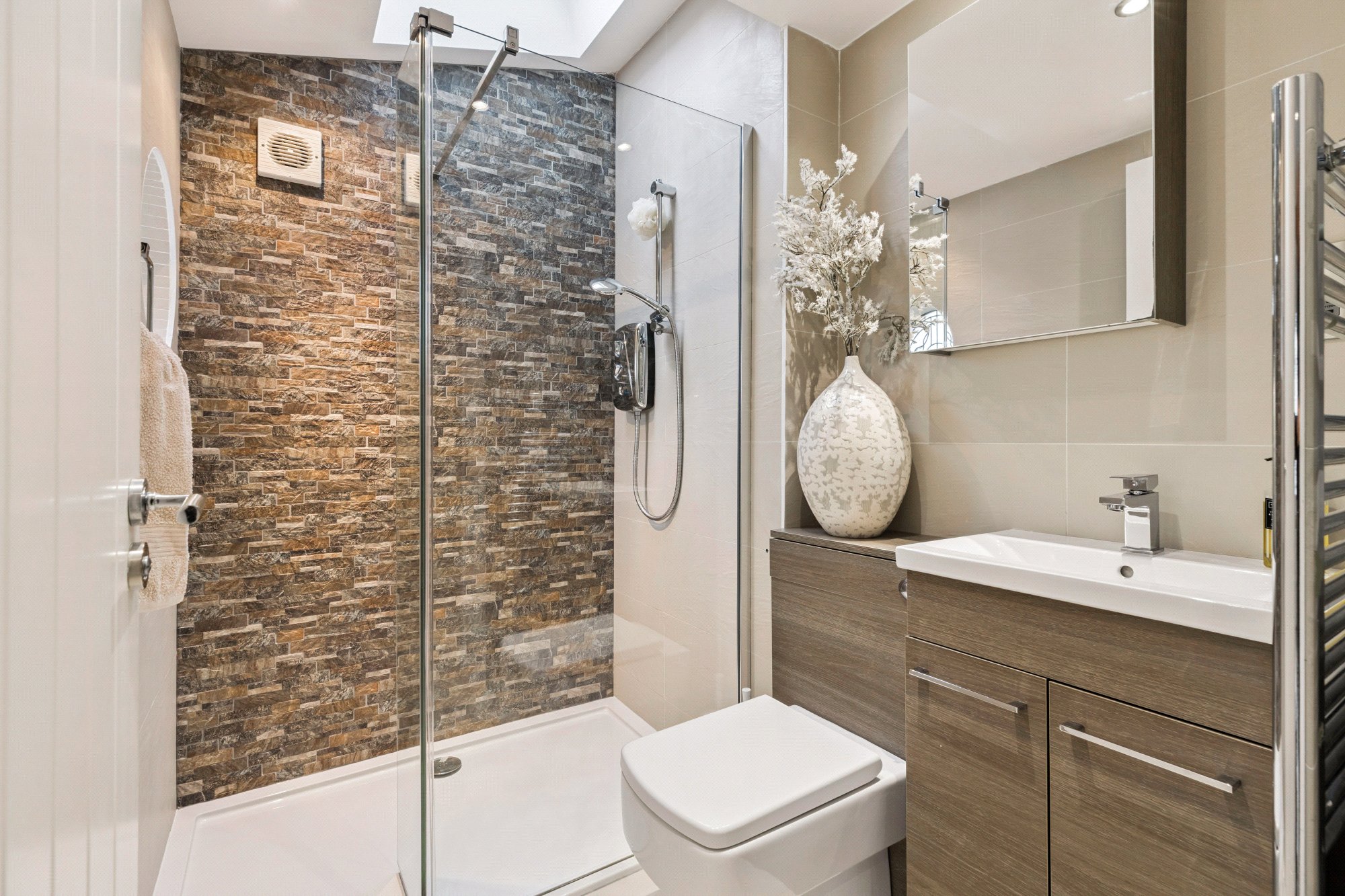 - piece family bathroom with over bath shower and chrome heated towel rail.