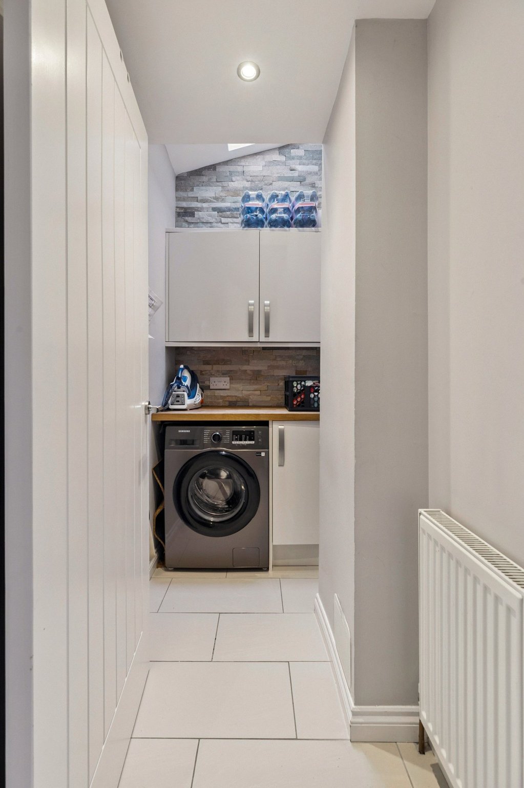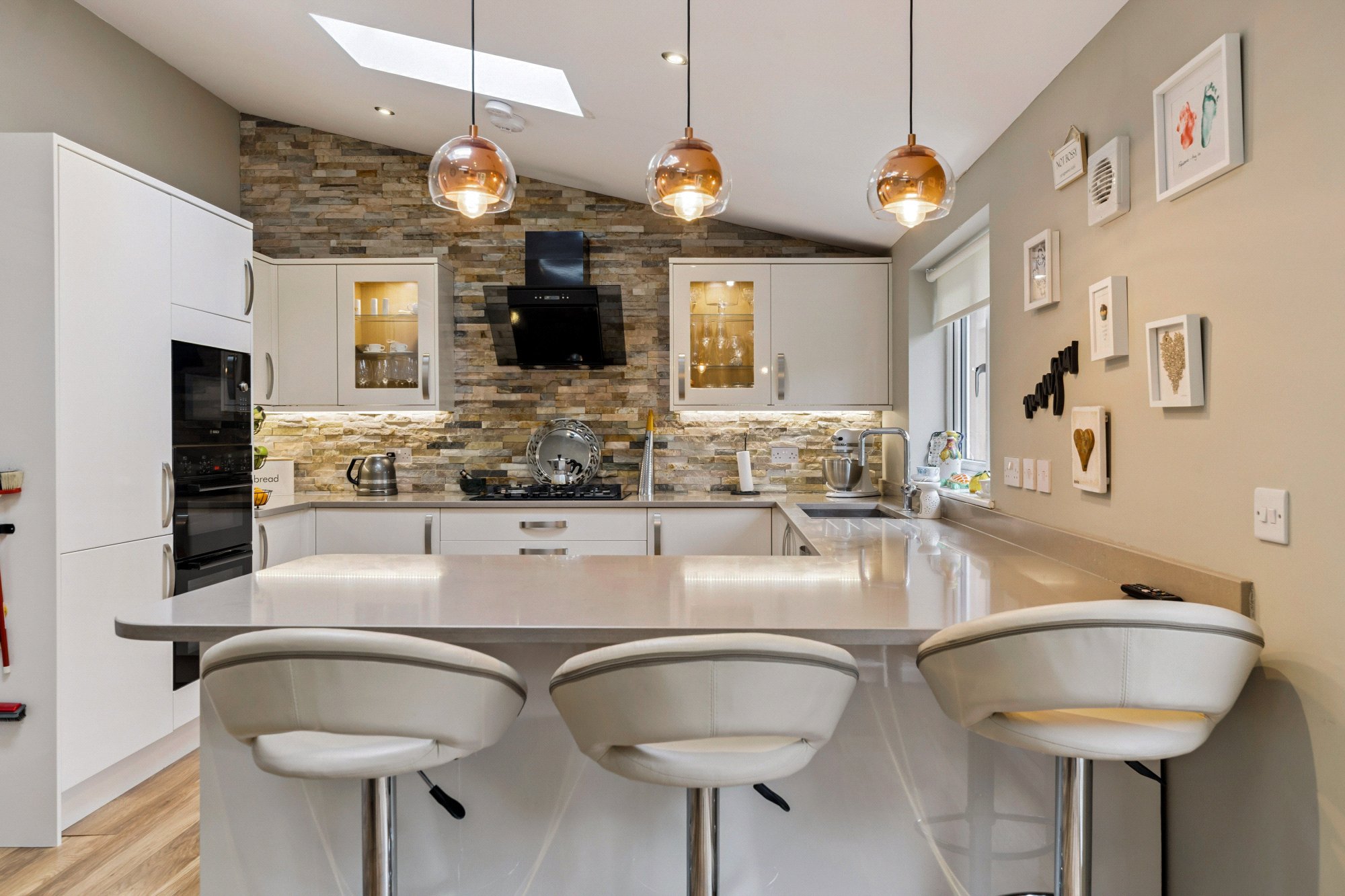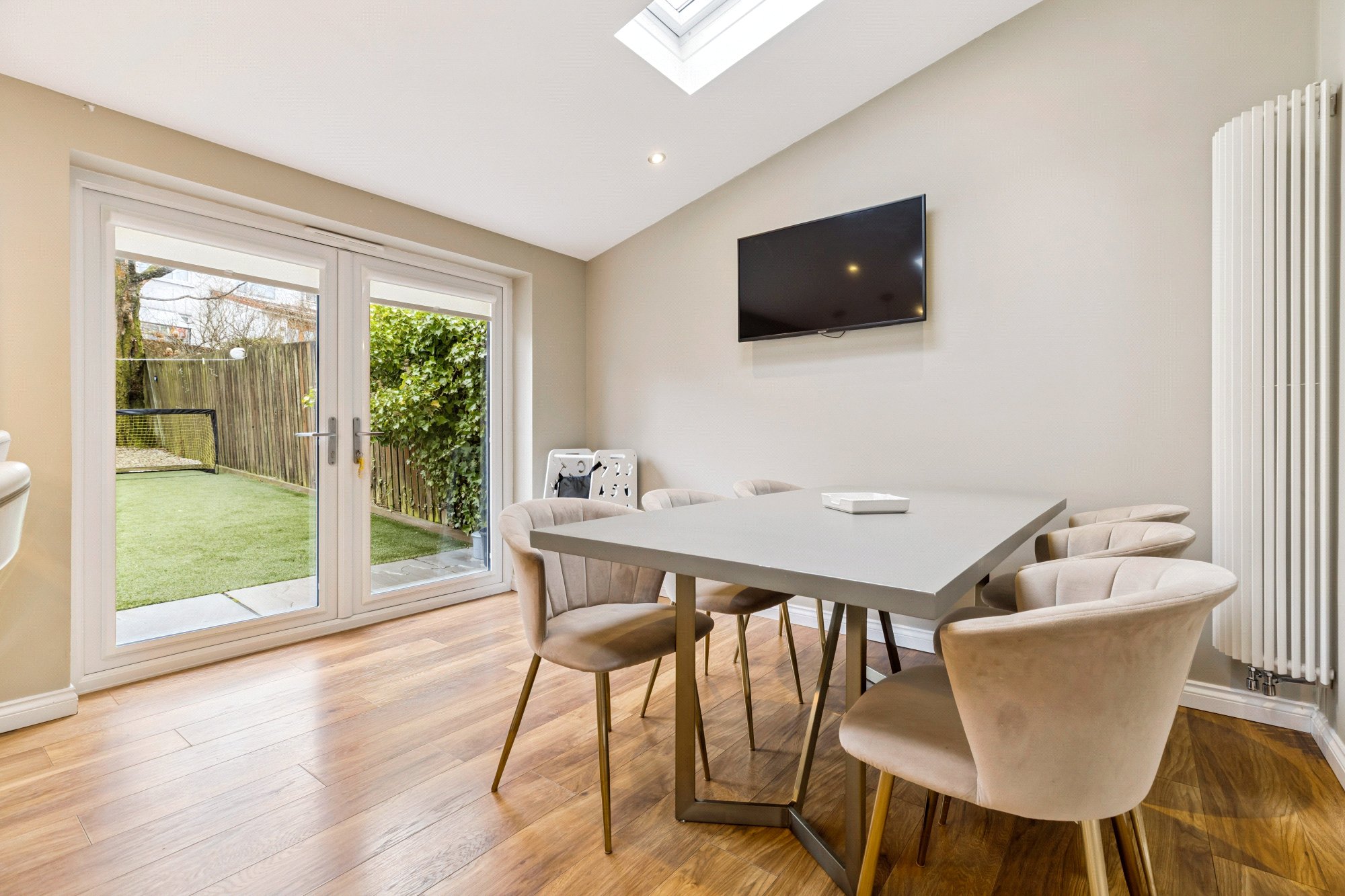 - Amazing open plan dining kitchen (finished in sharp white units and butcherblock worktops) featuring a host of integrated appliances and feature wall tiling, with good natural light afforded by an attractive Velux window formation. French doors to the rear garden.