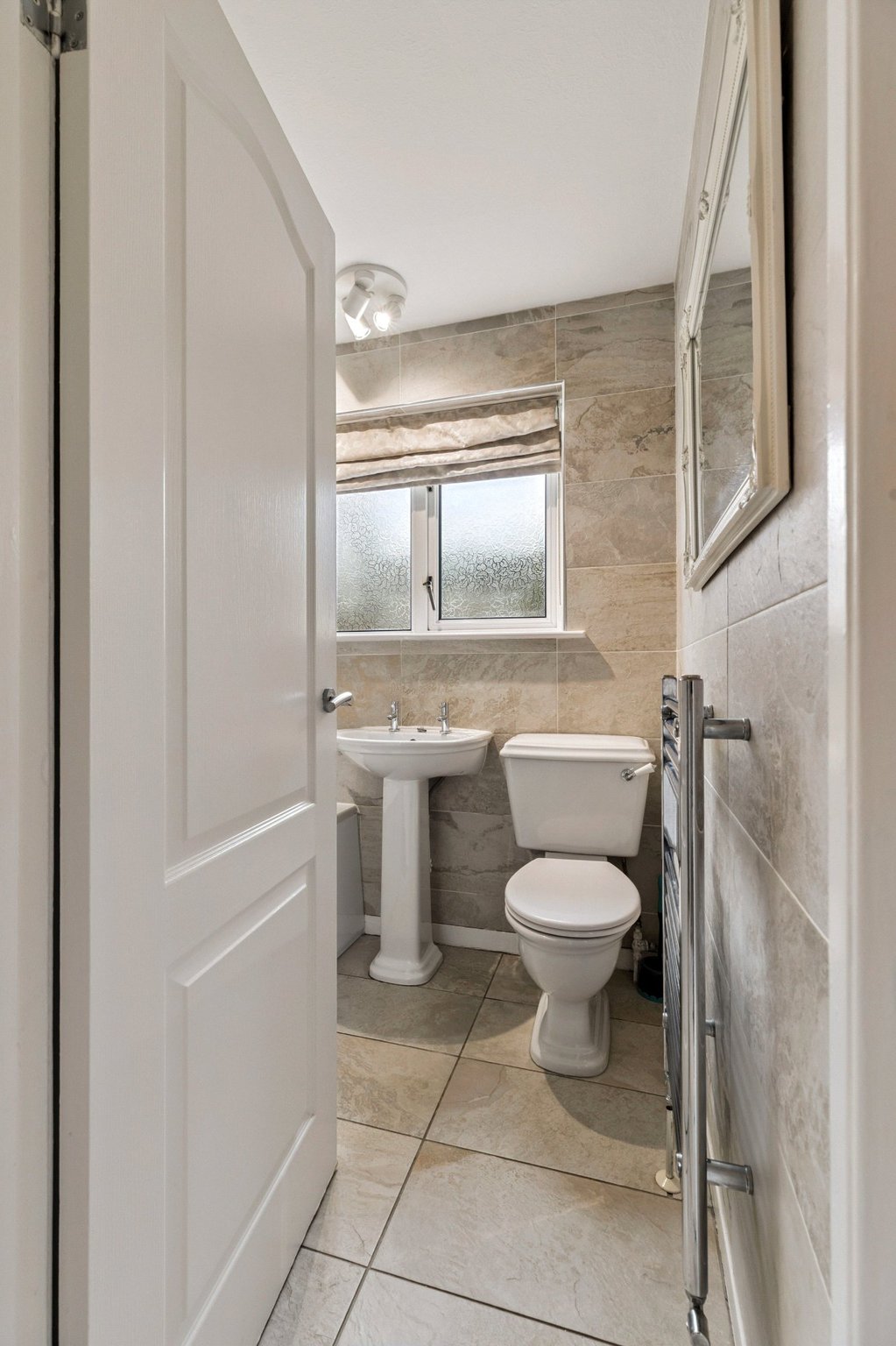 The fully enclosed rear garden features areas of timber decking and stone chips, whilst a nice backdrop of mature greenery provides a private and secure feel. Off street parking is afforded by a monobloc driveway.