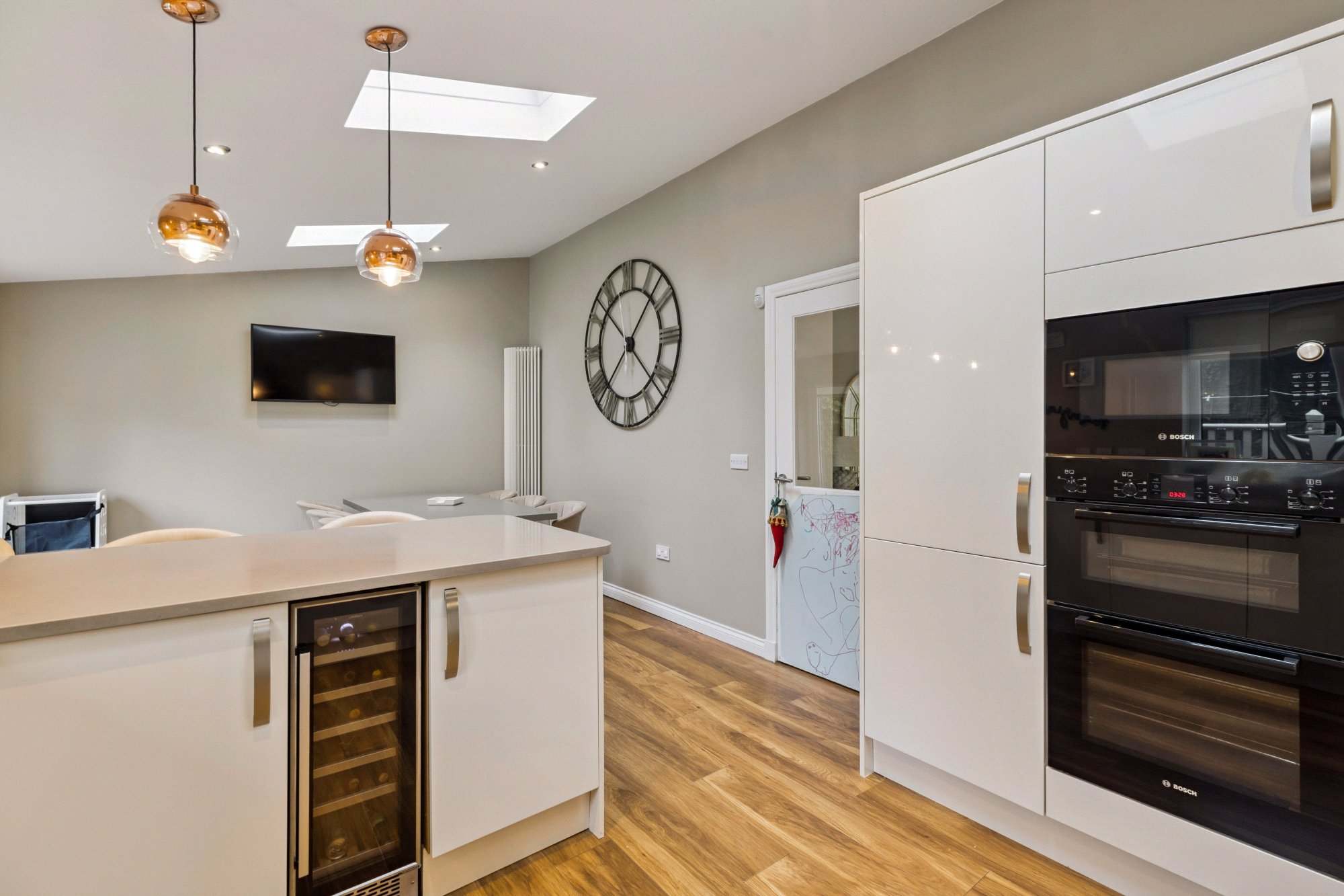 Enjoying a quiet position of high convenience within Bearsden’s popular Burnbrae district, this immaculate semi-detached villa has been successfully extended to the side and rear to create an adaptable family home with a brilliant open plan dining kitchen – the heart of the home. The property, with two double bedrooms and a staircase to a floored and lined attic (currently utilised for ancillary bedroom purposes), falls within catchment for the excellent facilities of Mosshead Primary and Bearsden Academy, with the latter consistently placing in the top 10 performing secondary schools across Scotland.