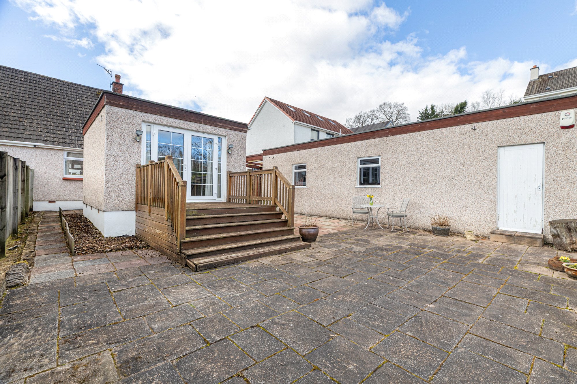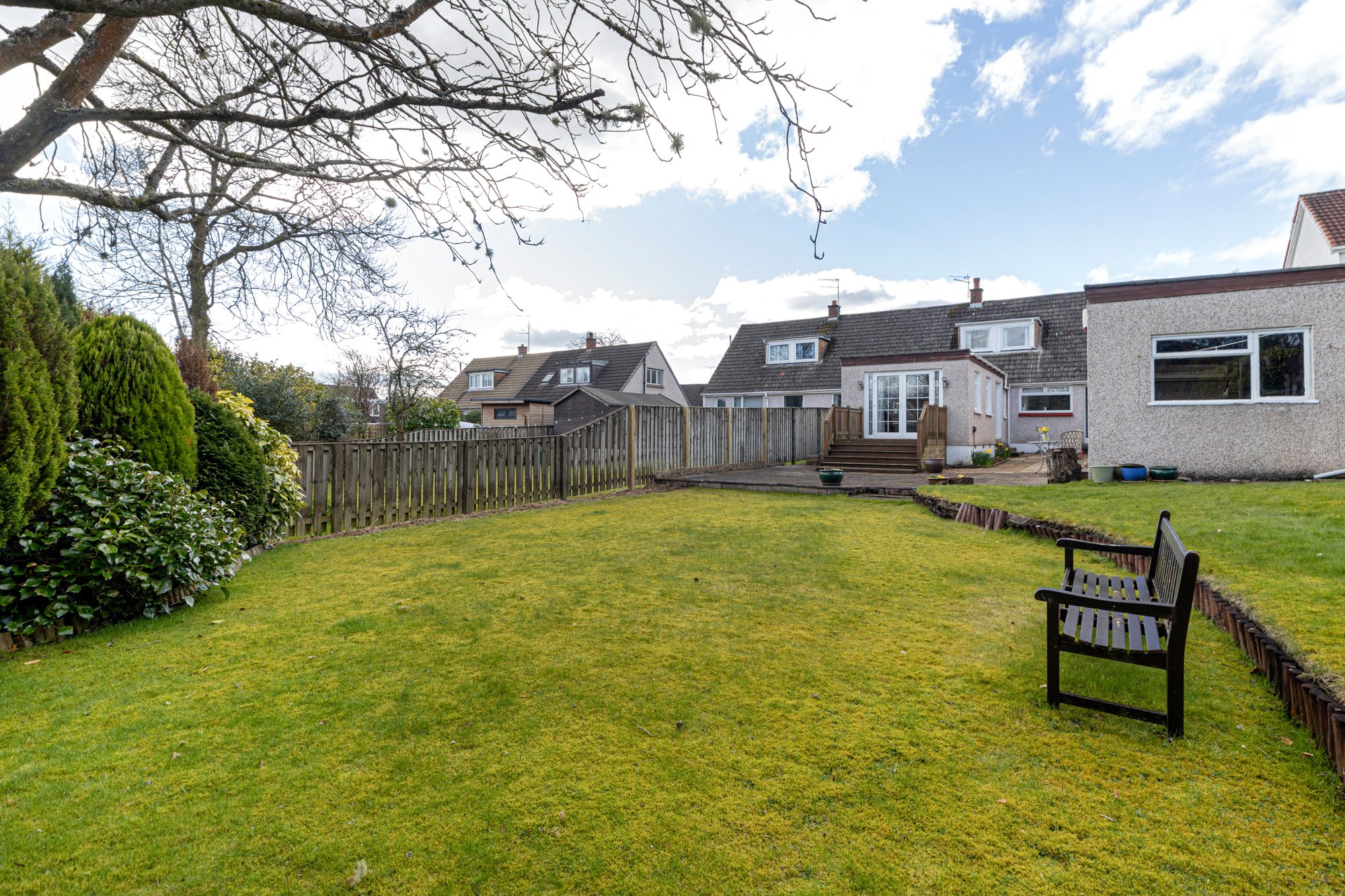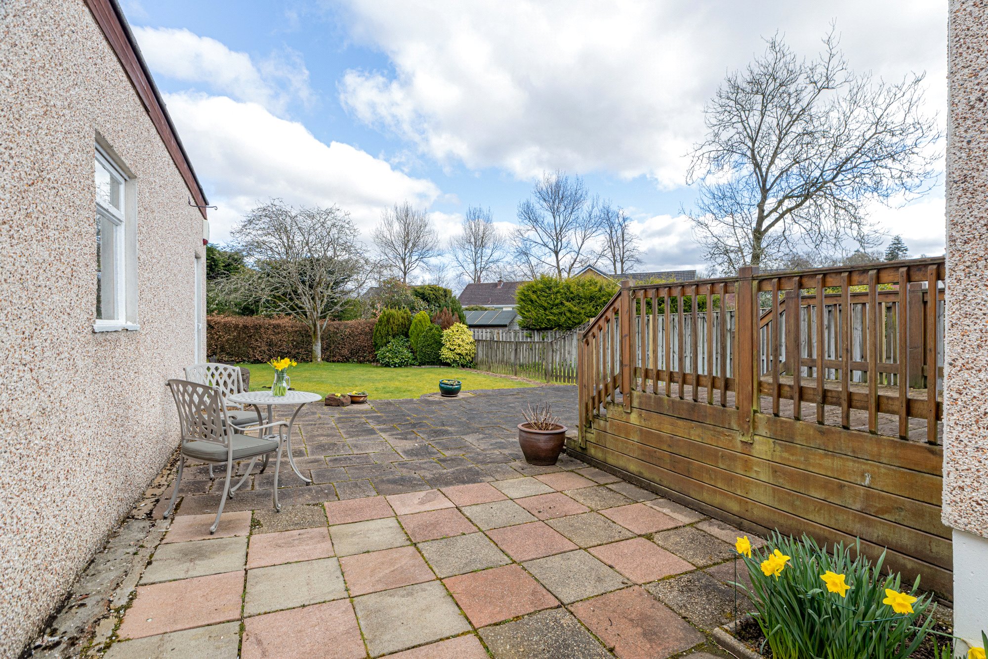 The garden is of a surprisingly good size, for this type of property, and is long and fairly broad. The majority lies to the rear where it is bordered by wall, fencing, and hedging. It lies mainly to grass and with a large slab patio area. A sun deck is accessed via the French doors in the dining/living room. The front garden is more compact and again lies to grass.