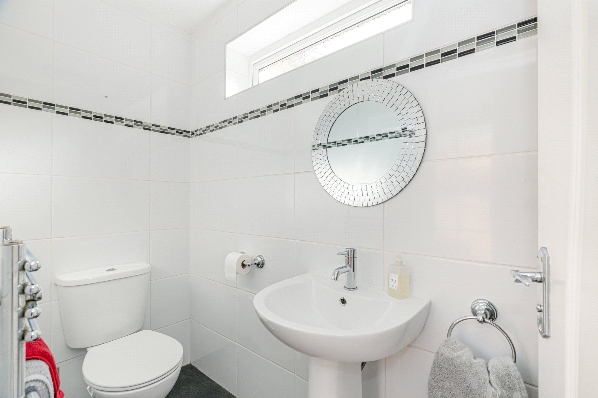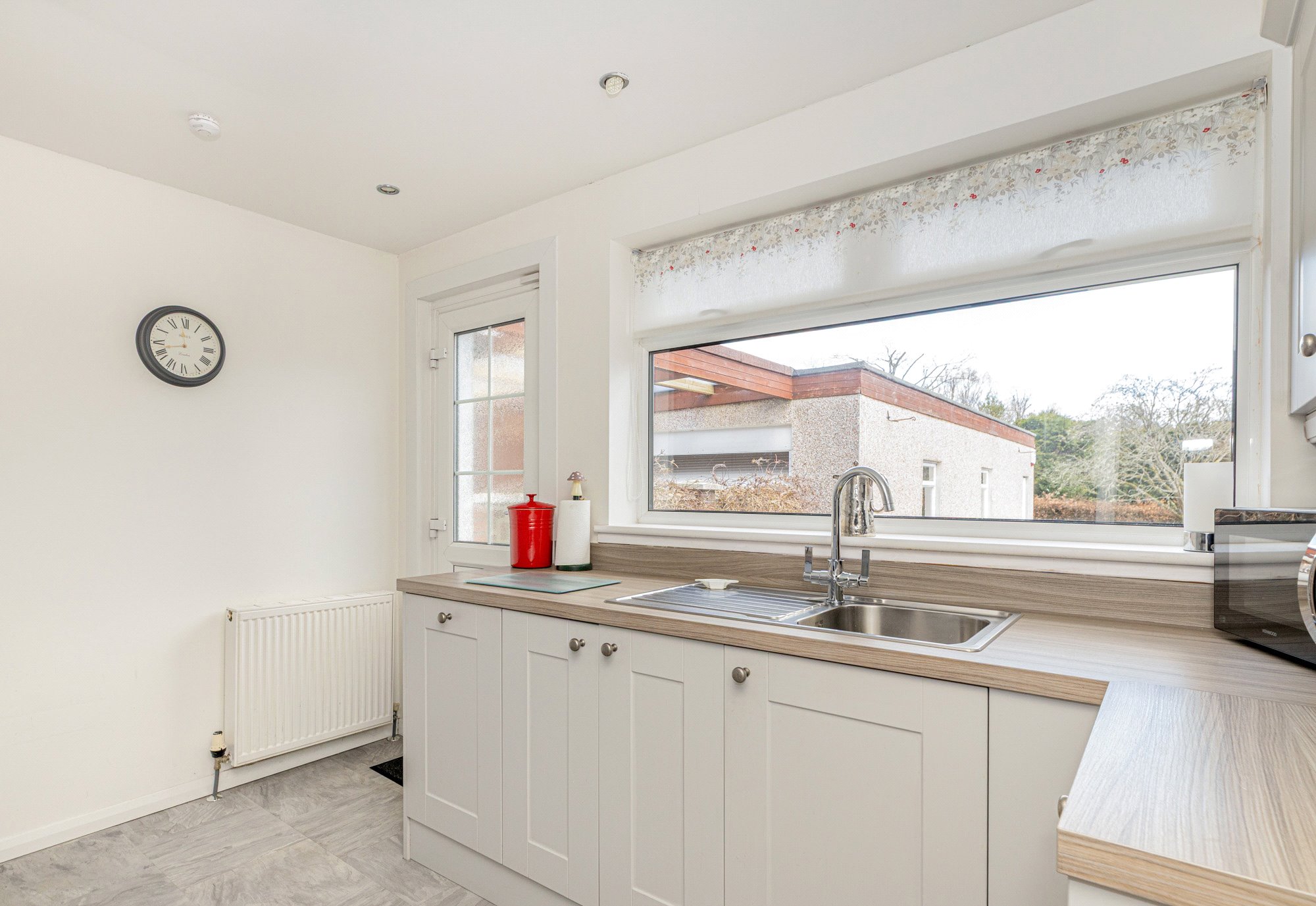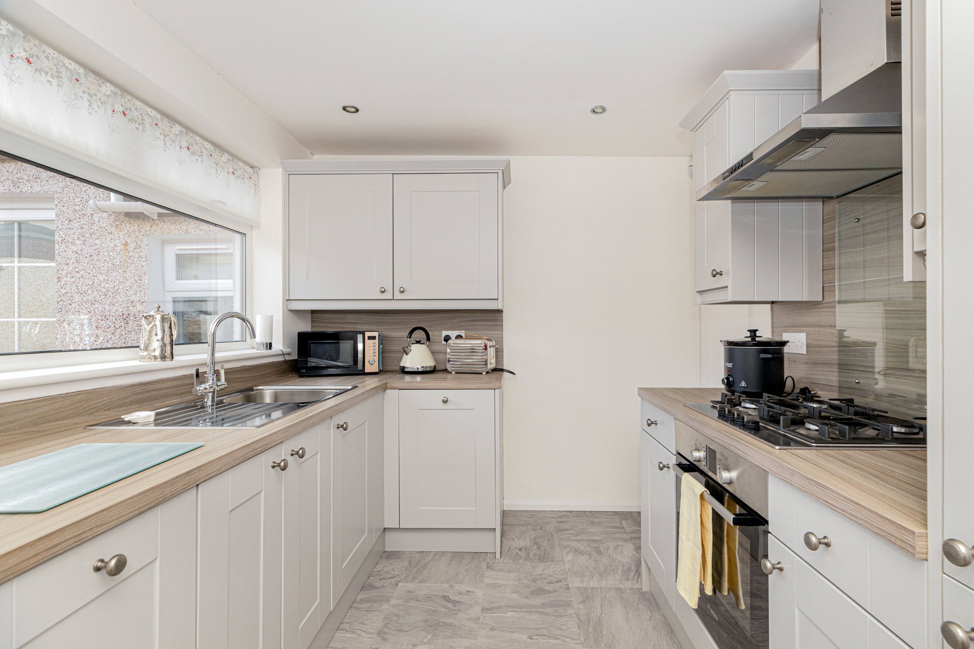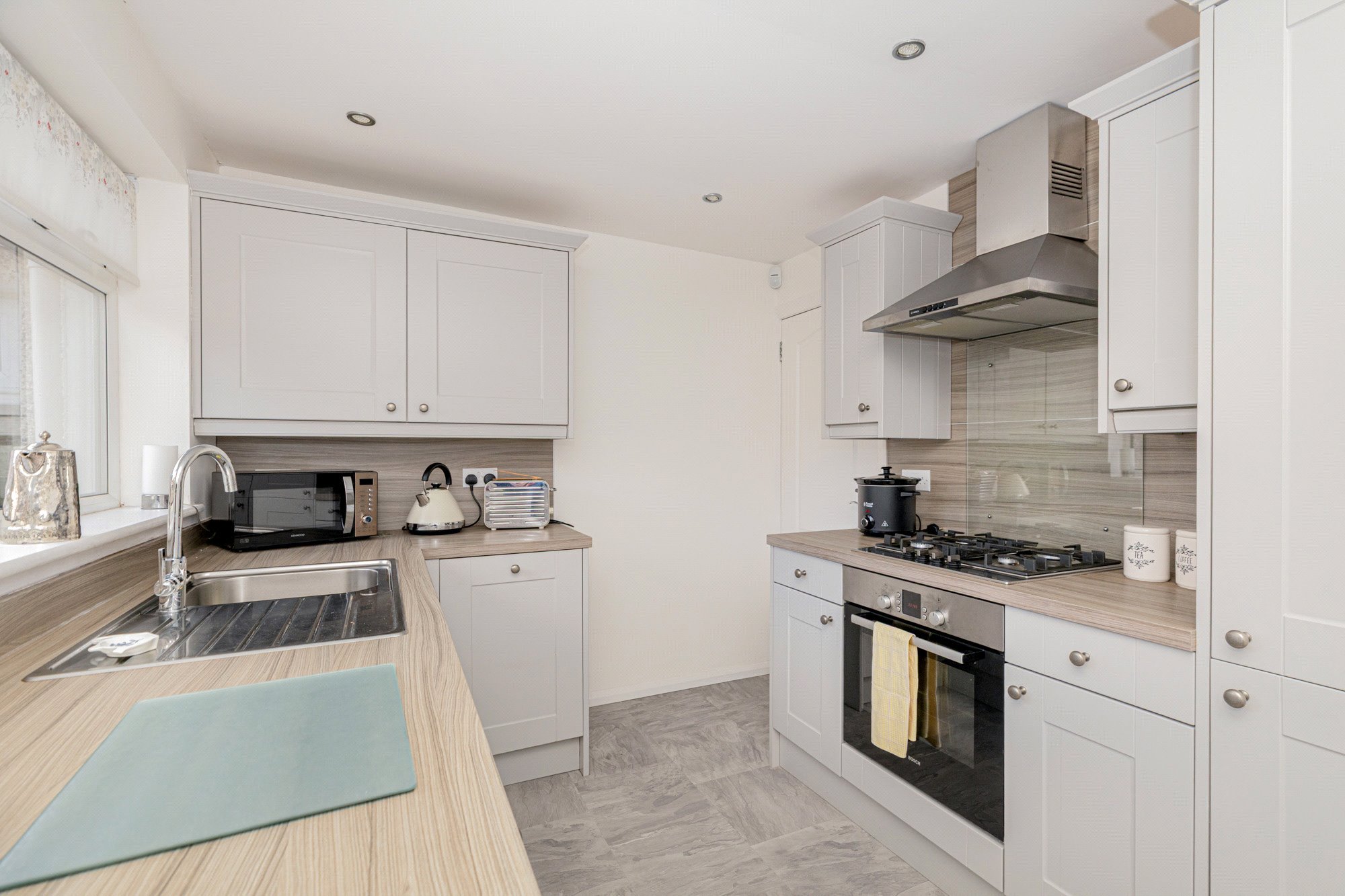 The subjects are very nicely presented with walls in neutral white and all carpets in a light brown self-colour, the bathroom and shower room fully tiled. The Wren kitchen was installed by our client and features pale grey coloured Shaker units with grey oak style laminate worktops and matching wall panels. Integrated appliances include-stainless steel 4-burner gas hob, oven, cooker hood, dishwasher, fridge-freezer, free standing washing machine. The bathroom and shower room both have white suites and both feature chrome towel radiators.