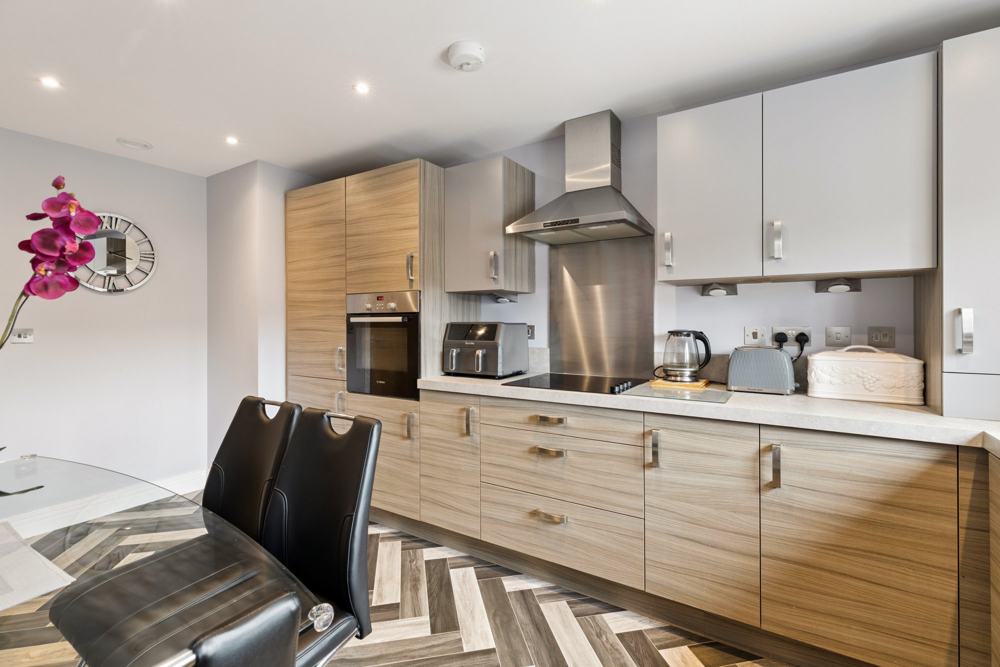The spec includes: an efficient gas central heating system with combination boiler operating through radiators (chrome towel rails in the bedroom and en suite) with thermostatic valves (plus central controller); white uPVC double glazed windows and French doors, including almost to floor windows in bedrooms 1 and 2; Oak veneer internal doors with contemporary ironmongery; Laufen sanitary ware and a powerful “Vado” thermostatic shower in an oversized shower enclosure to the main bedroom en suite; an extremely smart kitchen with ash style units and integrated kitchen appliances, all by Bosch except the Hotpoint halogen hob; LED ceiling lights to the kitchen, bathroom and en suite; a security controlled door entry phone system; quality floorcoverings throughout.