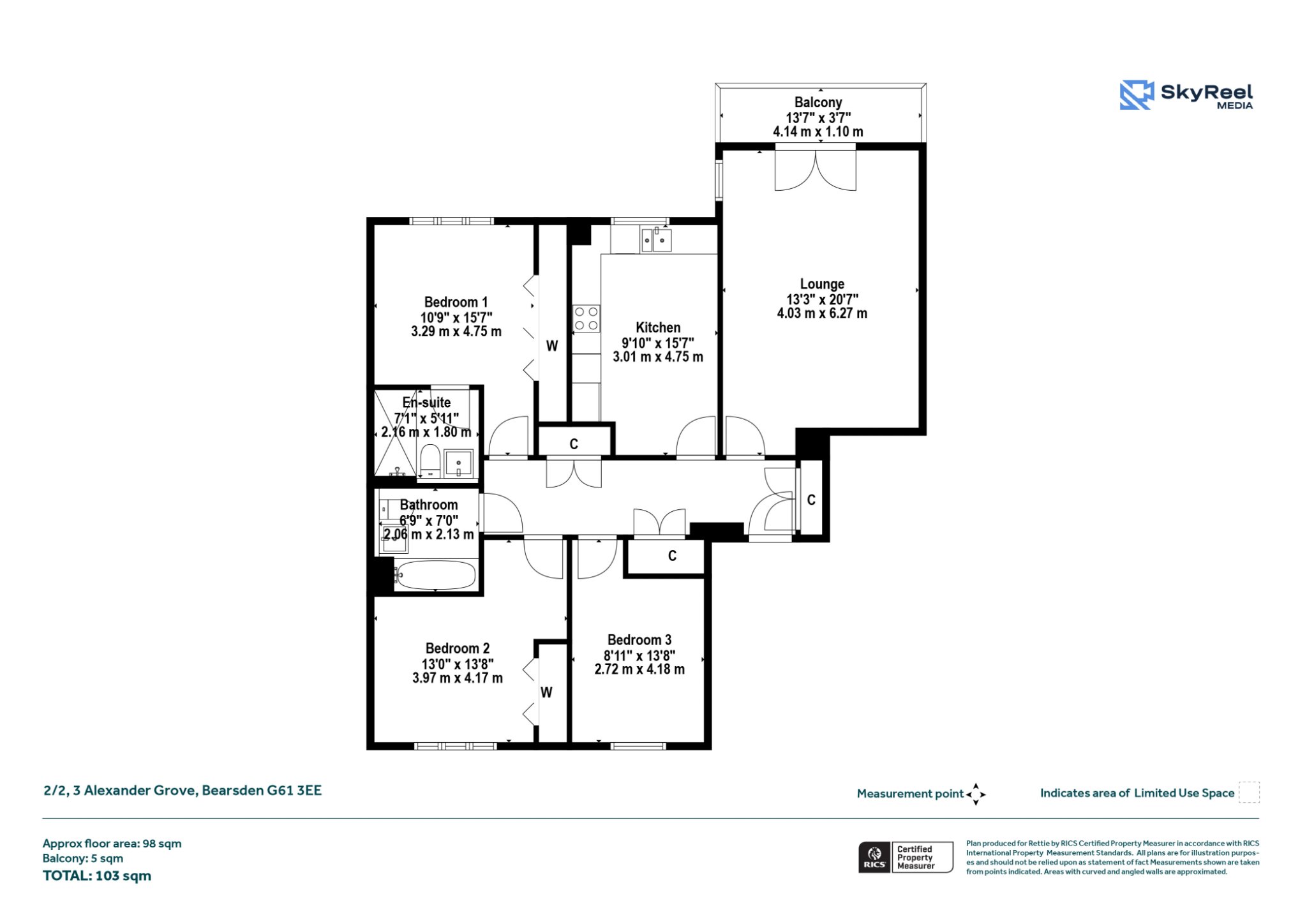Comprising; Residents entrance hall with both stair and lift access. Spacious hall with three double width cupboards. Lounge with dining space. Balcony. Kitchen with space for breakfast table and chairs. Three double bedrooms (beds 1 and 2 having smart fitted wardrobe provision). Bathroom. En suite shower room.