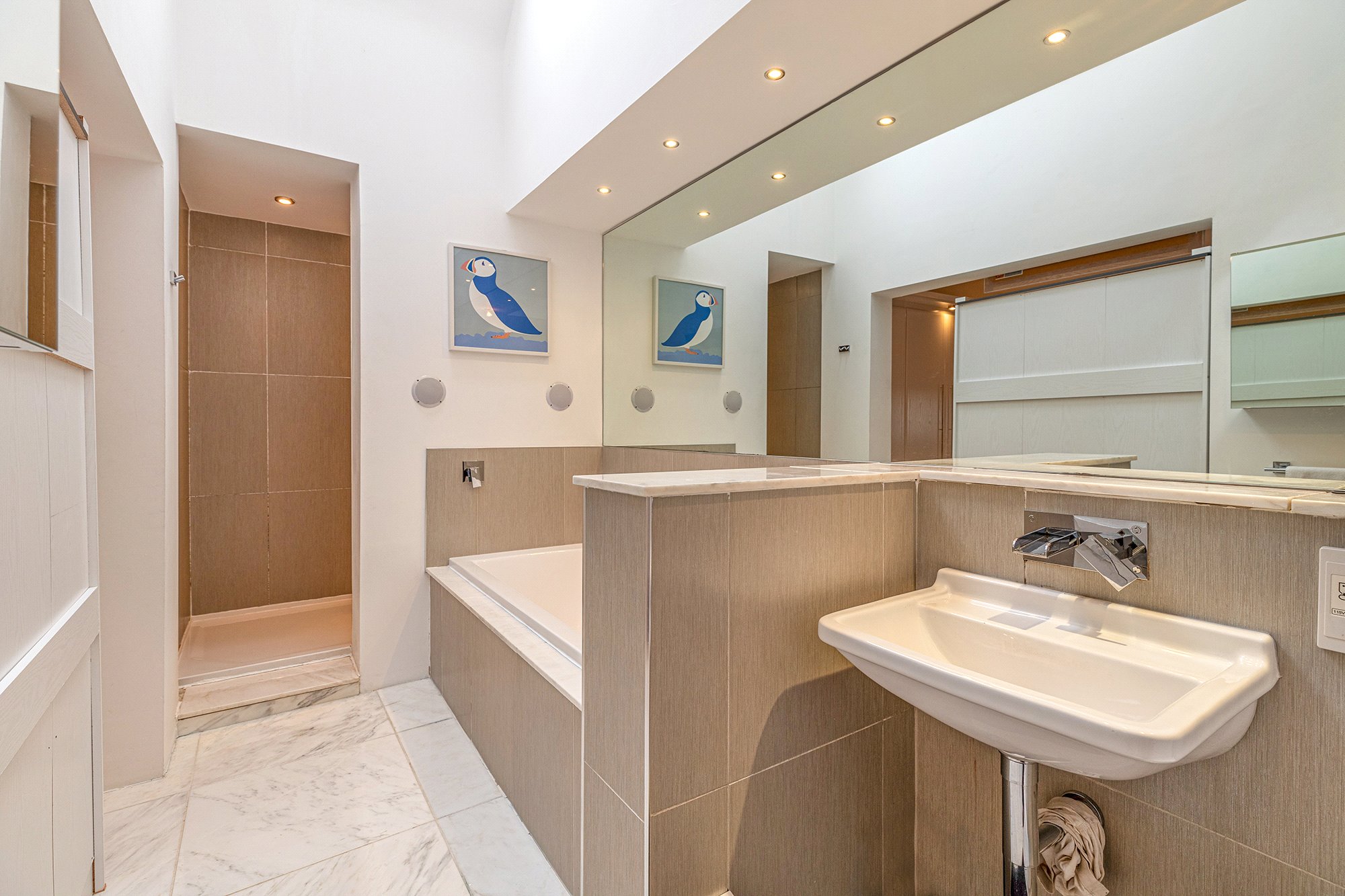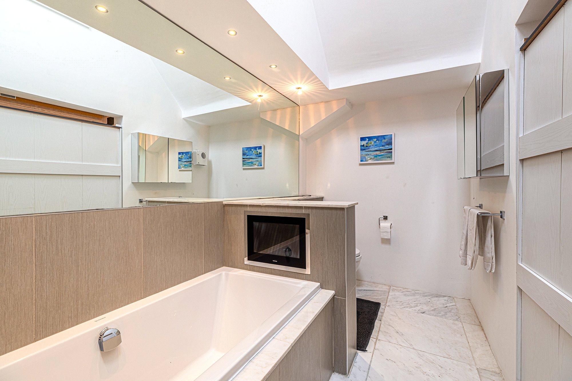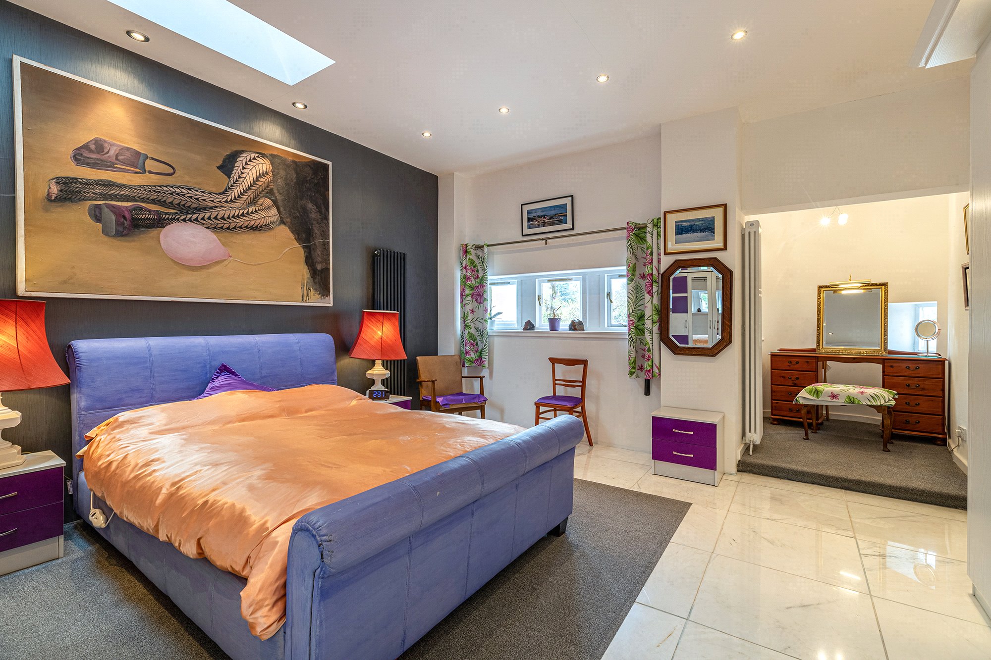 There are a four steps down from the lounge leading to a landing with staircase and attractive feature windows. The very impressive and substantial master suite can be found on this level. This entirely luxurious area offers a dressing space, substantial bedroom and en-suite bathroom with walk in shower, w/c, wash hand basin, and bath with an integrated television and surrounding speakers.