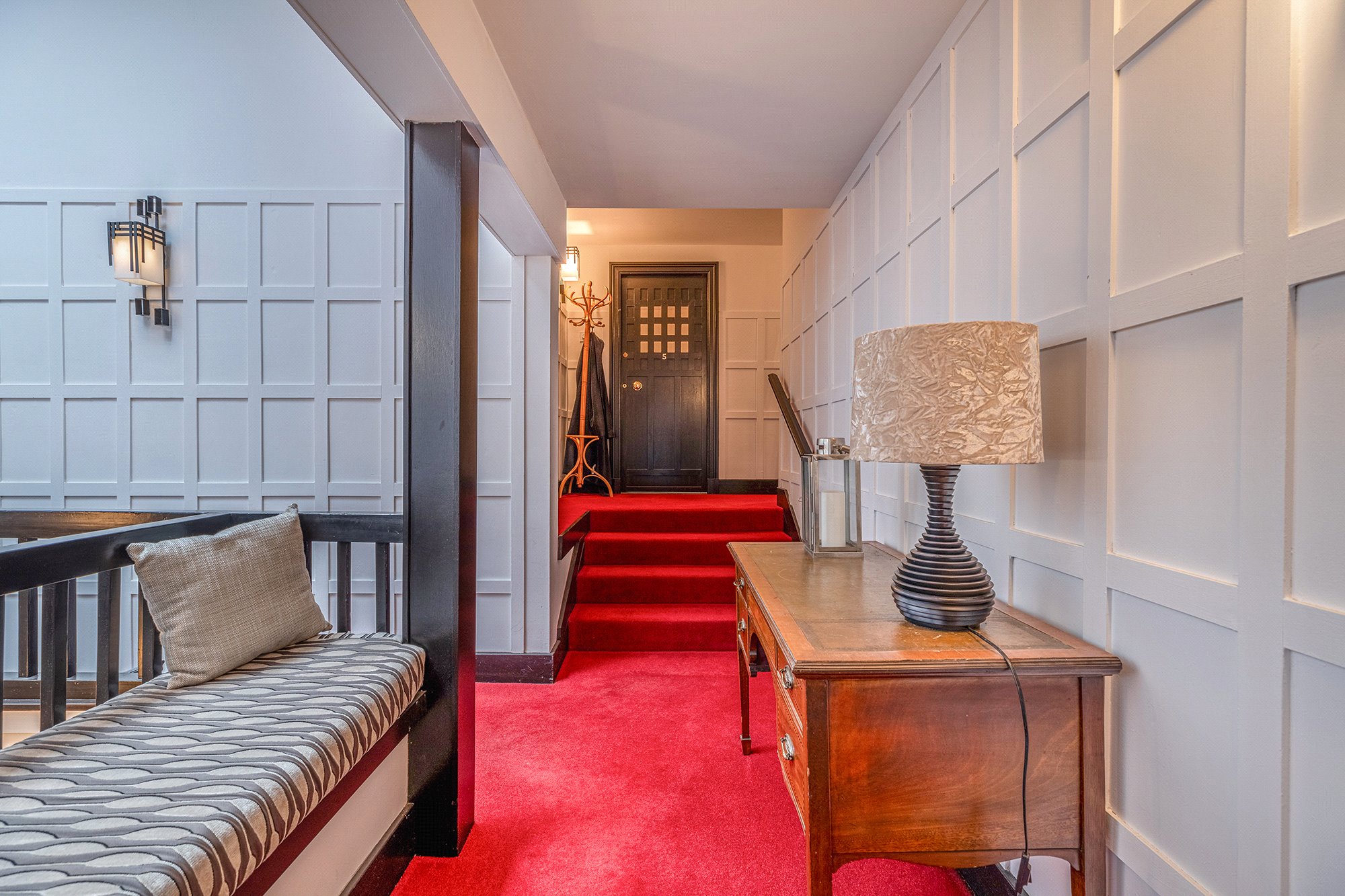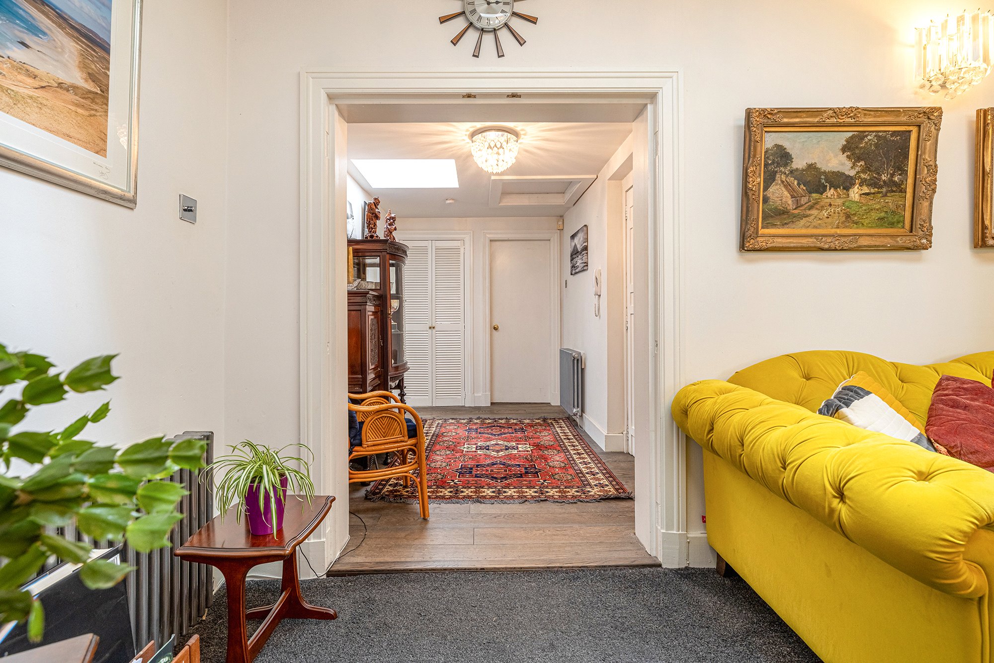 Access to the building, granted via a security entry system, is through an incredibly imposing and grand turreted entryway which leads to a carpeted communal hallway decorated with Mackintosh style panelling. A staircase leads to the first floor where the main entrance to apartment 5 can be found. The internal accommodation of the home extends to:-