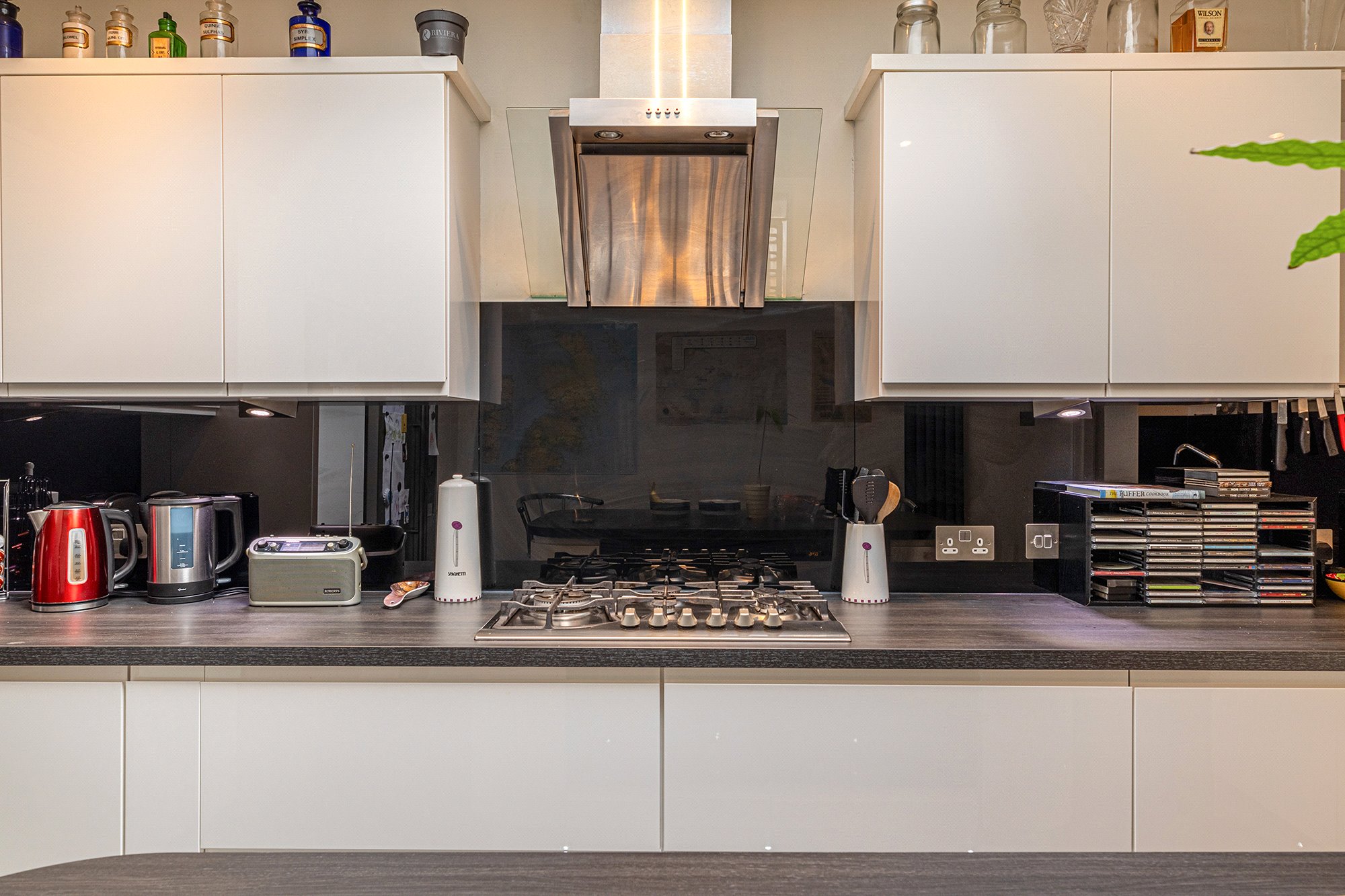Reception hallway, box room, lounge highlighted by skylights with feature living flame gas fireplace and step up to a dining area. There is a contemporary integrated kitchen finished with attractive white cabinetry, black worktops, black floor tiles with a central island/breakfast bar hosting a double grill/oven. In terms of further appliances there is a wine fridge, dishwasher, six burner gas hob, with a cavity provided for an American style fridge freezer.