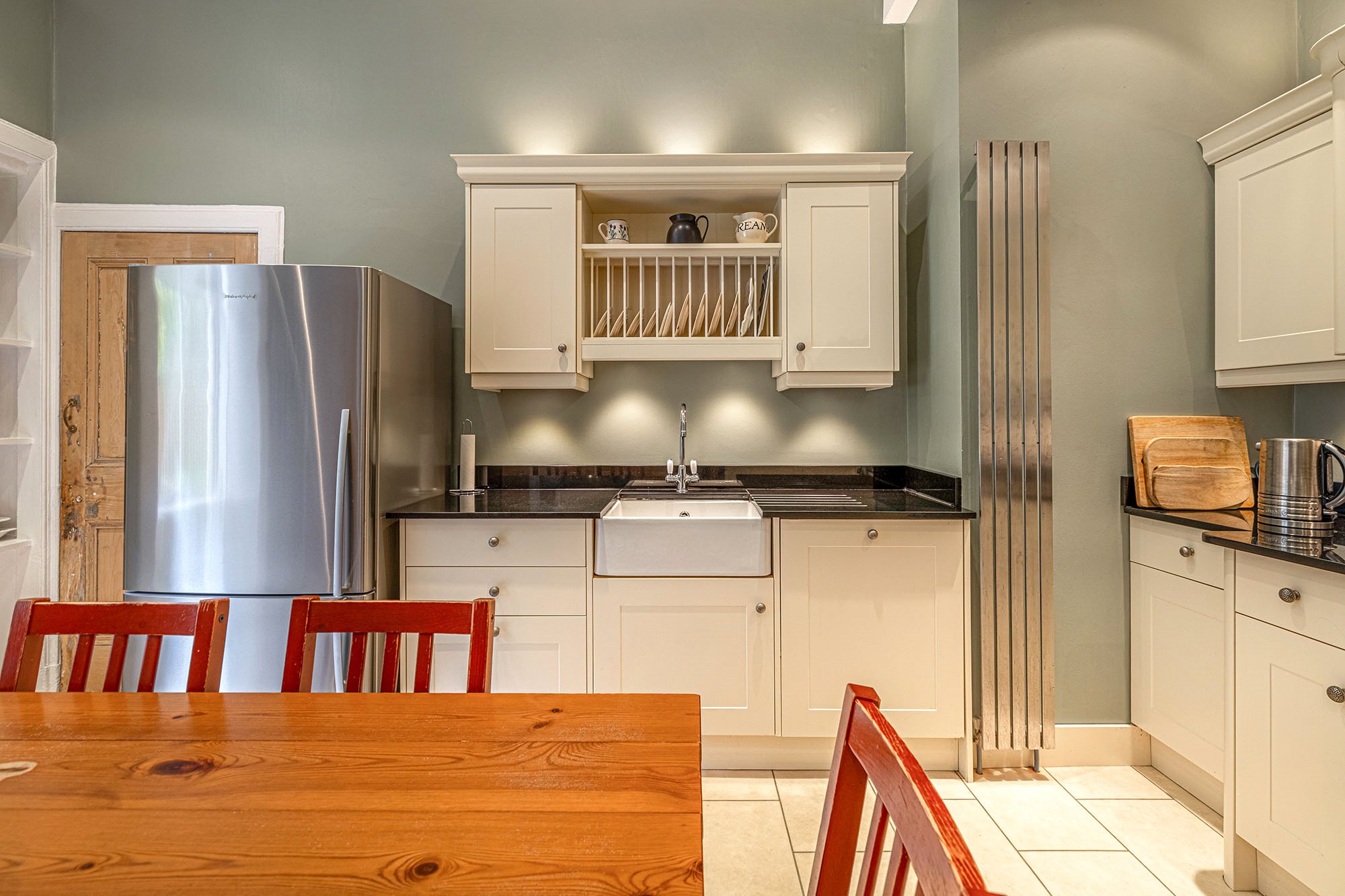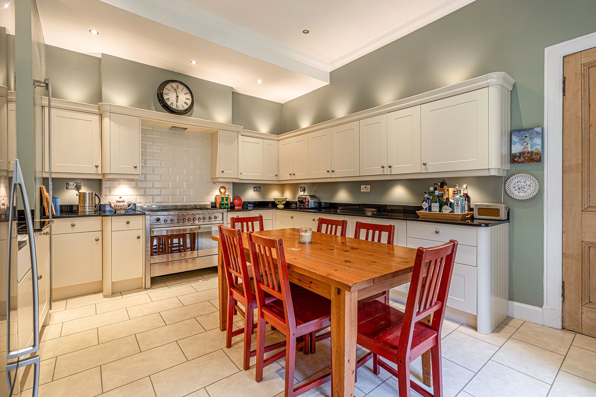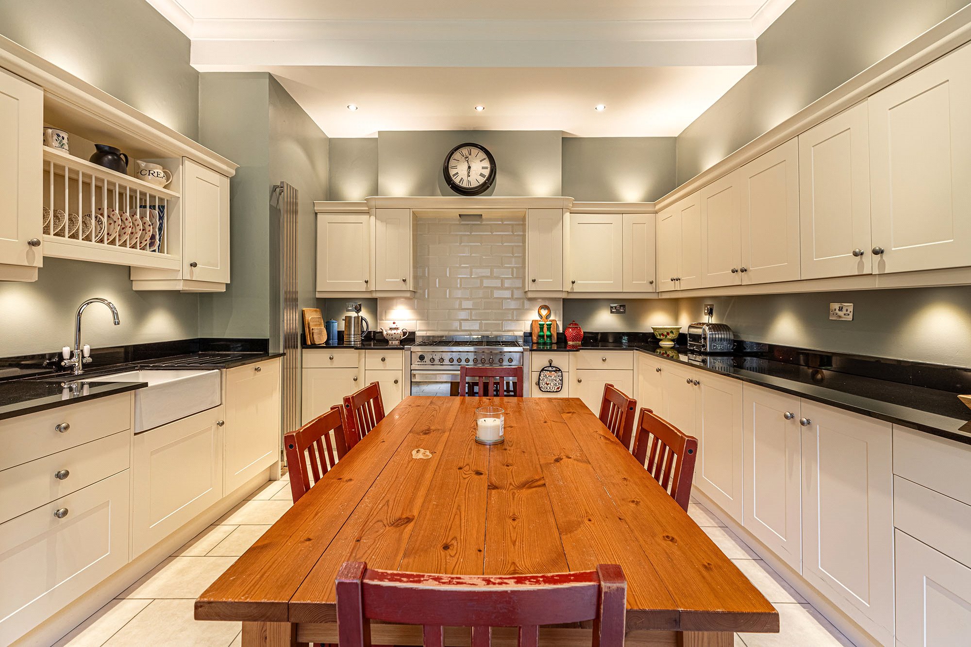 - Dining kitchen – Range style cooker, 6 burner hob, solid marble worktops, shaker style units, Belfast sink