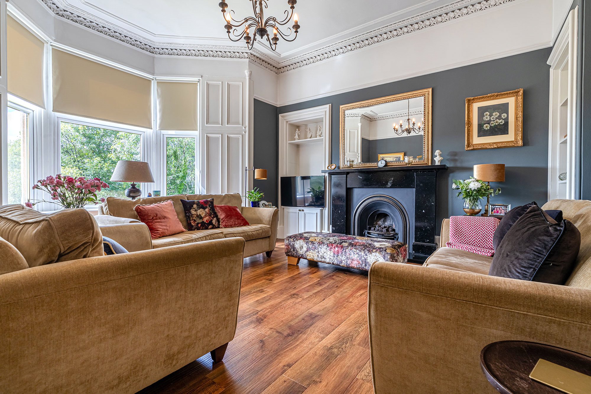 - Bay windowed lounge – beautiful period plasterwork (cornicing & ceiling rose), original recessed cabinetry, feature fireplace with granite surround
