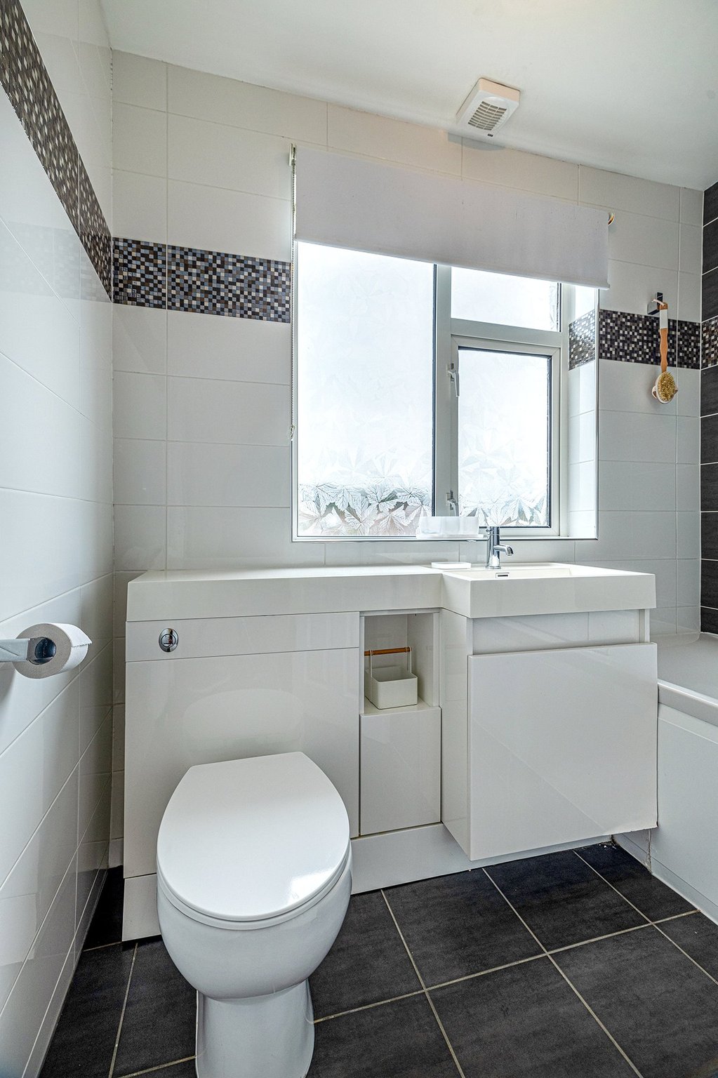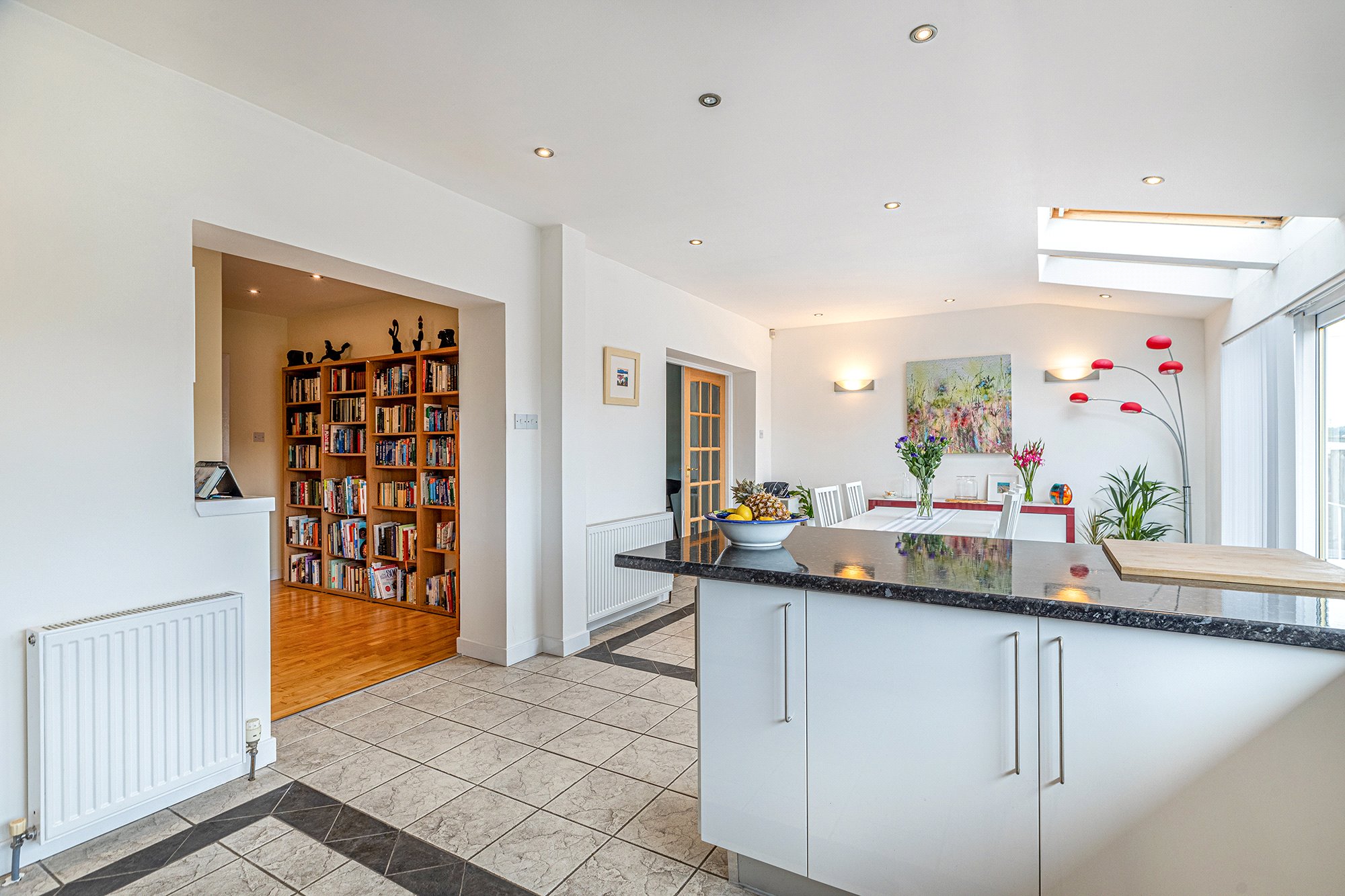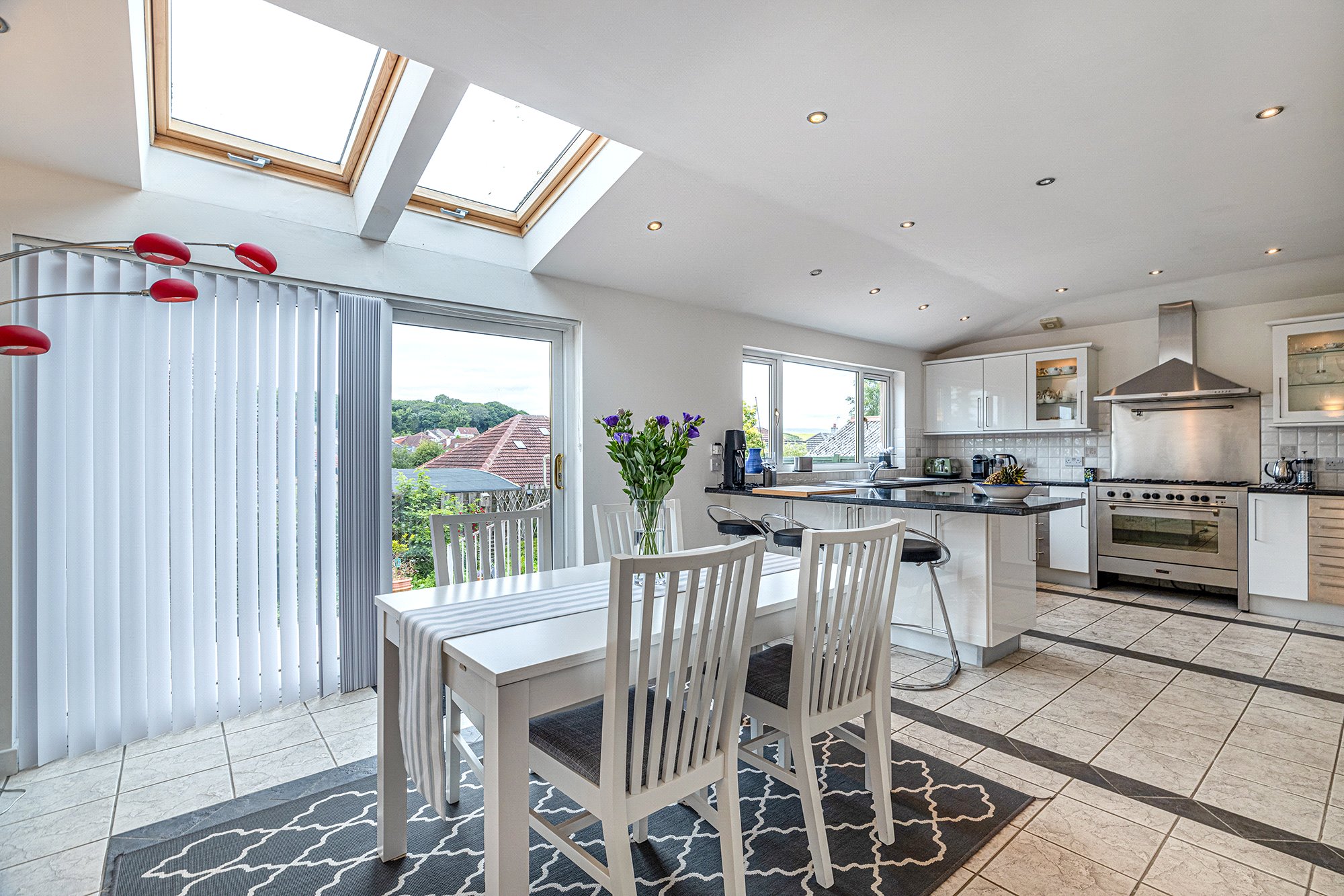 - Large dining kitchen – highlighted by Velux windows, breakfast bar area, sharp white cabinetry, selection of appliances inc. Range style cooker and matching hood