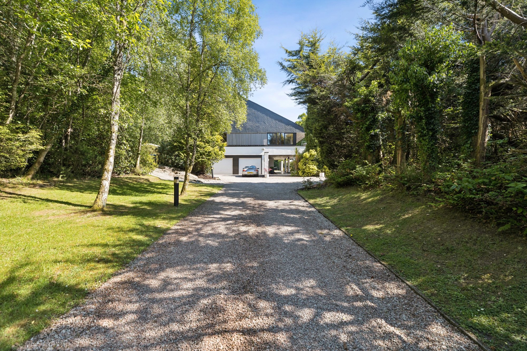 From Helensburgh, follow the A814 to Rhu. At the Marina, turn right onto Pier Road, continue uphill and turn right onto Station Road. Tigh Geal is located on the right-hand side, set back from the road and accessed via a long, tree-lined, driveway its discreet approach a quiet prelude to the stunning house that awaits.