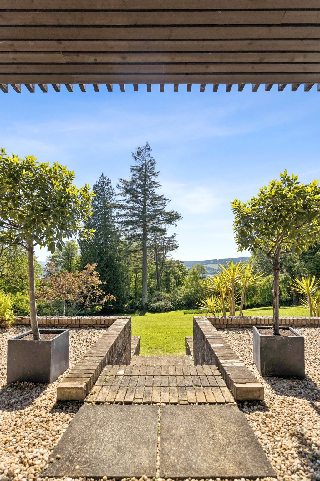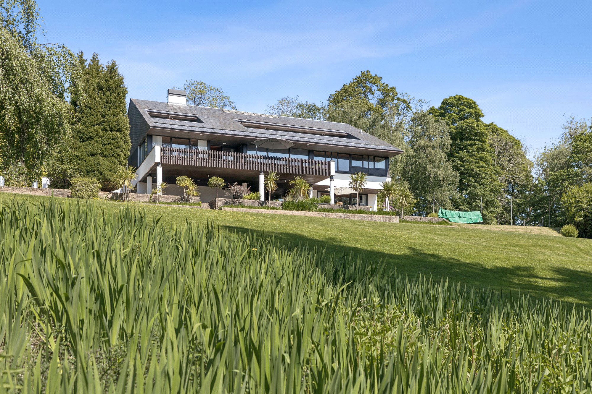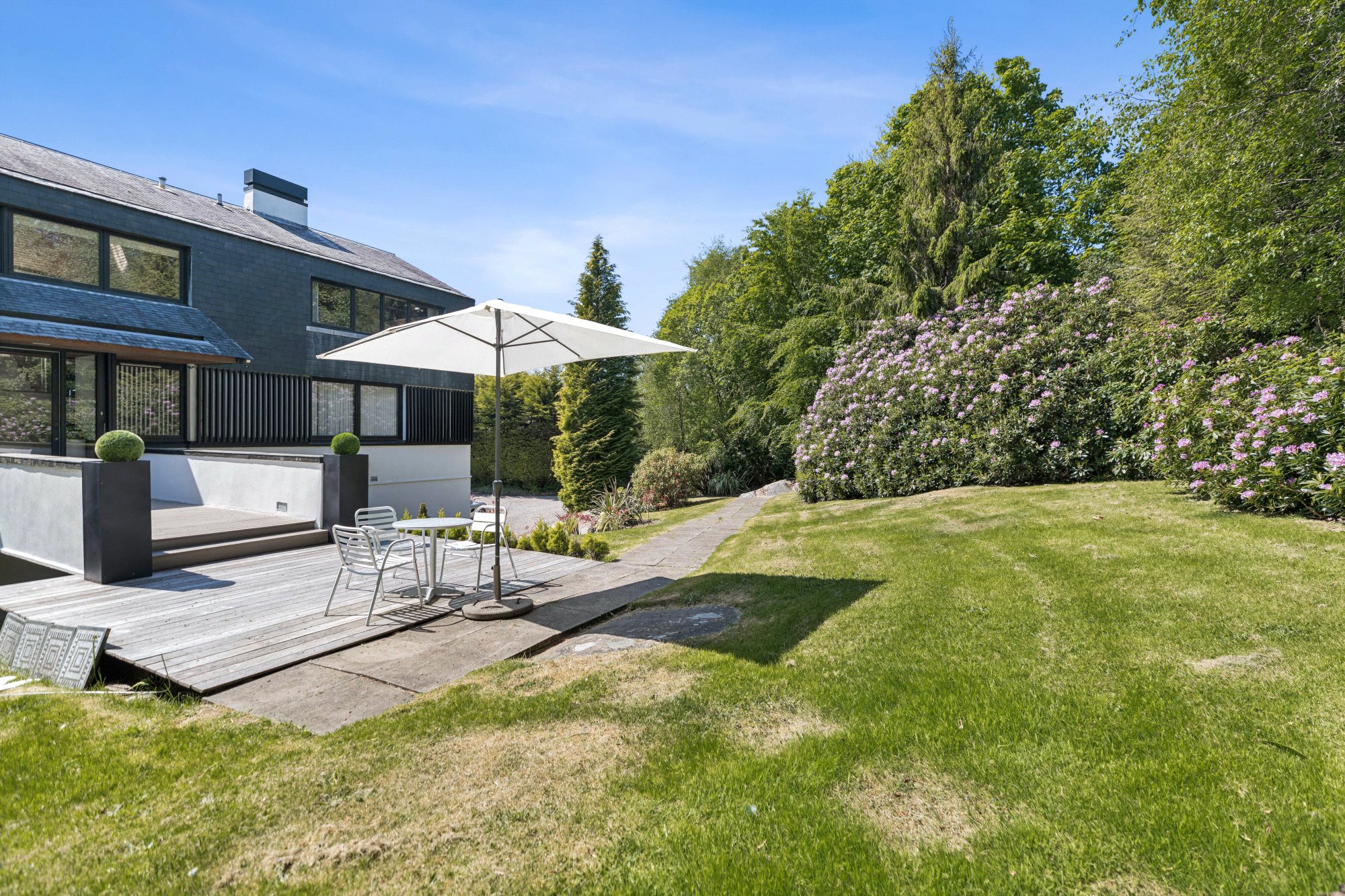 It is a a home of singular style and one of striking design, conceived from the advantages of its delightful private hillside setting, the adjoining countryside and woodlands, and the southwards views to the Gare Loch.