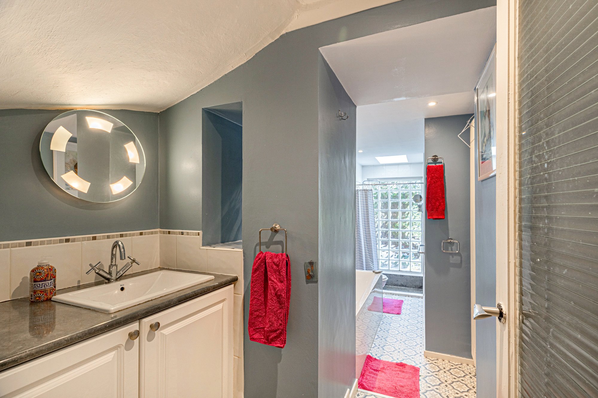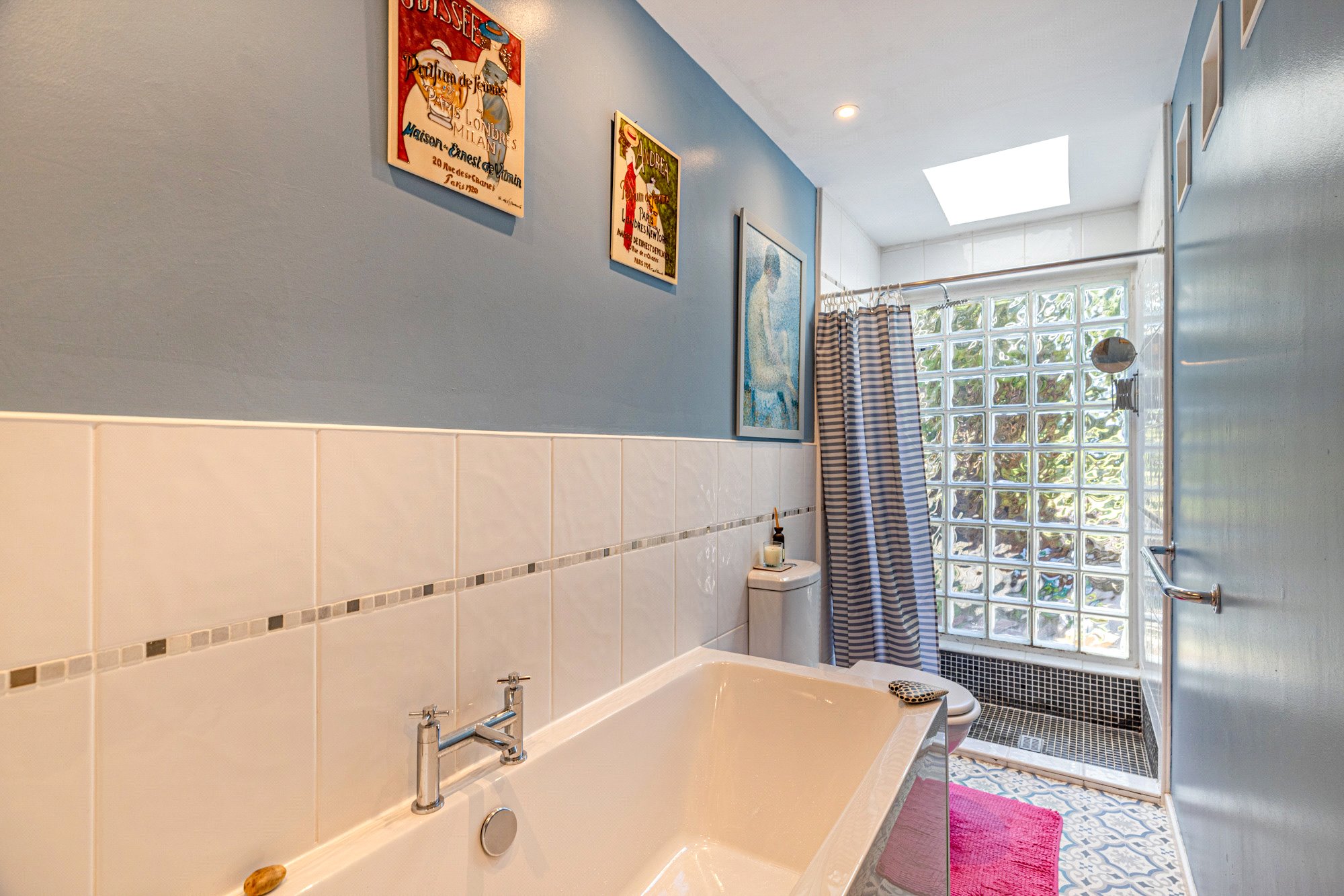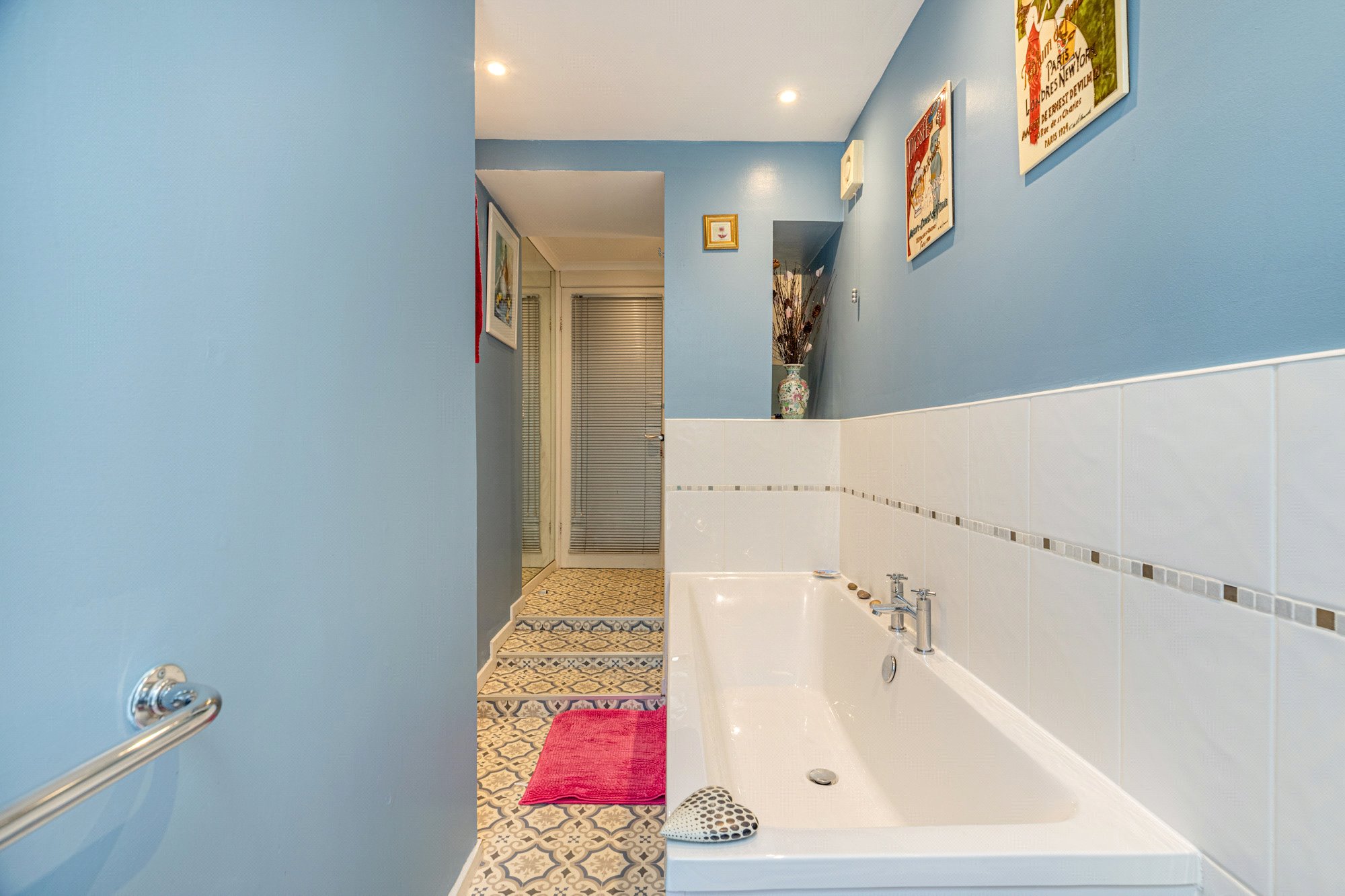 - Large family bathroom – vanity area with under sink cabinetry, large bath, walk in shower (deluge fitting – off mains system)