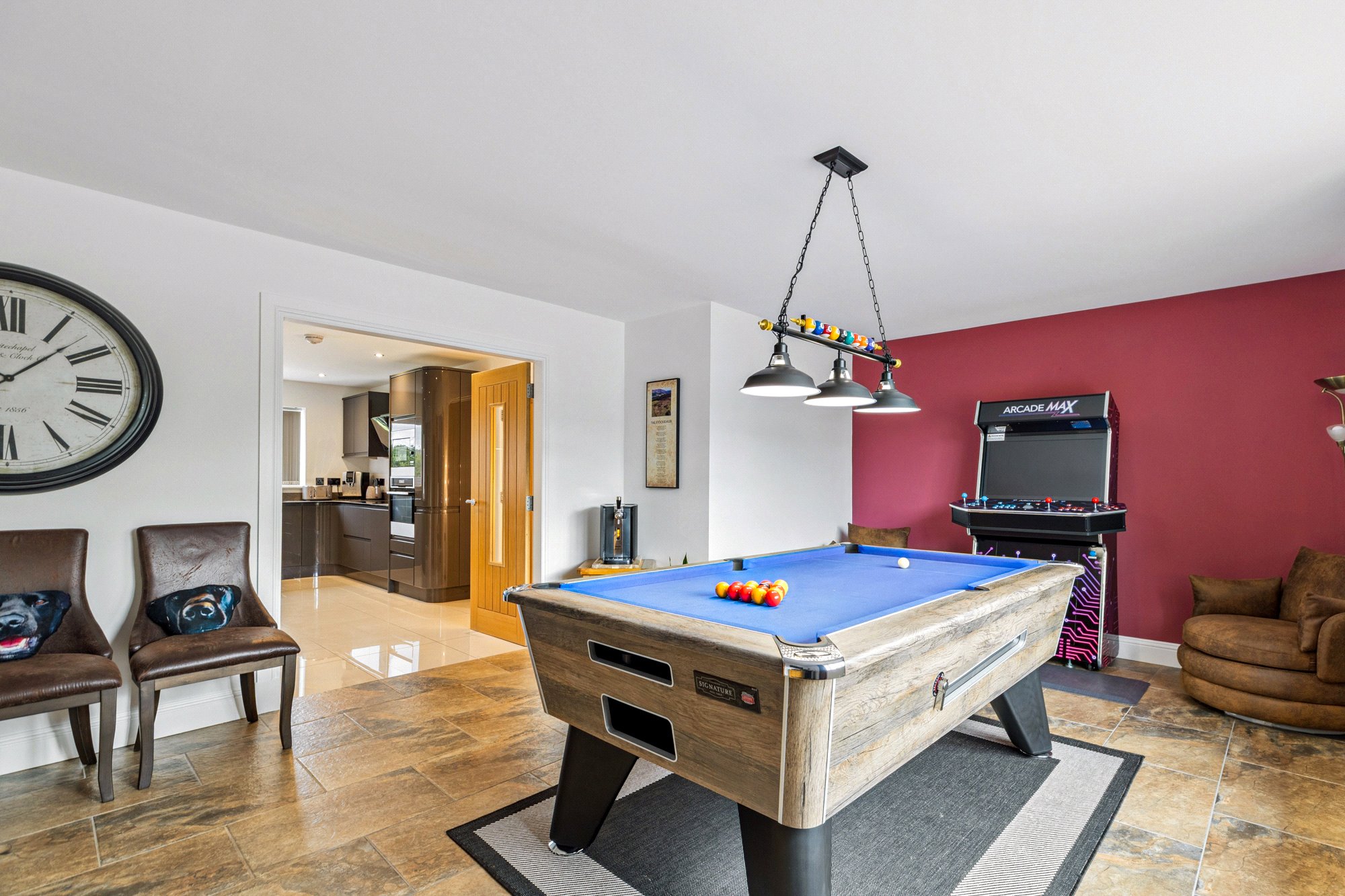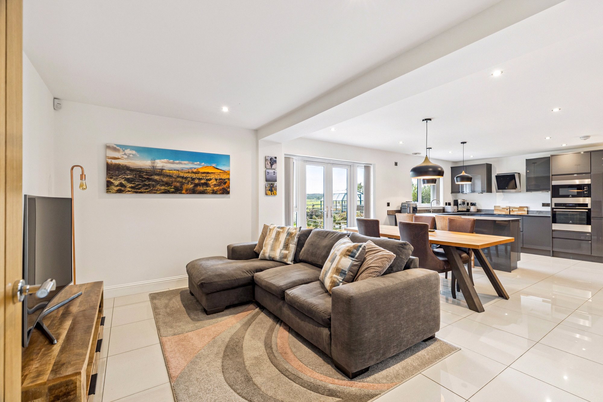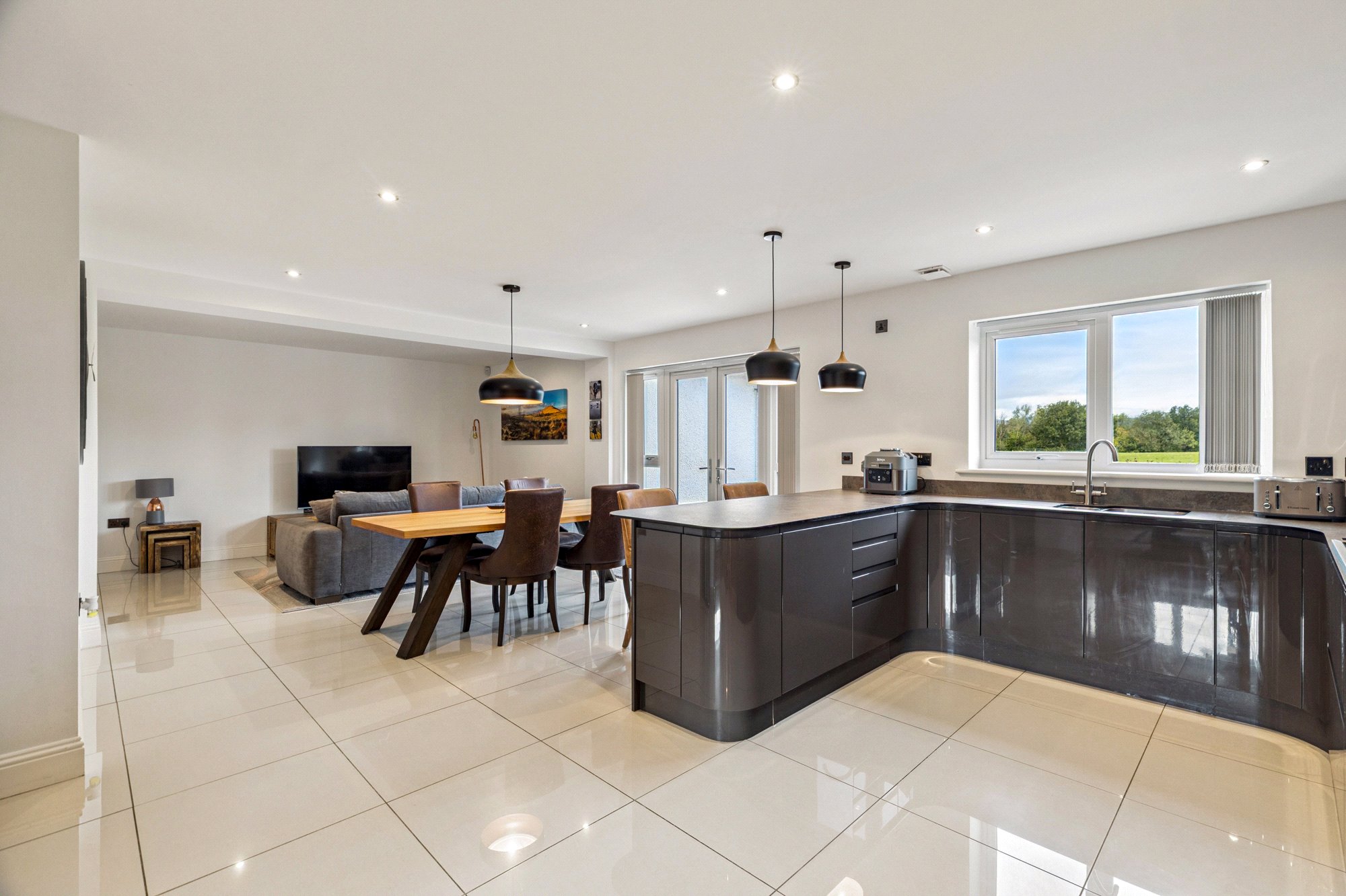 - Open plan living/dining/kitchen space (extends to over 9m in length) – breakfast bar area, range of handle free units in anthracite grey (matching worktops), range of integrated appliances