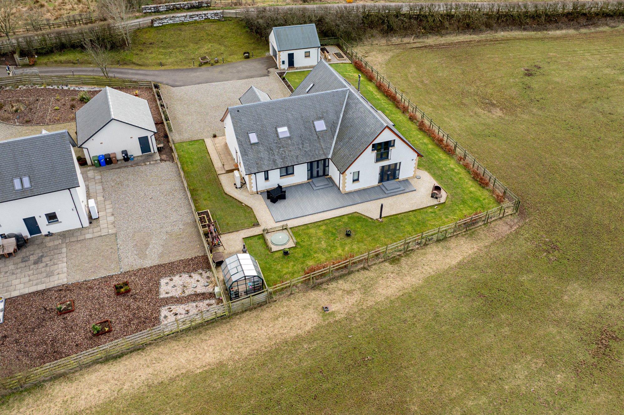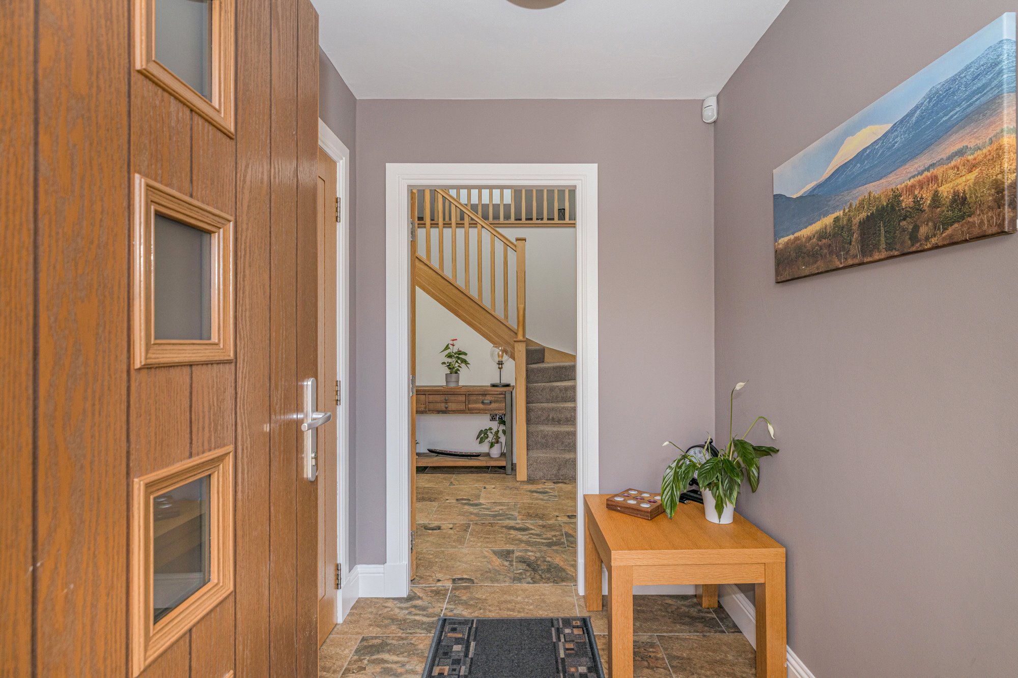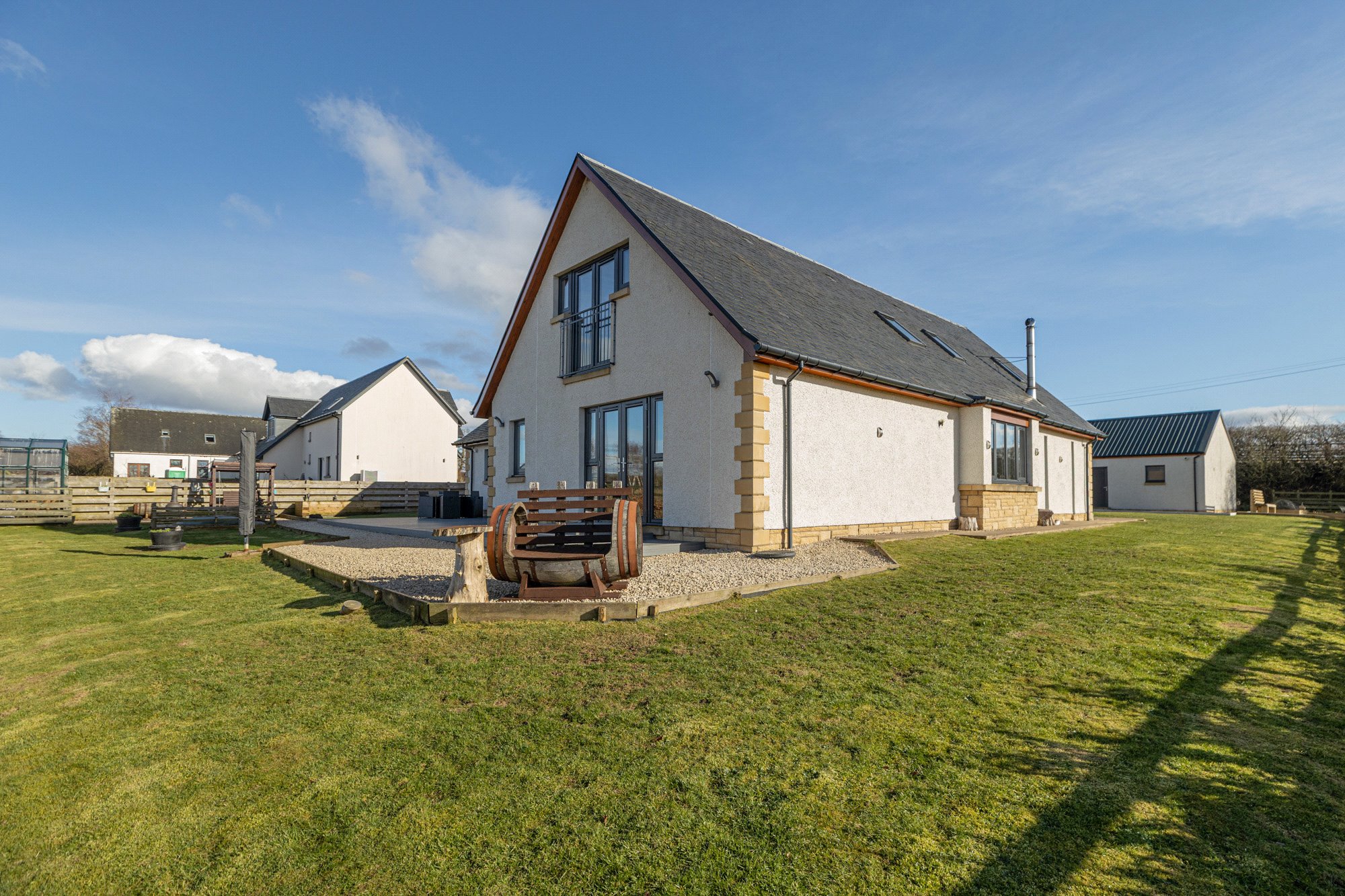 The property is accessed via a tarmacadam drive that leads to a generous parking area laid to stone chips along with the detached garage (5 ½ KW EV car charger attached). Initial inspection will showcase the really attractive design aesthetic, with an ‘oatmeal’ render beautifully contrasted by stone dressings and a beautiful slate roof. Windows are double glazed and coloured in anthracite grey. Internally, the specification is high with quality fixtures, fittings and appliances to be found throughout.