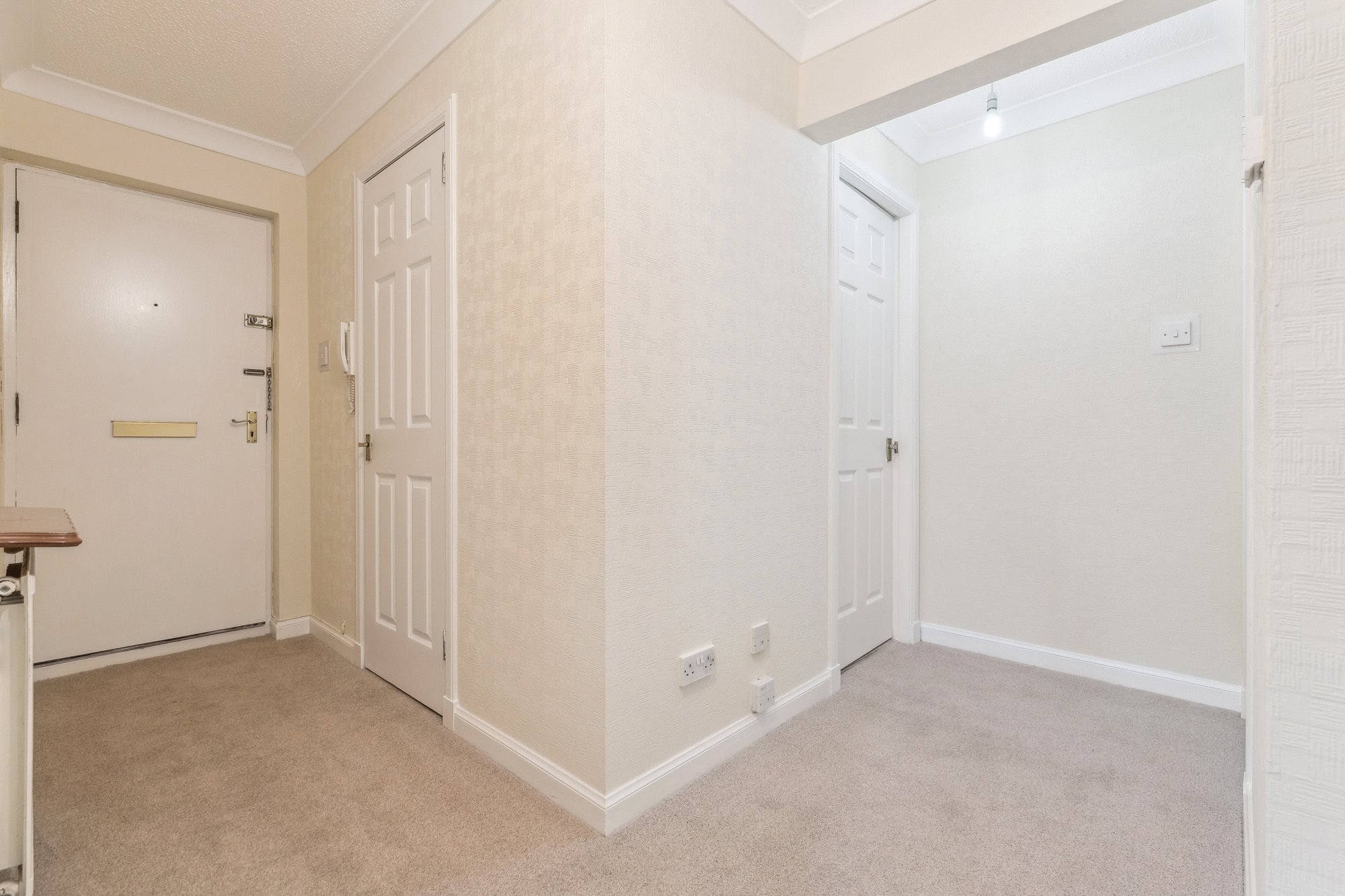 Residents entrance hall with security entry phone system. Private reception hall with two hall cupboards. A nicely proportioned lounge with bay window. Kitchen - galley style, with appliances as seen and of a vintage where buyer may look to upgrade. Two bedrooms, both with fitted mirrored wardrobes. Bathroom with modern white suite, shower attachment to bath taps, and with tiling to half height on walls and to full height around the bath area.