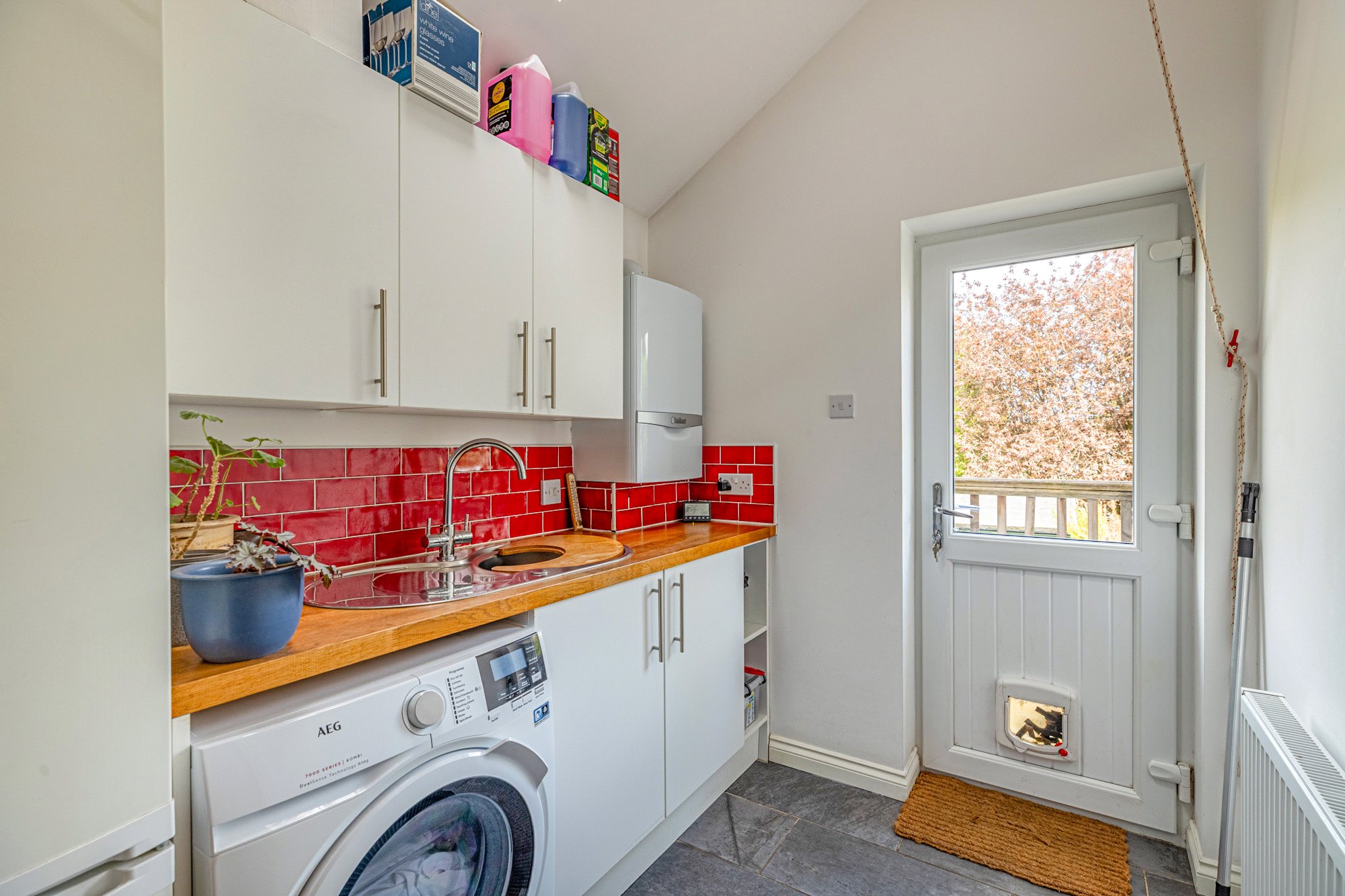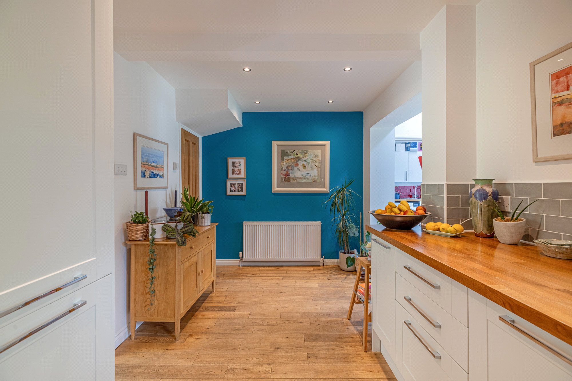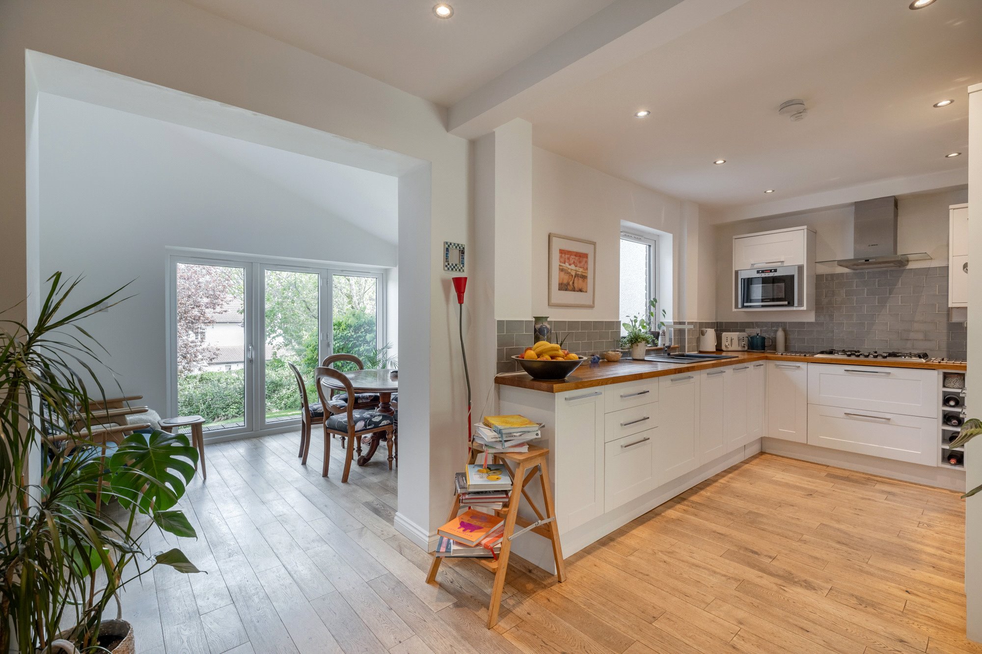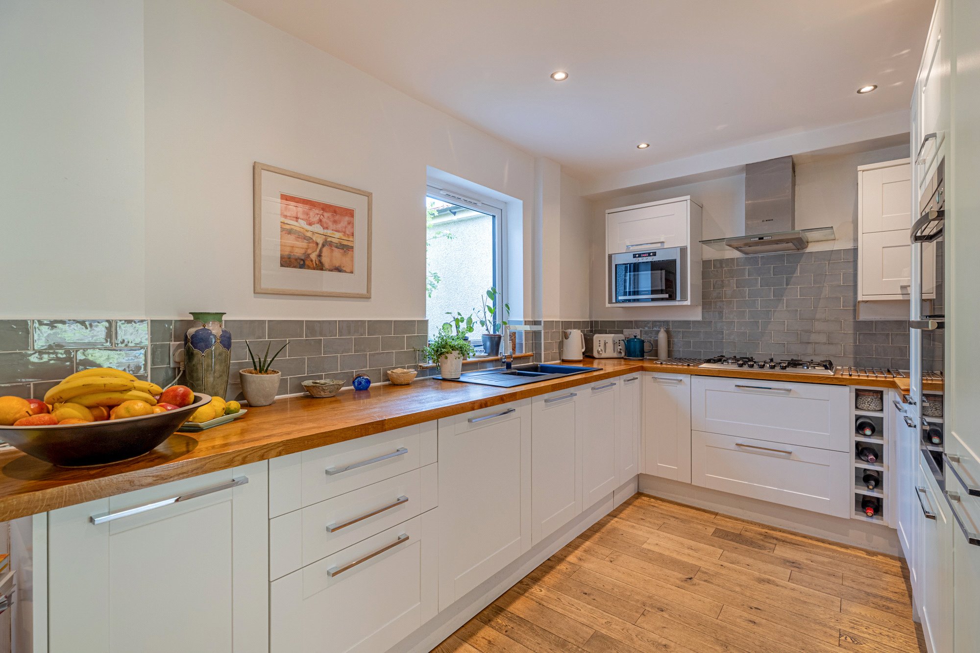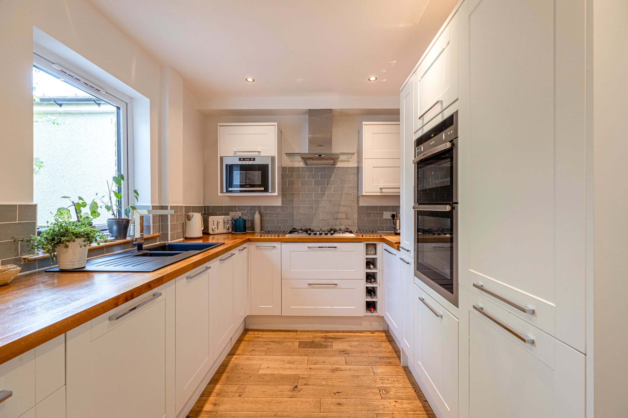 - Contemporary fitted kitchen – white shaker style units/contrast butcherblock worktops, range of quality integrated appliances (majority by Neff/Bosch)