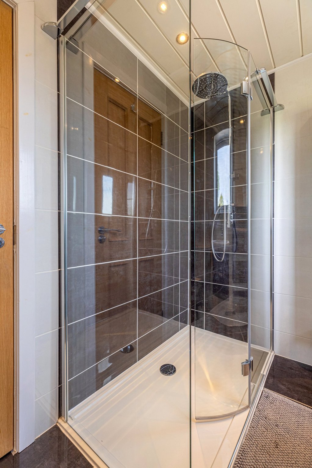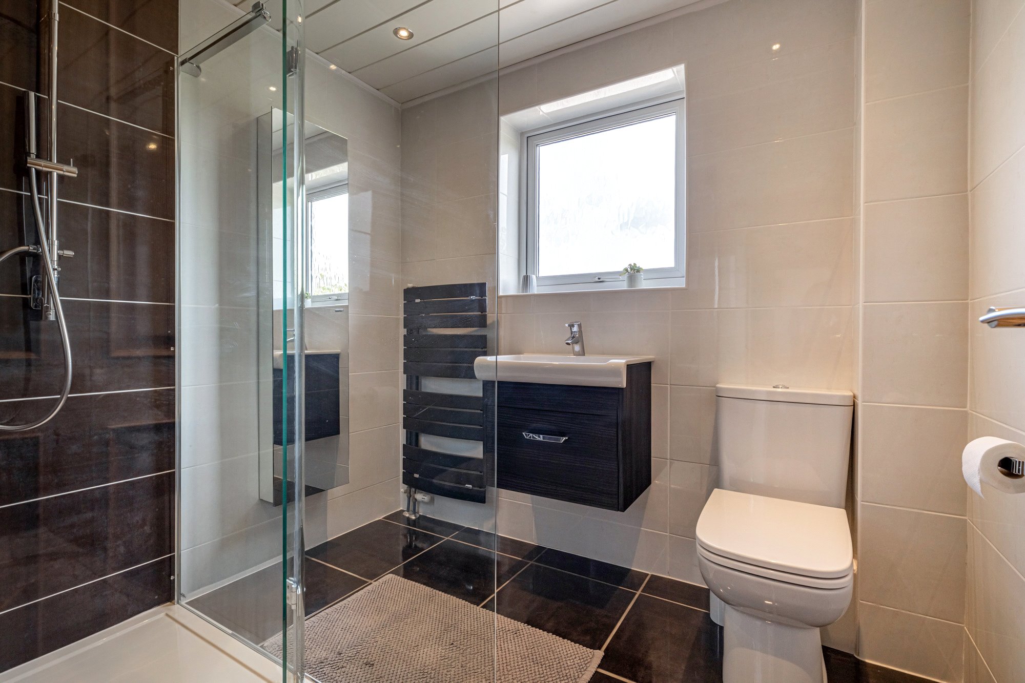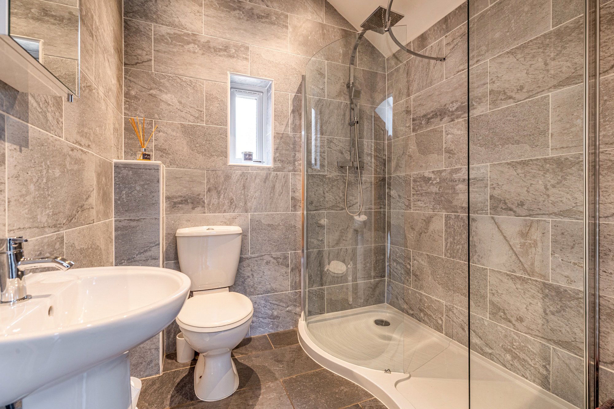 - Two fully tiled shower rooms – both with walk in enclosures, mains pressure showers – one to ground floor, one to first
