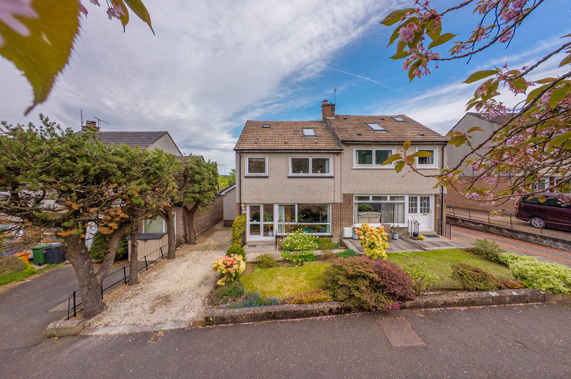 A hugely impressive example of the semi-detached villas by John Lawrence that form part of Bearsden’s consistently popular Burnbrae district, this beautifully presented family home has been successfully extended to its rear elevation and further augmented via the conversion of the former attic space into a bedroom with ensuite shower room.