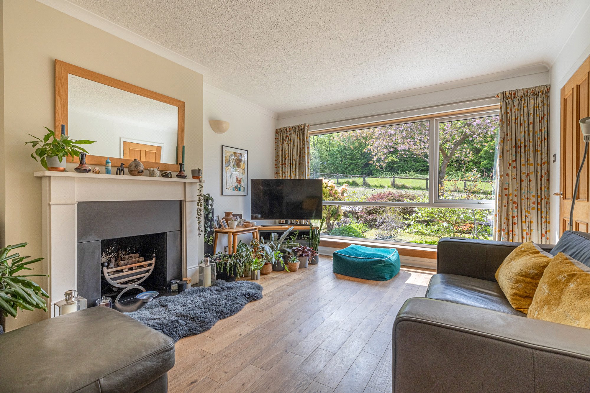 - Lounge with picture window formation, living flame gas fireplace
