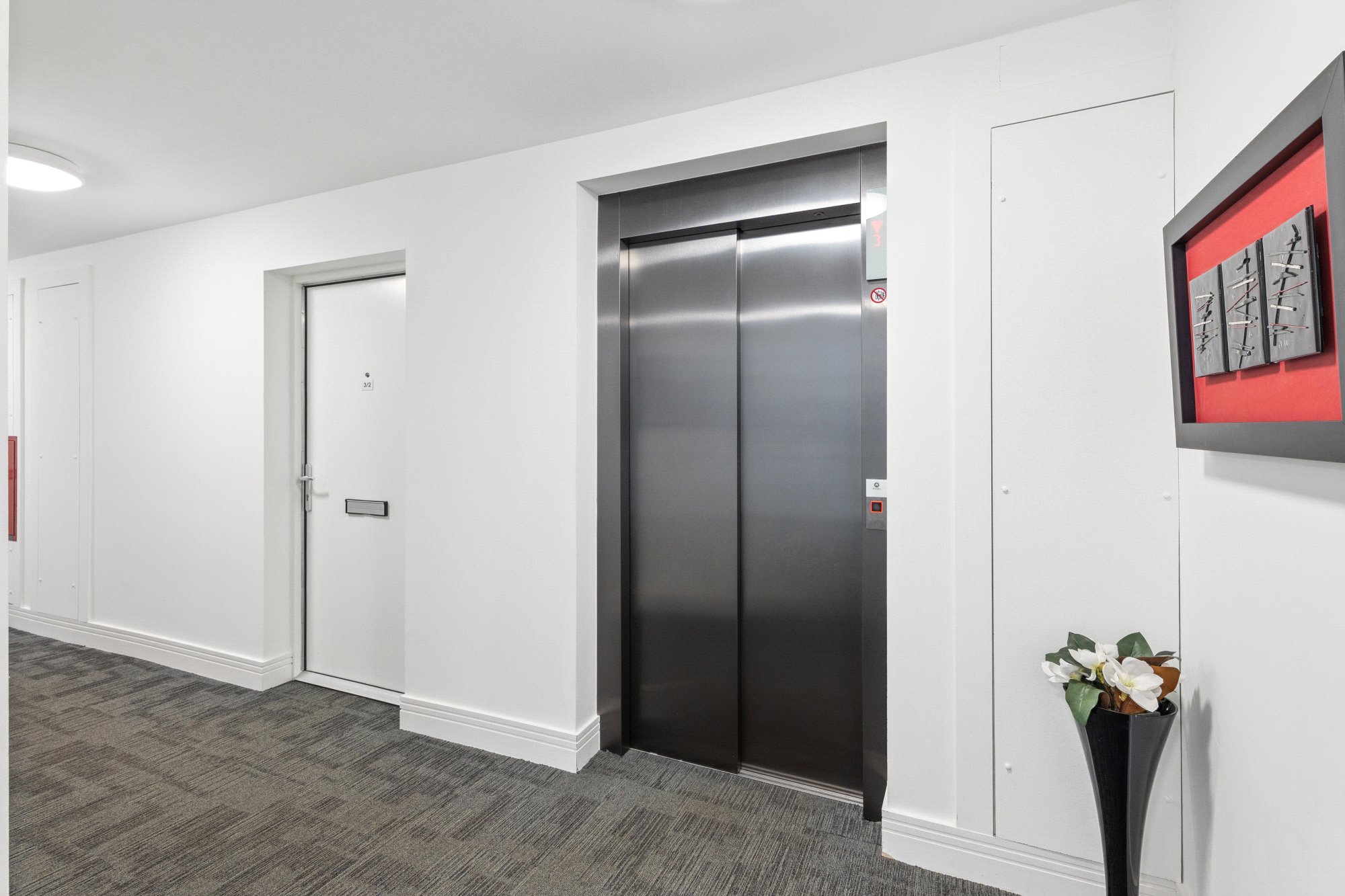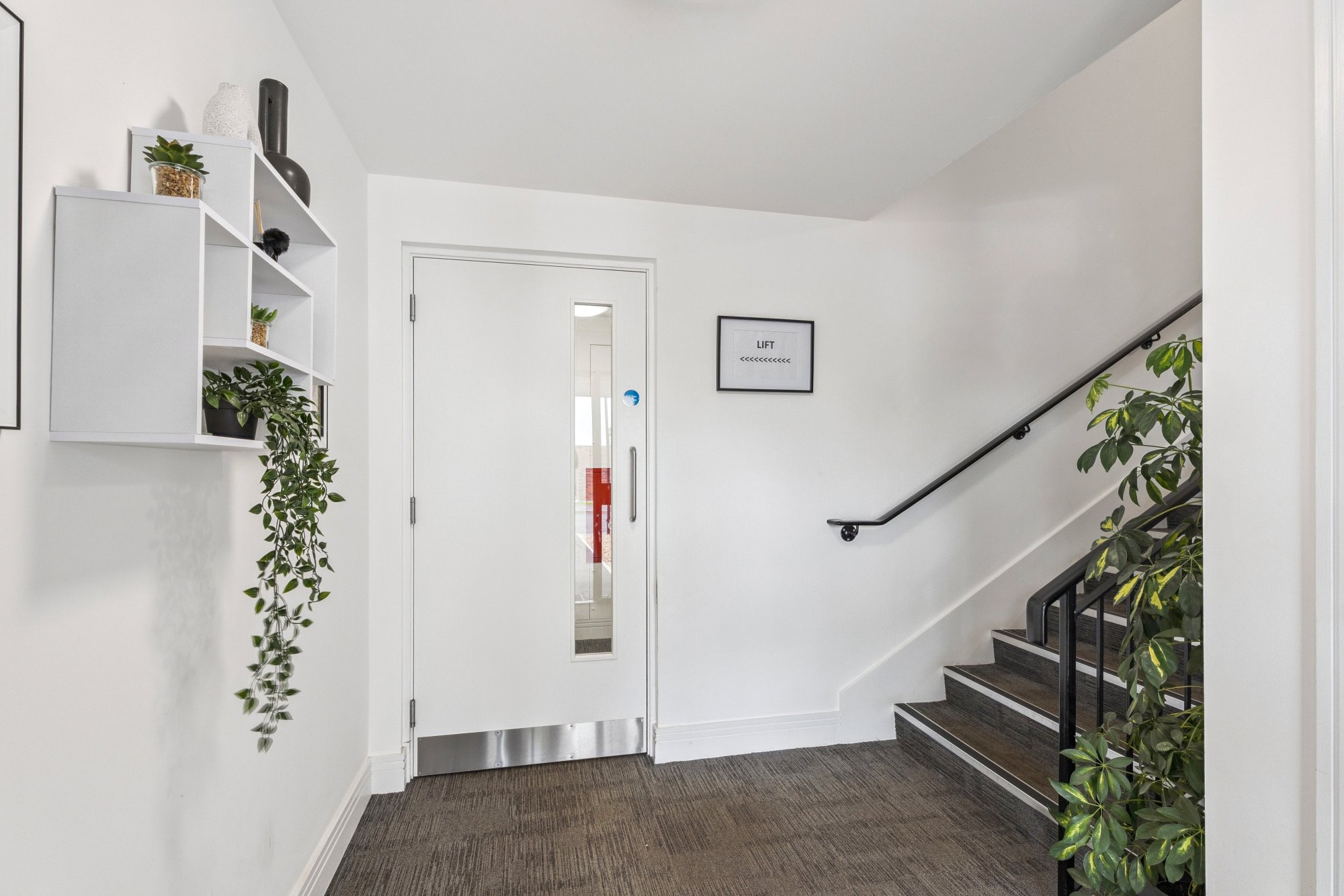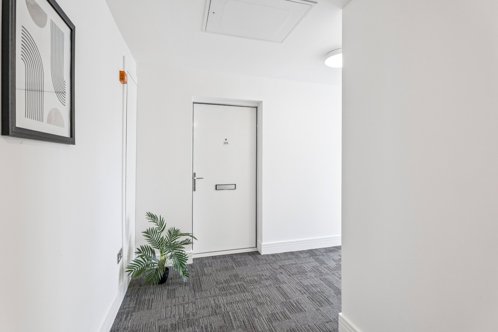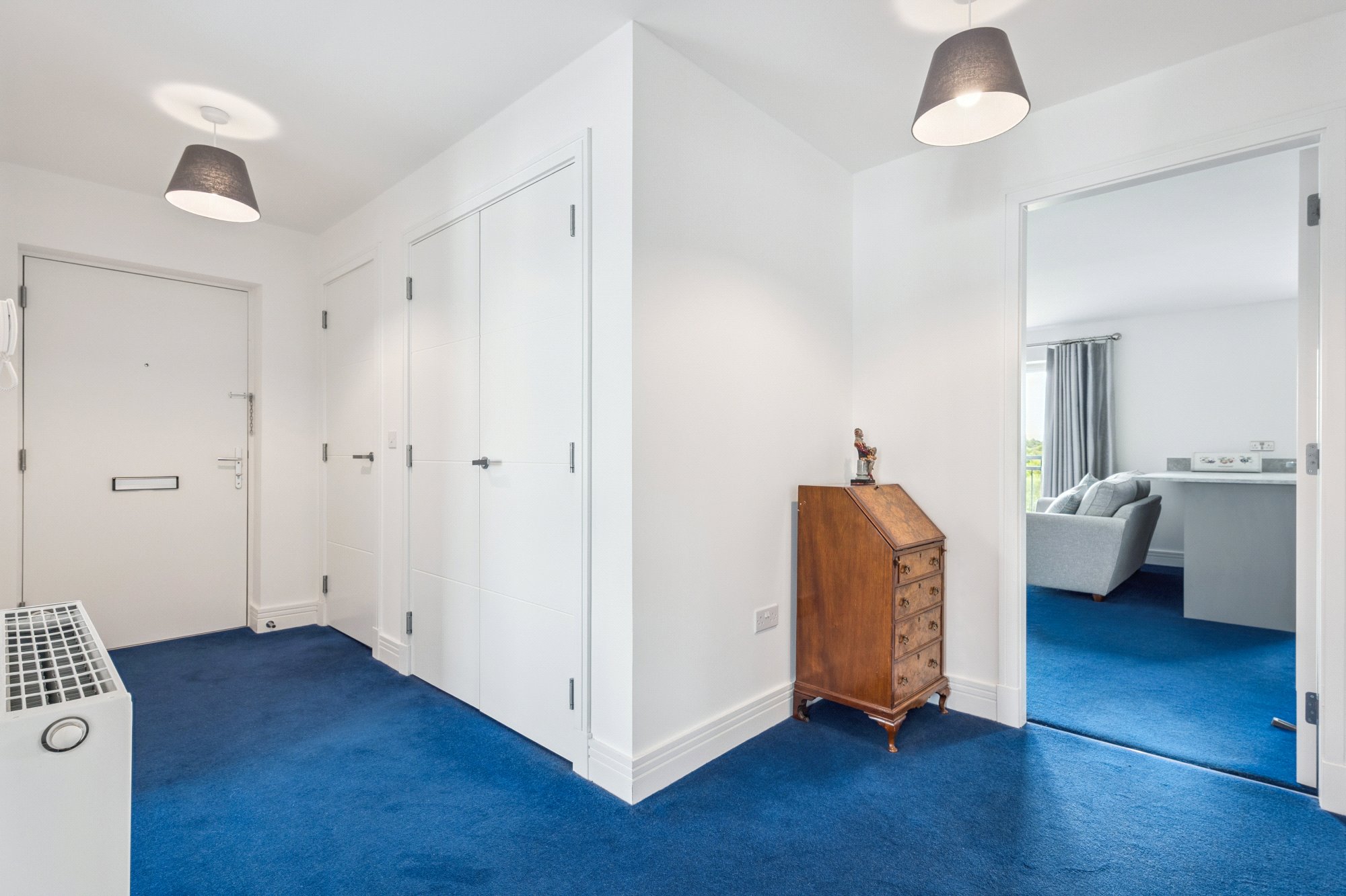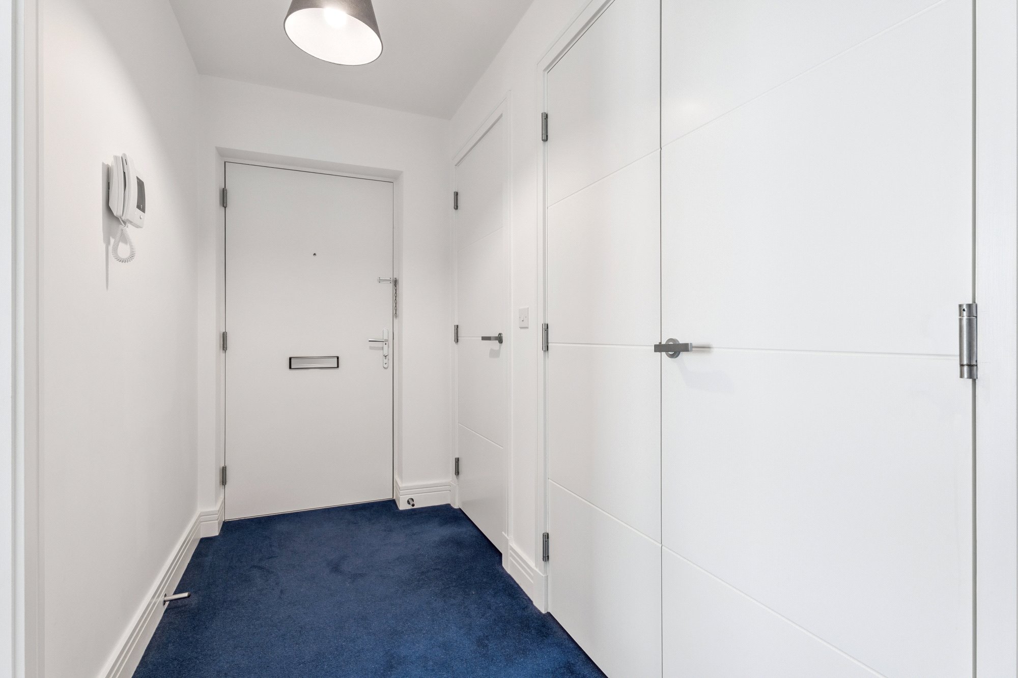 Resident’s entrance hall, secured by a door entry-phone system. Carpeted hallways and staircase ascend to each floor (there are four flats on each level) but, importantly, there is a lift. The flat then has its own reception hall with double-width hall cupboard acting as a laundry within which the washing machine is being left (air extraction system here). Additionally, there is an electrics/comms cupboard and a loft hatch to an attic space.