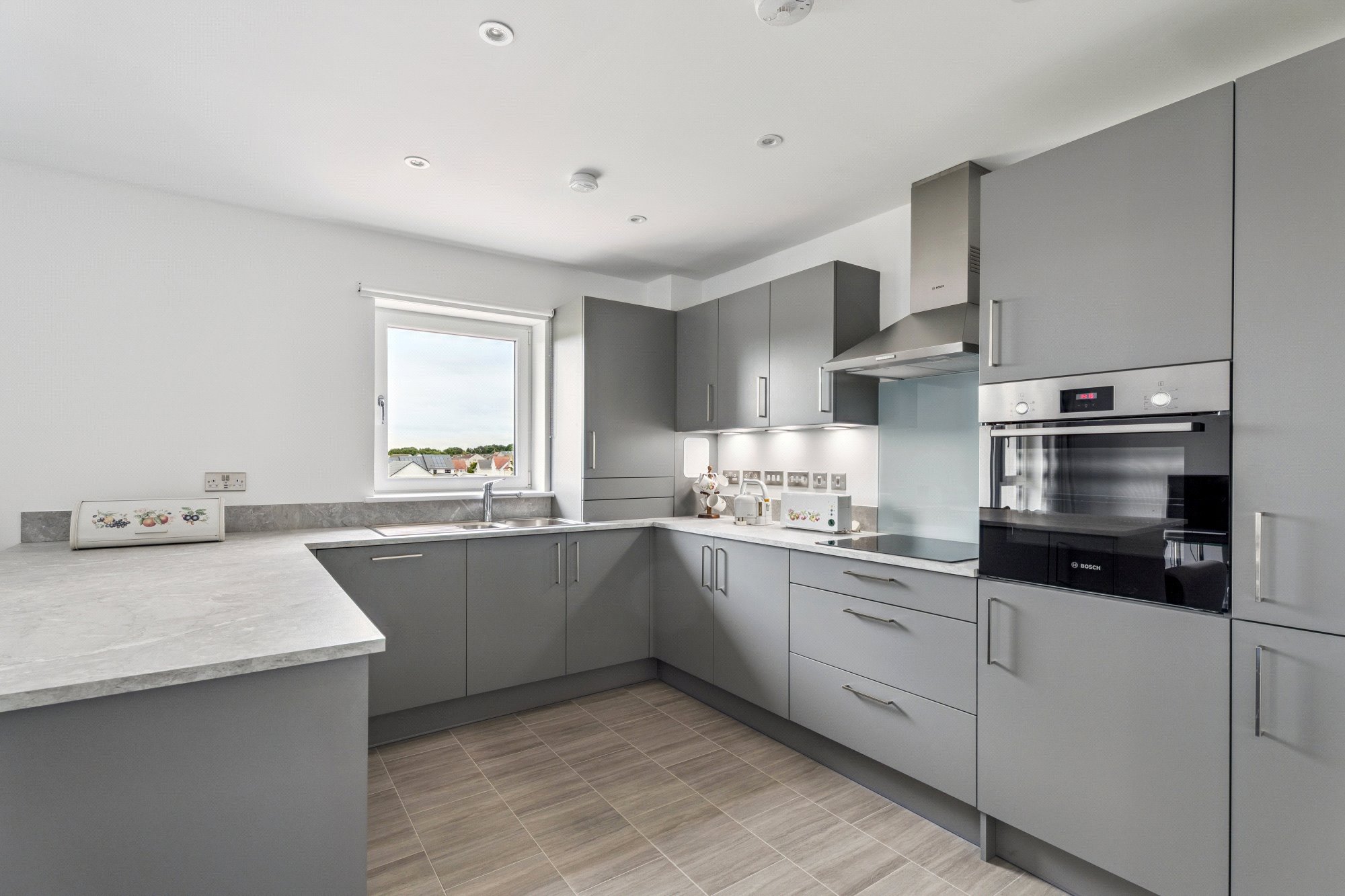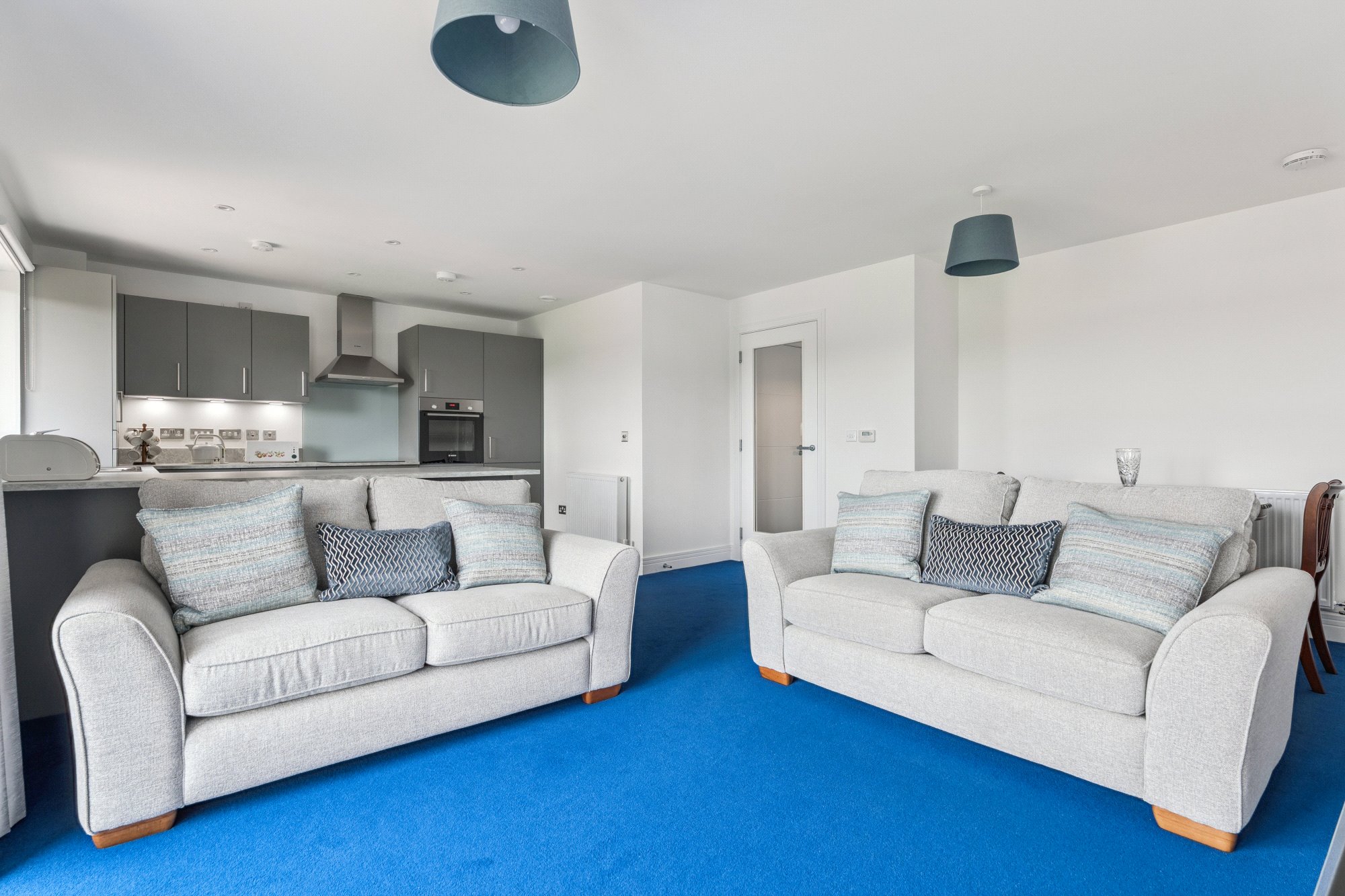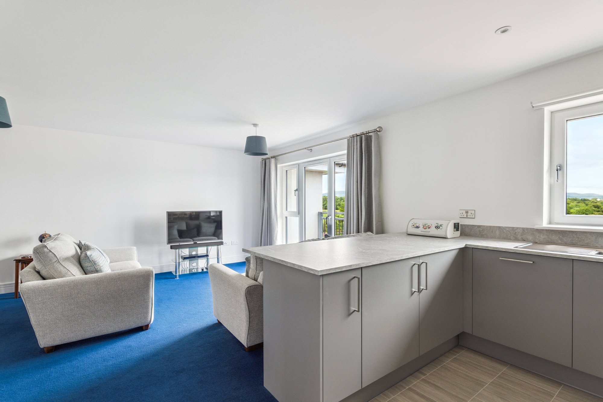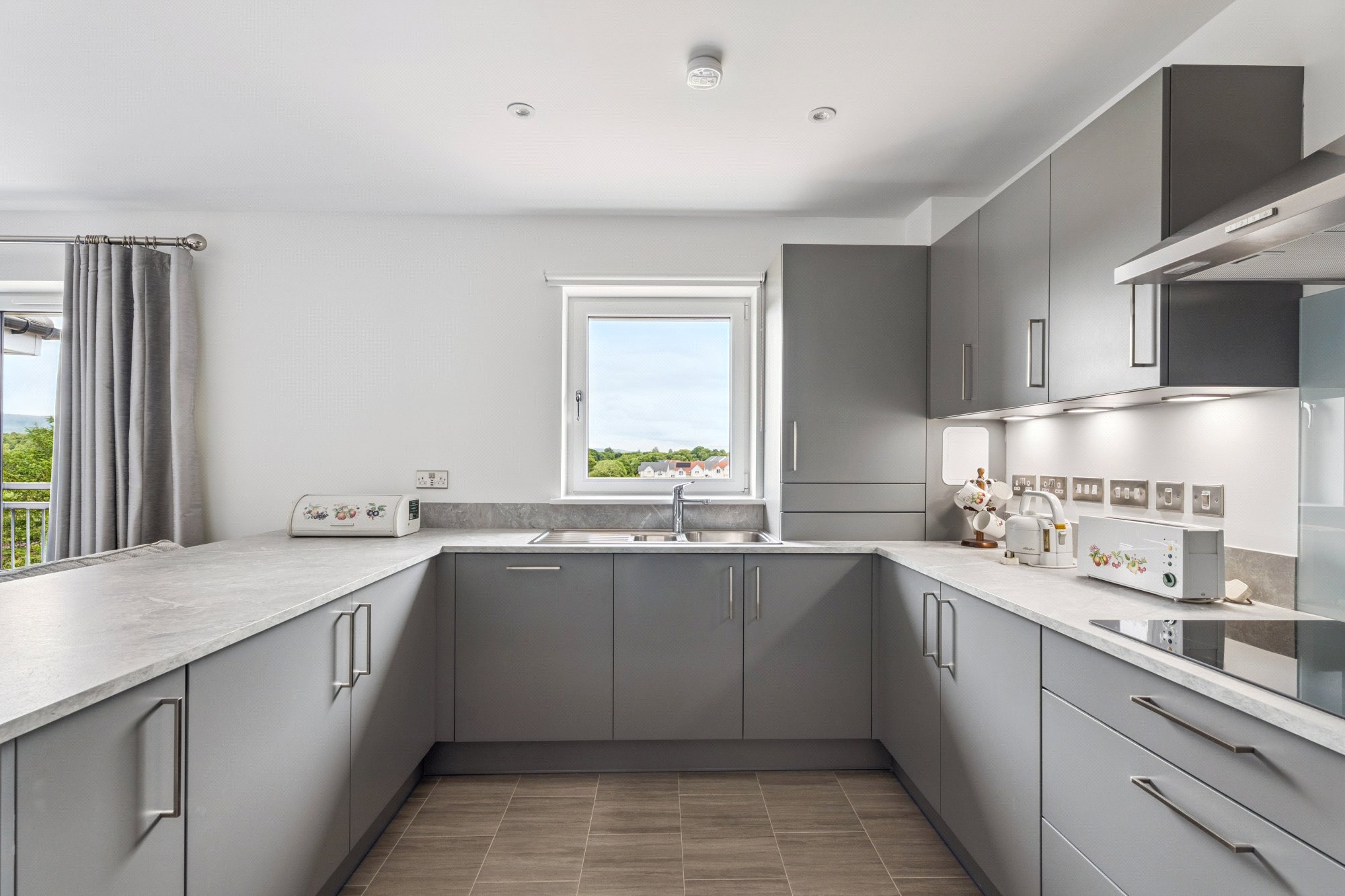 The top floor (3rd) position of this flat maximises the benefits of those views and accentuates the light that floods into each apartment. Impressively appointed the flat has quality uPVC double glazed windows and, in the lounge, features upgraded French doors, and window, to access the balcony. The Ashley Ann kitchen is in a smart grey colour offset by marble style laminate worktops/upstands, including a peninsula unit with breakfast bar. There are integrated Bosch appliances, two of which have never been used (oven, dishwasher).