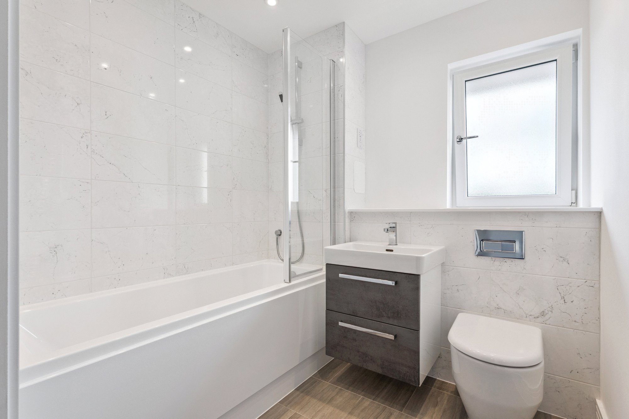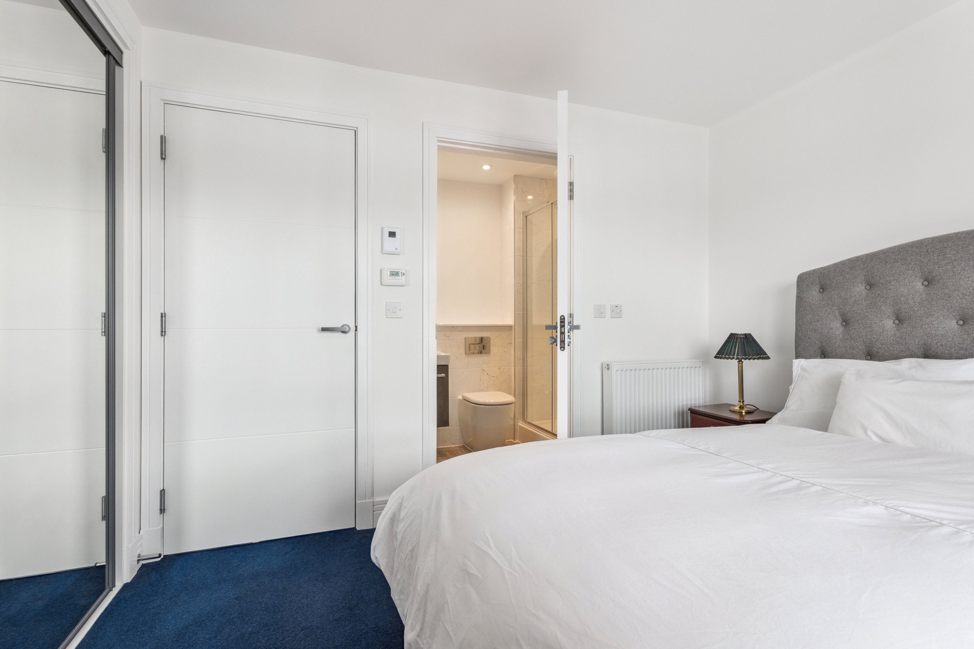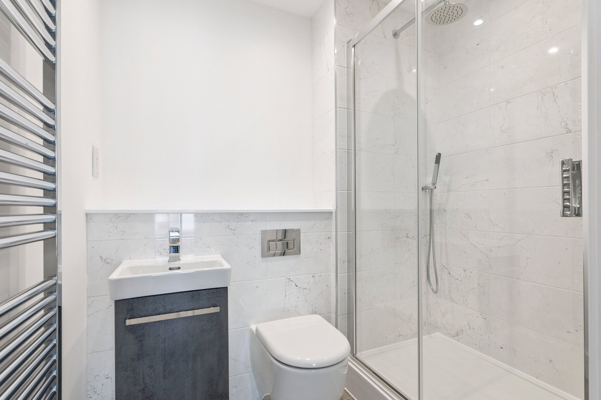 Both bedrooms are doubles, both with wardrobe provision. Ensuite to bedroom 1 is a lovely shower room with an oversized shower enclosure in which there is a powerful thermostatic shower, by Vado, with both deluge and hand shower heads. To service bedroom 2 is a bathroom (with window) where another Vado thermostatic shower is set over the bath. Both have tall “ladder” towel radiators in chrome.