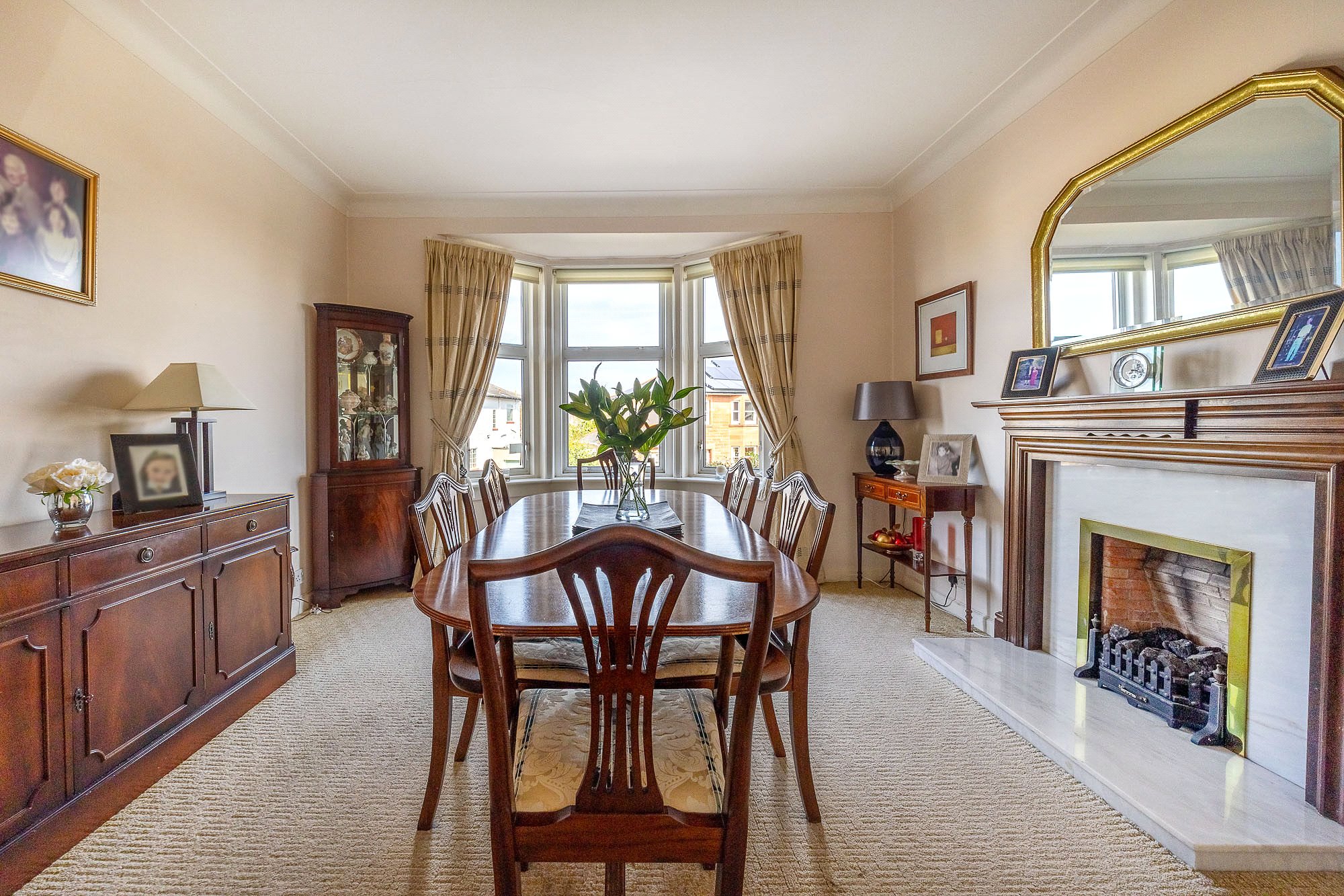 - Formal bay windowed dining room with feature fireplace (living flame gas)
