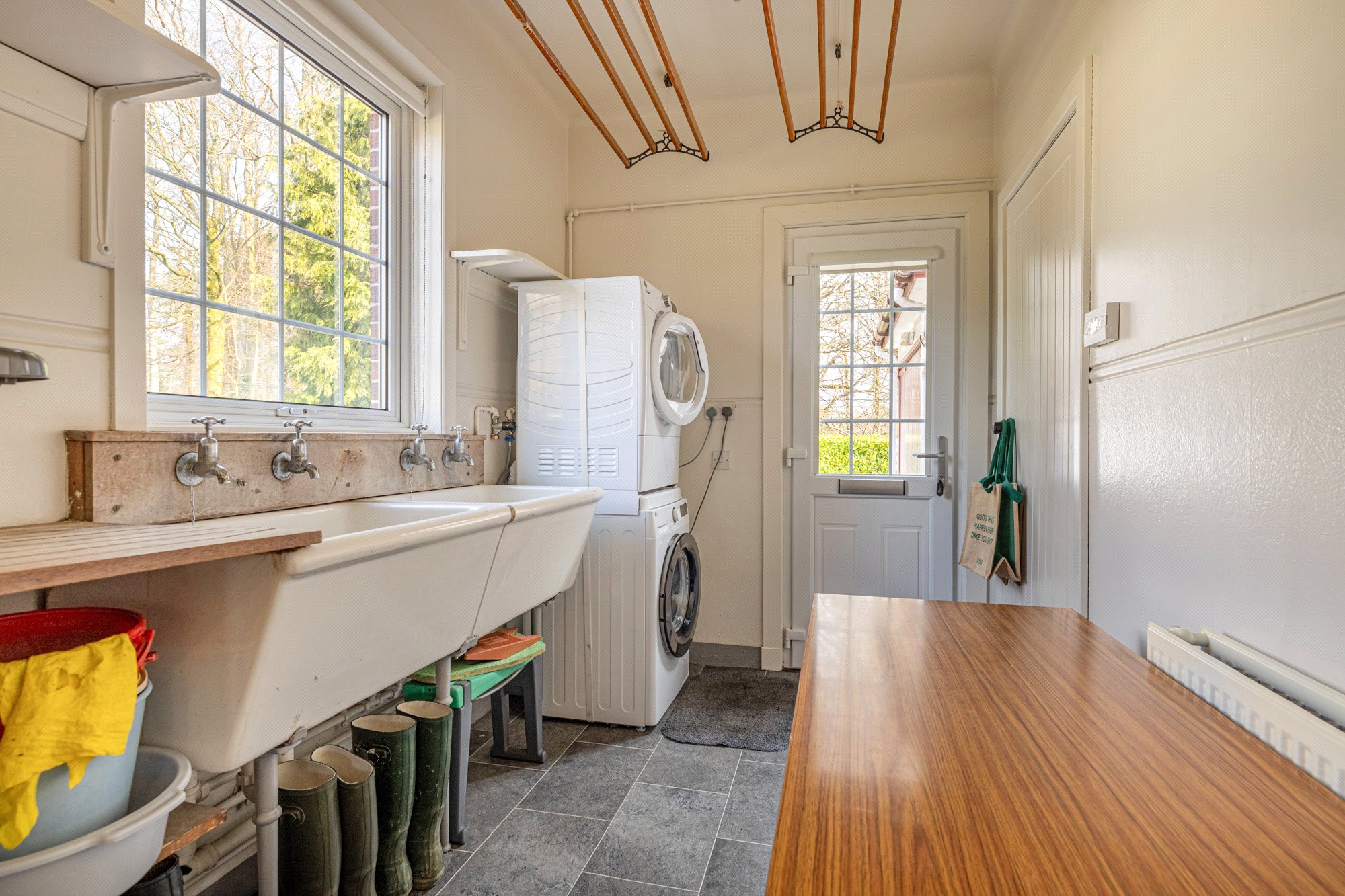 Entrance vestibule; reception hall; cloakroom with original fittings, separate WC compartment; sitting room with triple aspect and outside of this, a loggia; formal dining room; lounge with double aspect and gorgeous original bookcase cabinets retained; breakfast room with storeroom off; kitchen with cherrywood units and integrated appliances (Neff: induction hob, double oven and grill, dishwasher, fridge, microwave. Bosch: cooker hood); utility/laundry room with two original Belfast sinks and wooden draining board, laundry pulleys, plumbing for washing machine and external vent for tumble dryer; larder with shelving including chunky slate cold shelf; butler’s pantry; boiler room.