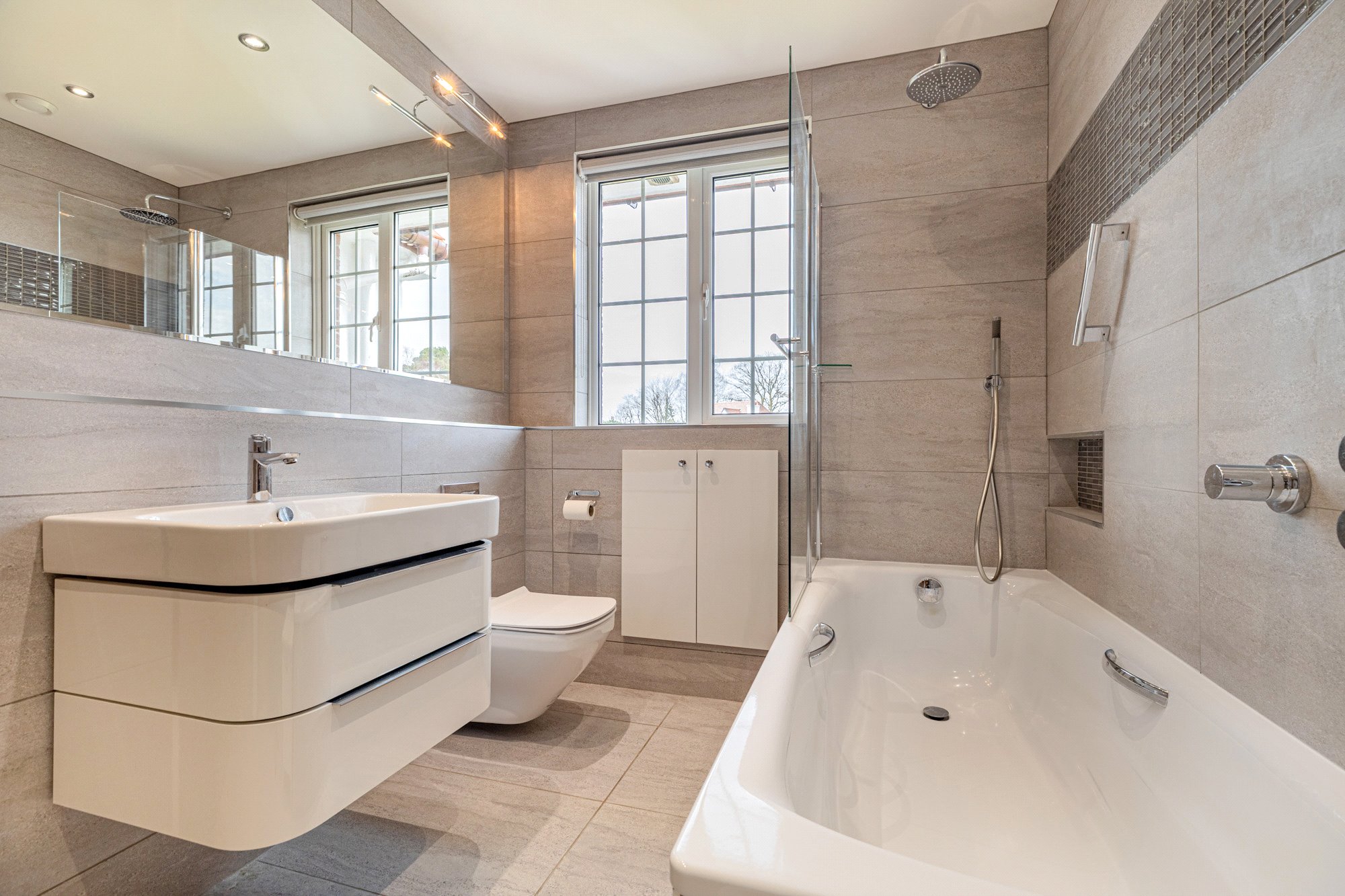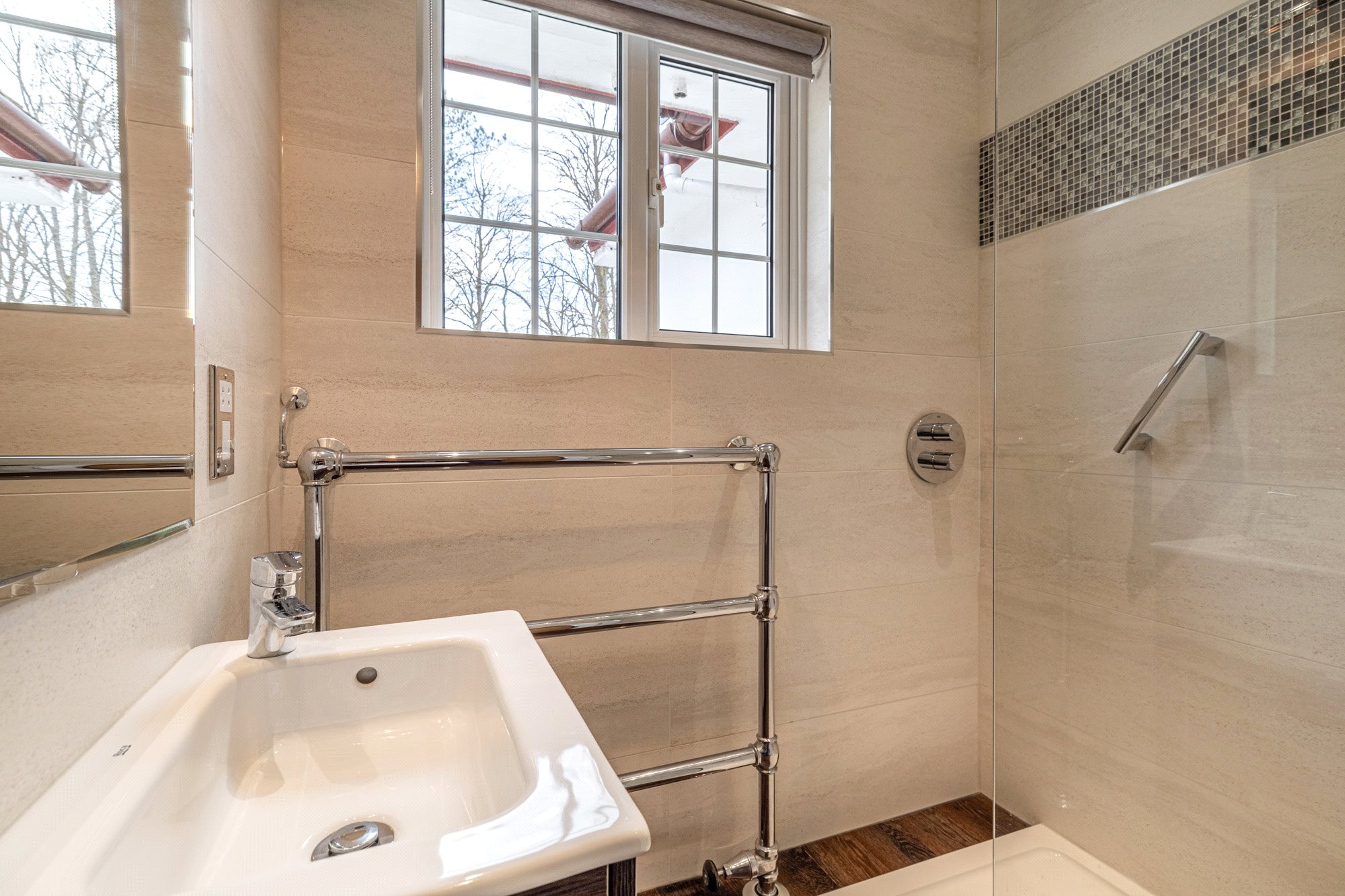 Wide, return flight, staircase ascends past a tall half-landing window. This original staircase retains a rather timeless and unique handrail; upper hall with linen cupboard, wardrobe, and hatch to attic; bedroom 1 with double aspect (front and rear), (bedroom furniture including headboard and mirror are specifically excluded); fully tiled, luxury, ensuite bathroom with high-end Duravit suite and Grohe thermostatic shower (power pump) over the bath (deluge and hand shower heads). The bathroom is “Jack and Jill” to the hall; four further double bedrooms (Bedroom 5 used as a Home Office); shower room with two-piece suite including oversized “wet zone” shower enclosure with another Grohe thermostatic shower (again with power pump and deluge and hand shower heads); WC compartment, separate from the shower room.