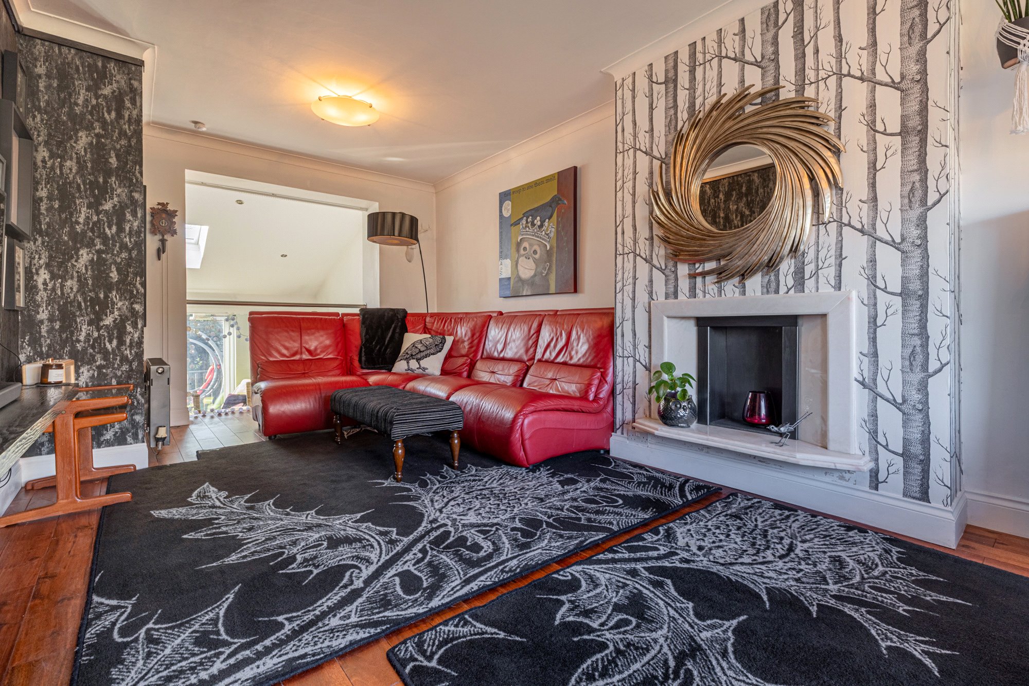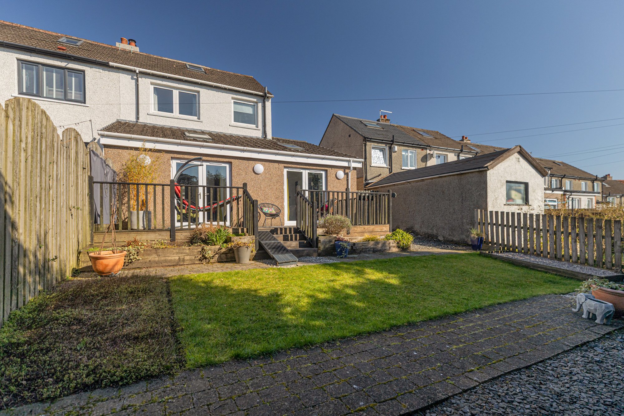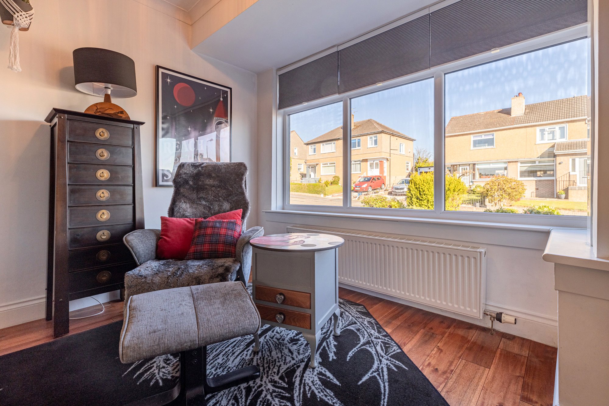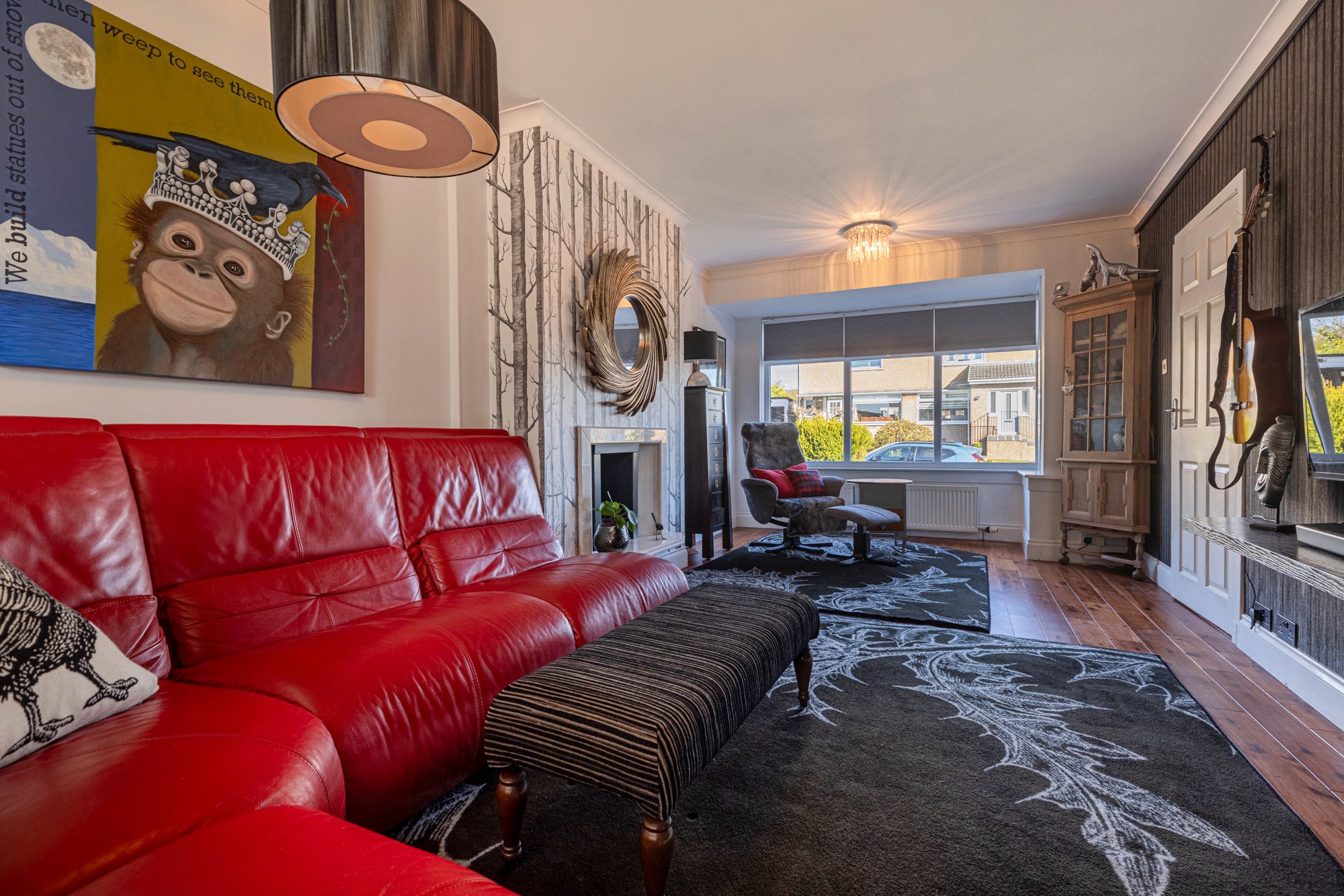 Set in the midst of a quiet address in Bearsden’s consistently admired Bonnaughton district, No.17 Tinto Road could be easily argued as one of the best examples of the two bedroomed semi-detached villas that form part of the locale, originally constructed by John Lawrence in the 1970’s. Over time, our client has cleverly/very creatively adapted the core accommodation, with the addition of a superb full width/pitched roof extension to the rear elevation creating a fabulous open plan dining/kitchen space that now serves as the real heart of the home. This augmentation has allowed for a reconfiguration of the original ground floor accommodation, with a dedicated utility room (complete with dog shower) and a beautifully set out/decorated lounge (glass balustrade overlooking the dining/kitchen) to be found.