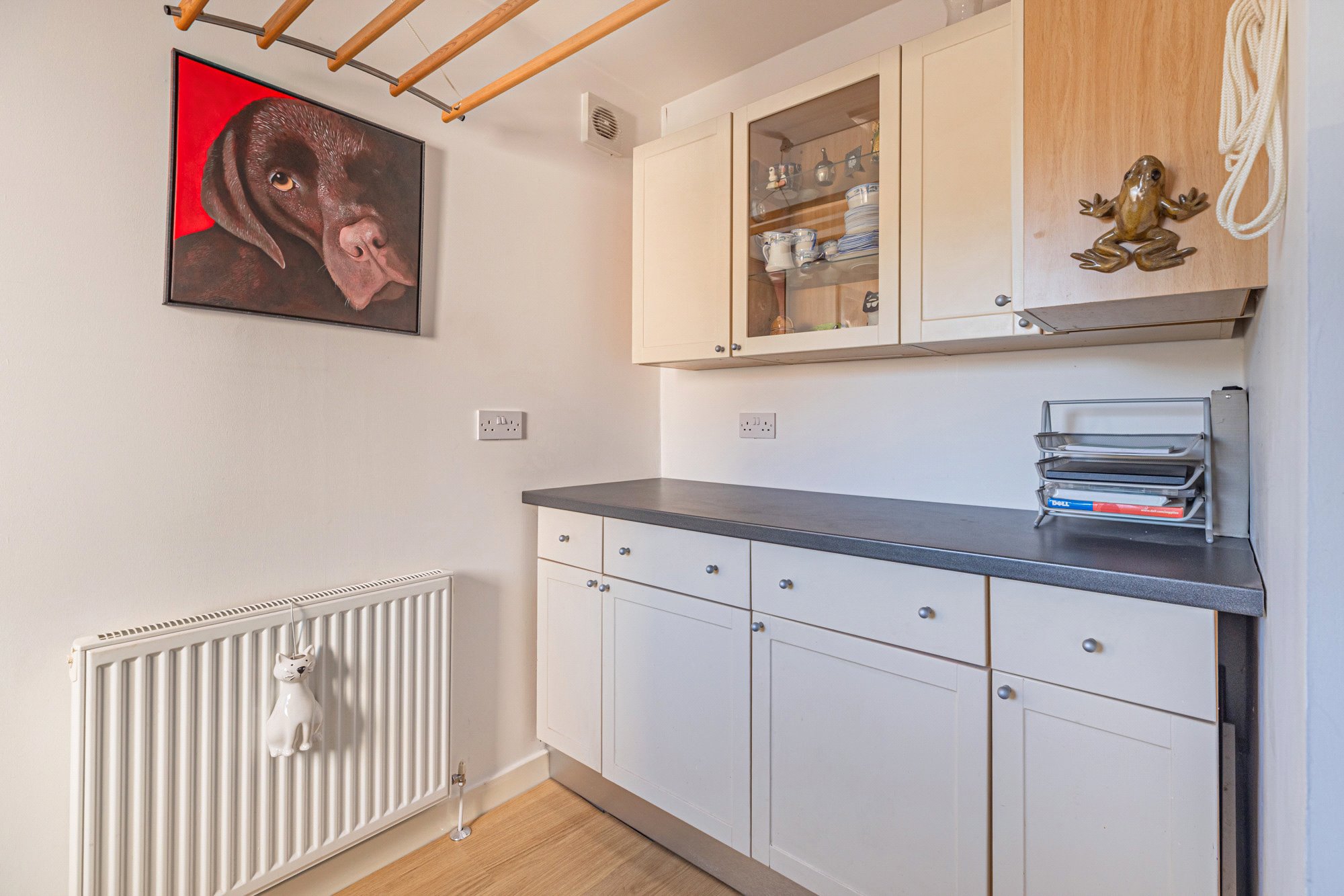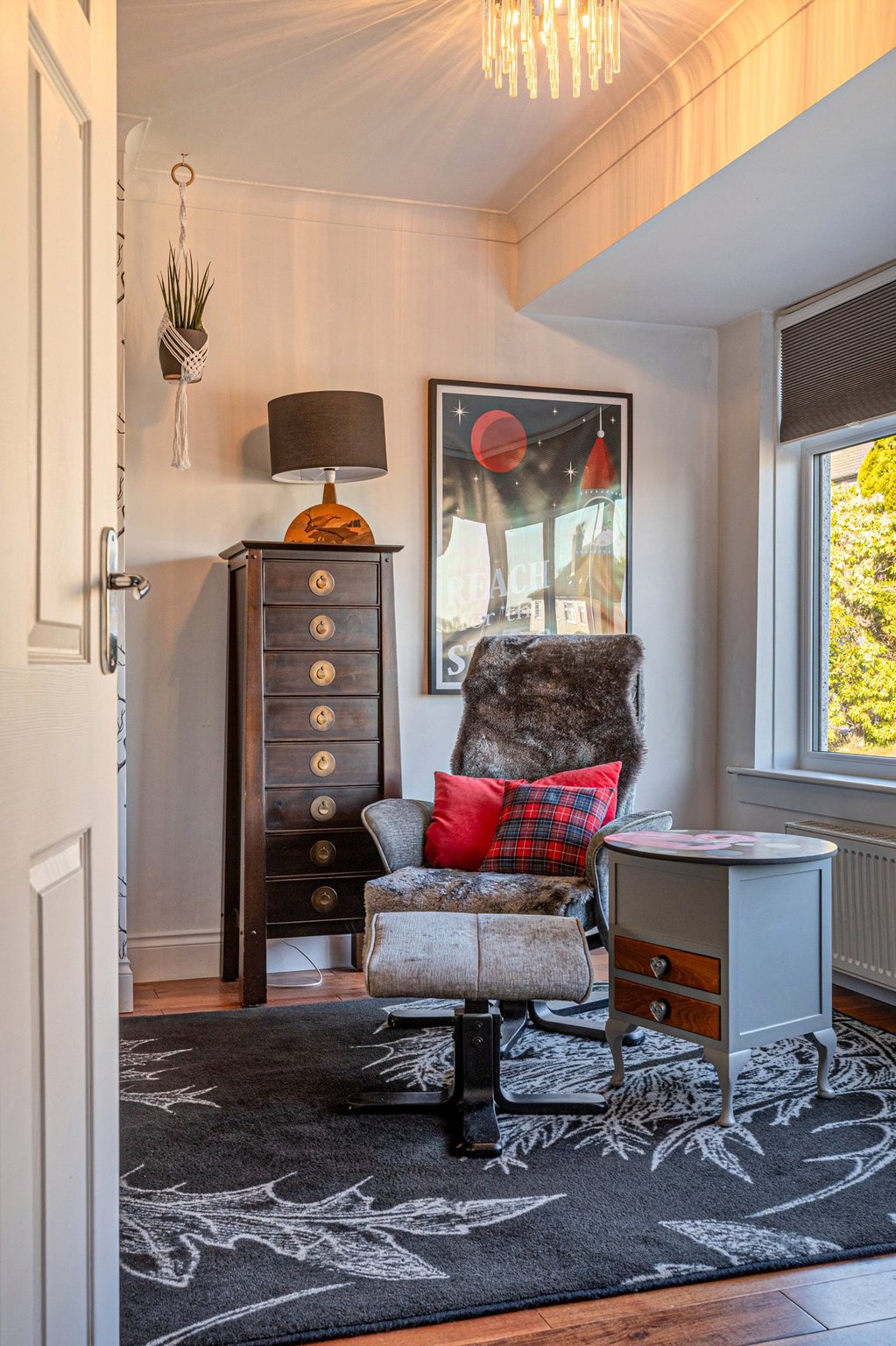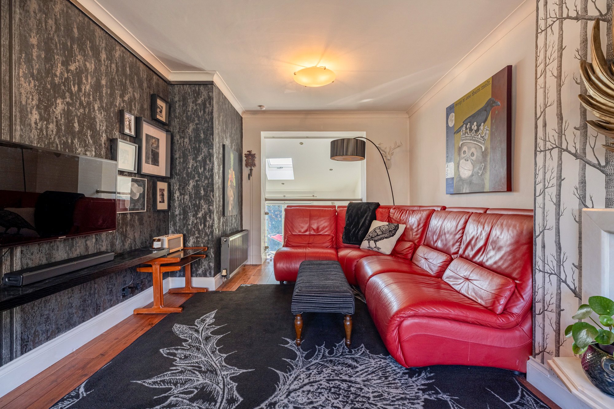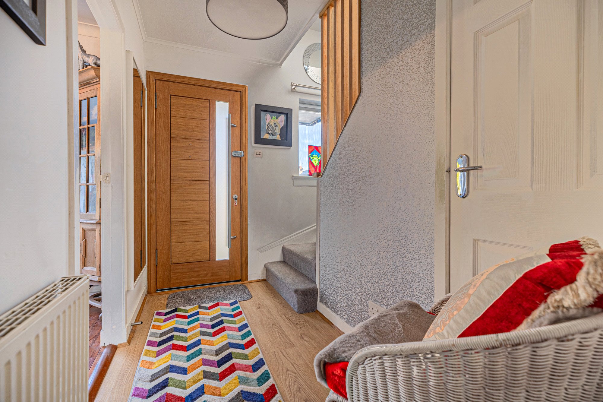 Set in the midst of a quiet address in Bearsden’s consistently admired Bonnaughton district, No.17 Tinto Road could be easily argued as one of the best examples of the two bedroomed semi-detached villas that form part of the locale, originally constructed by John Lawrence in the 1970’s. Over time, our client has cleverly/very creatively adapted the core accommodation, with the addition of a superb full width/pitched roof extension to the rear elevation creating a fabulous open plan dining/kitchen space that now serves as the real heart of the home. This augmentation has allowed for a reconfiguration of the original ground floor accommodation, with a dedicated utility room (complete with dog shower) and a beautifully set out/decorated lounge (glass balustrade overlooking the dining/kitchen) to be found.