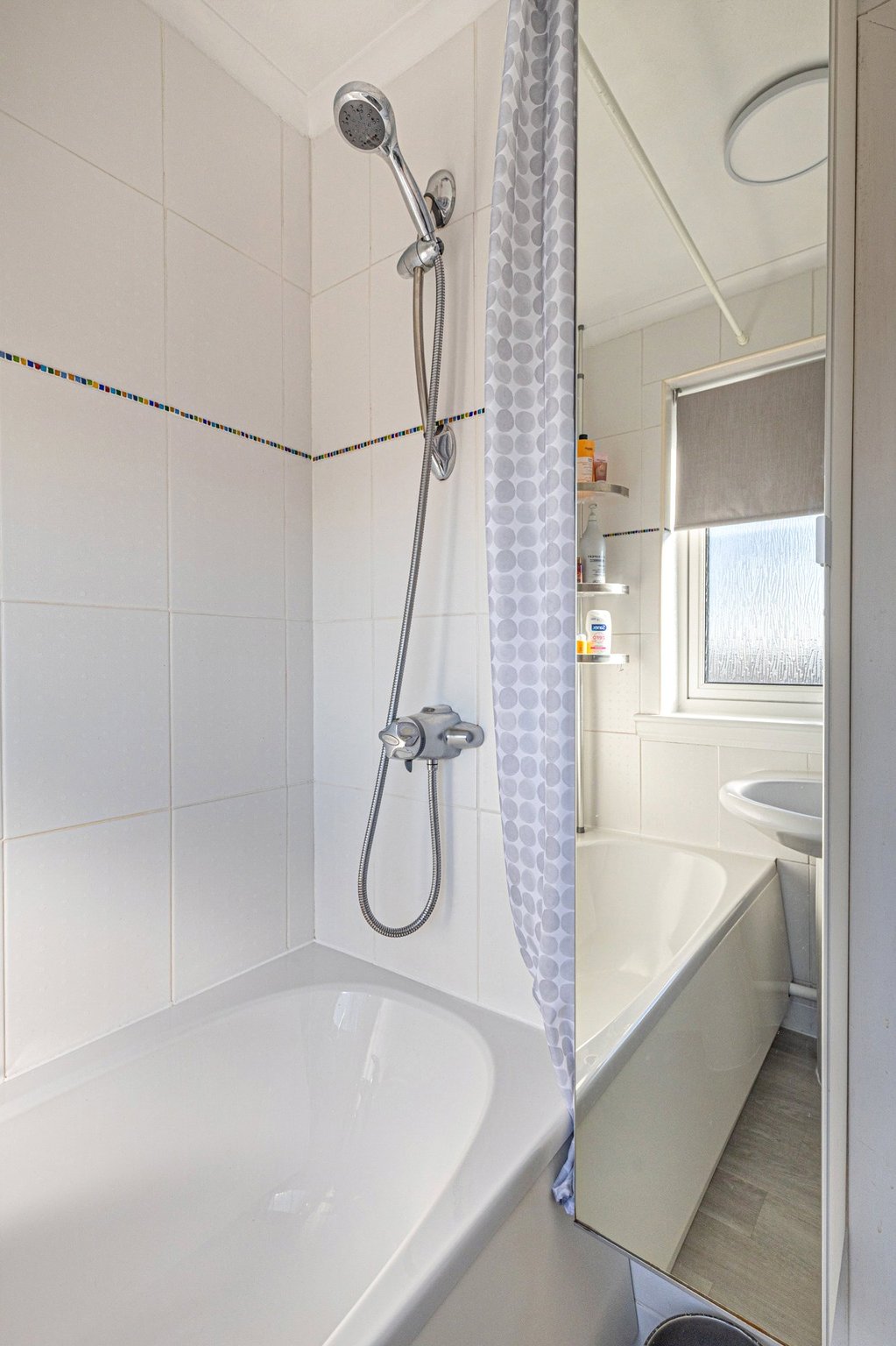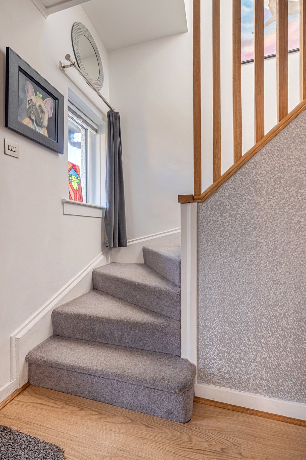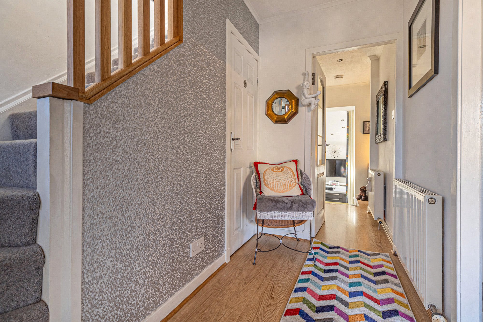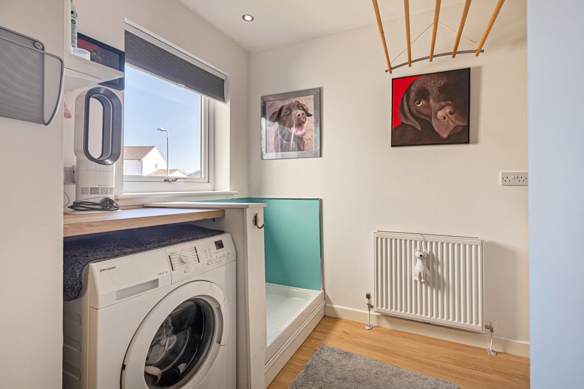 Set in the midst of a quiet address in Bearsden’s consistently admired Bonnaughton district, No.17 Tinto Road could be easily argued as one of the best examples of the two bedroomed semi-detached villas that form part of the locale, originally constructed by John Lawrence in the 1970’s. Over time, our client has cleverly/very creatively adapted the core accommodation, with the addition of a superb full width/pitched roof extension to the rear elevation creating a fabulous open plan dining/kitchen space that now serves as the real heart of the home. This augmentation has allowed for a reconfiguration of the original ground floor accommodation, with a dedicated utility room (complete with dog shower) and a beautifully set out/decorated lounge (glass balustrade overlooking the dining/kitchen) to be found.