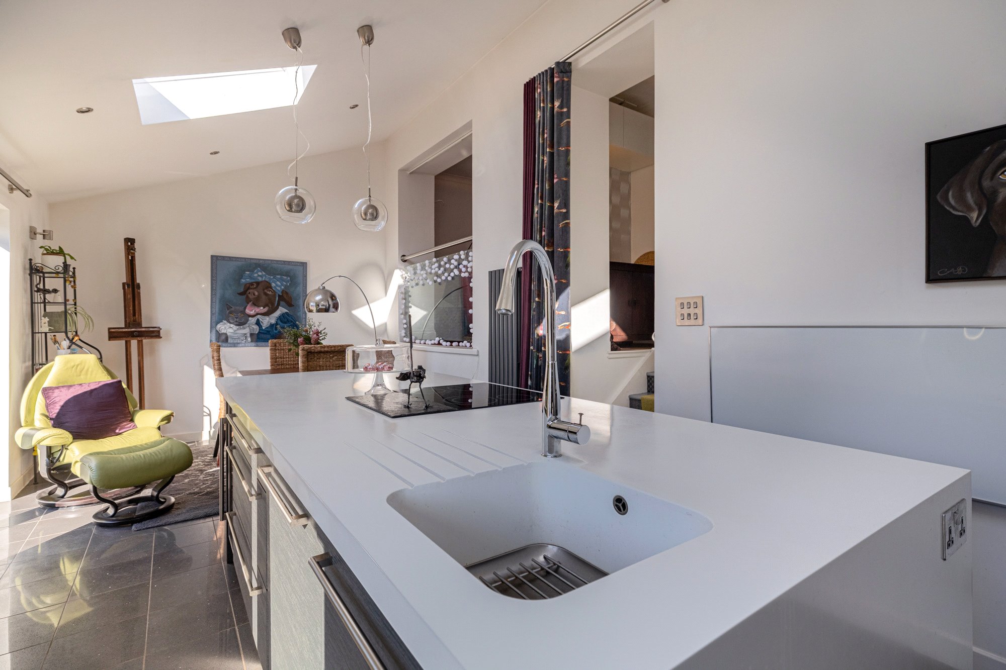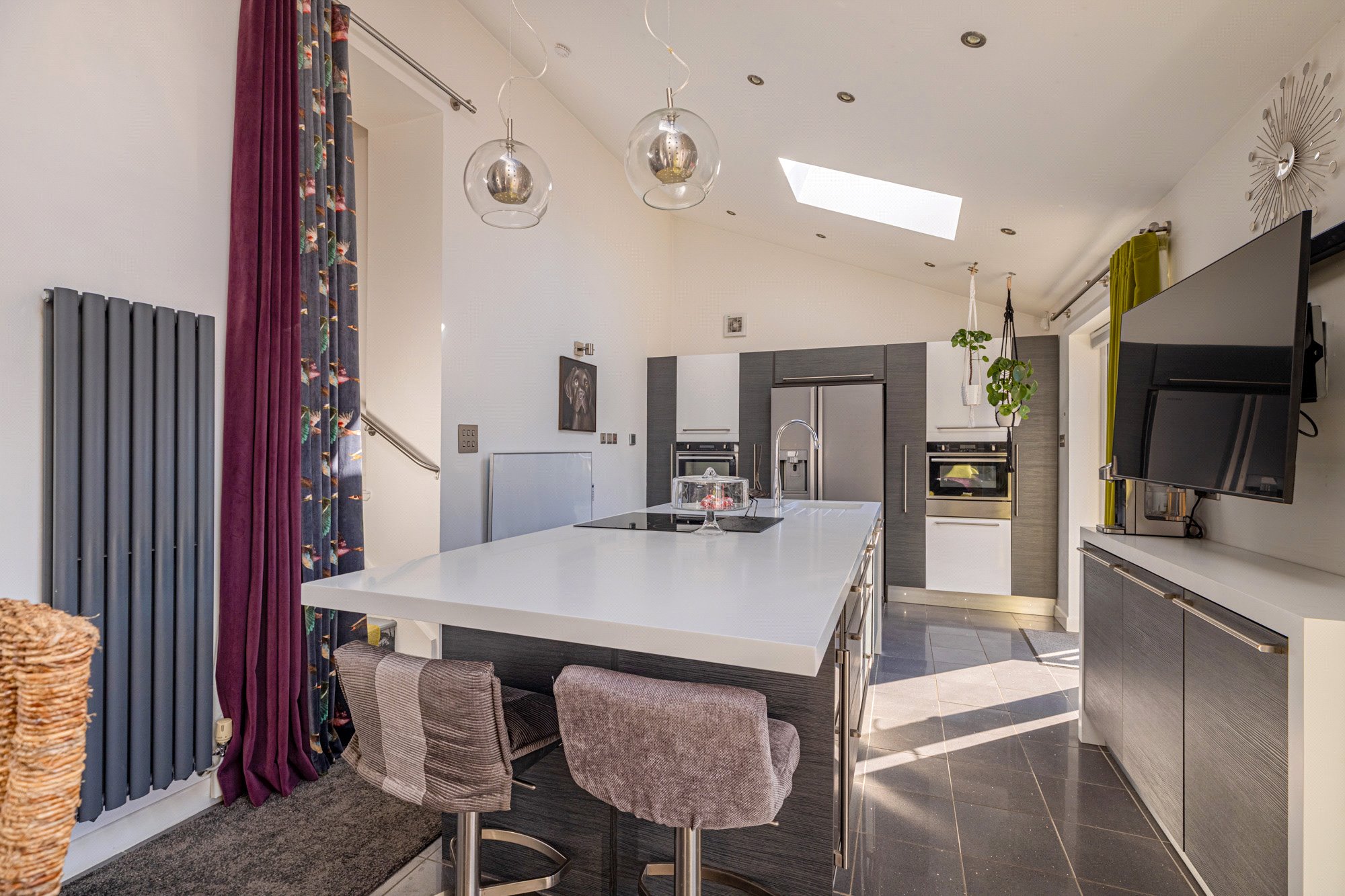 - Stunning full width extension to rear – pitched roof, large central island, direct access to rear garden