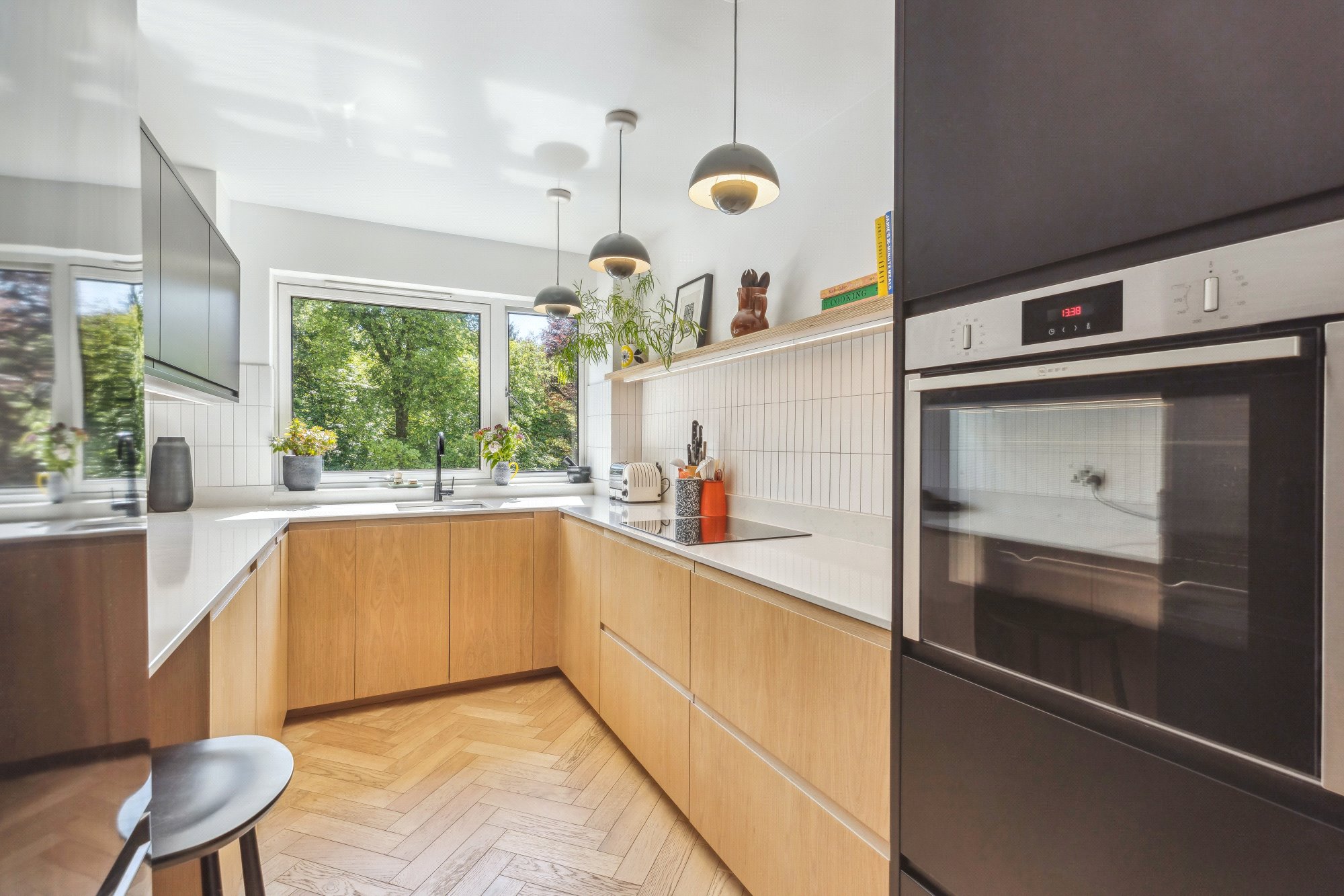 No.17 Netherblane occupies as highly appealing situation in the development, with an appealing, tucked away position in one of the buildings that feature south facing balconies overlooking the beautifully kept residents’ gardens. The property is in strong material condition, with quality flooring, a recently replaced kitchen and a contemporary bathroom combining to great effect. Stylistically, our clients have employed a really cool and contemporary yet understated decorative palette that will offer appeal to a wide range of potential buyers – touches like the engineered oak parquet flooring through much of the property (well insulated for noise) really do separate this from other properties in the development. Heating is provided via a modern wet electric heating system.