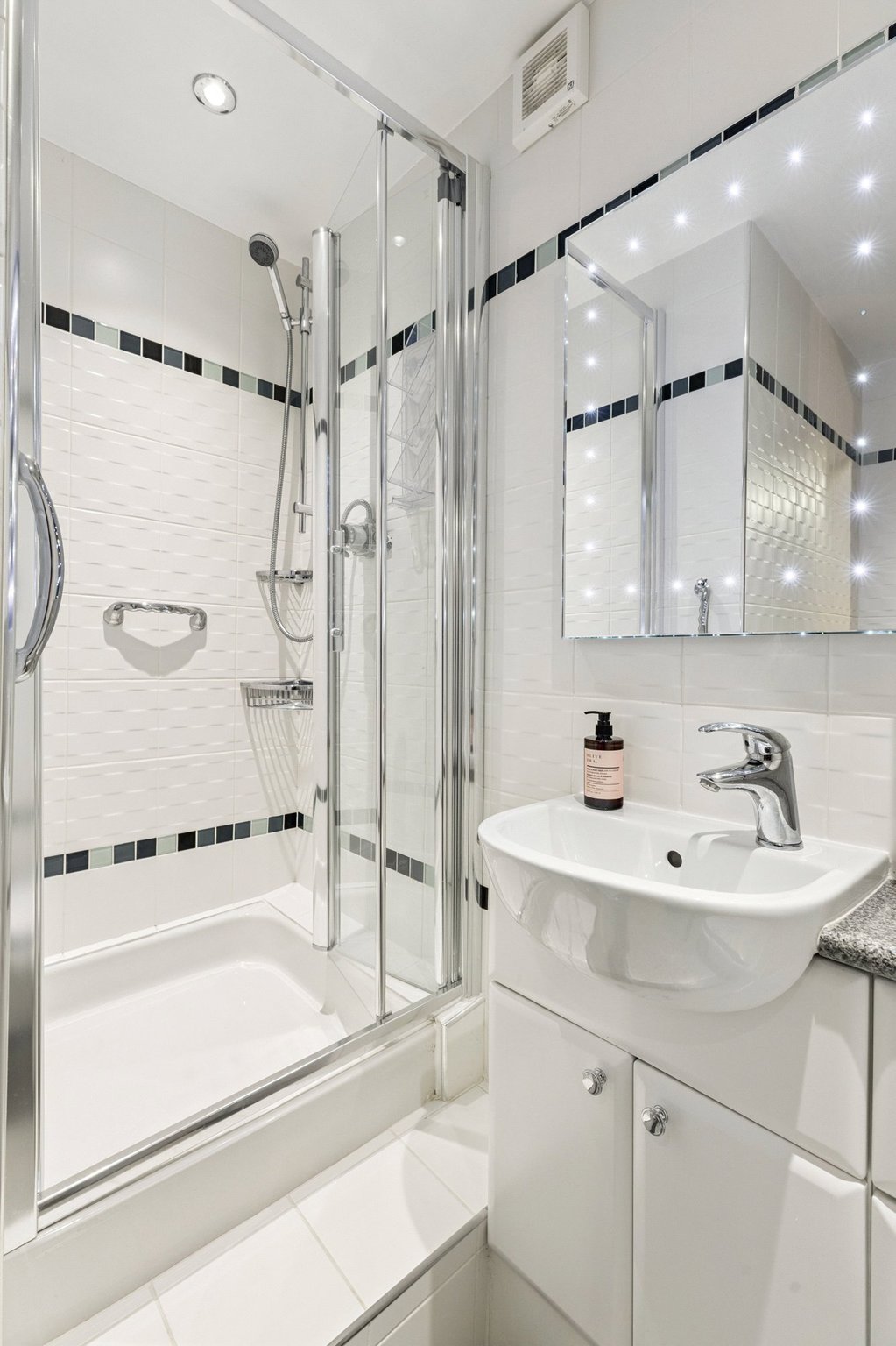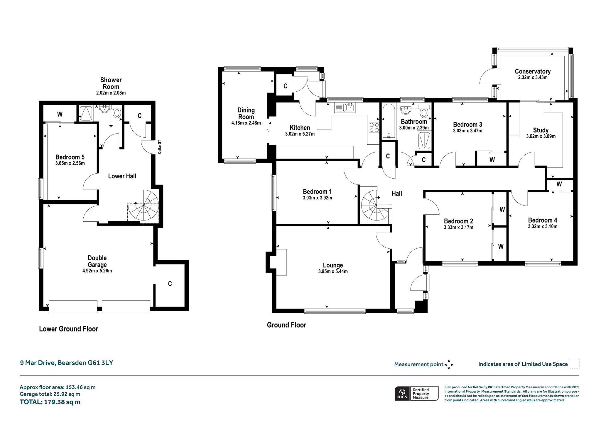 A spiral staircase leads from a corner of the main reception hallway to the hallway of the lower ground floor. From here, access is provided to a fifth double bedroom (with fitted storage provision), a spacious shower room decorated with fresh wall tiling, generous storage cupboard, and integral access to the sizeable double garage.