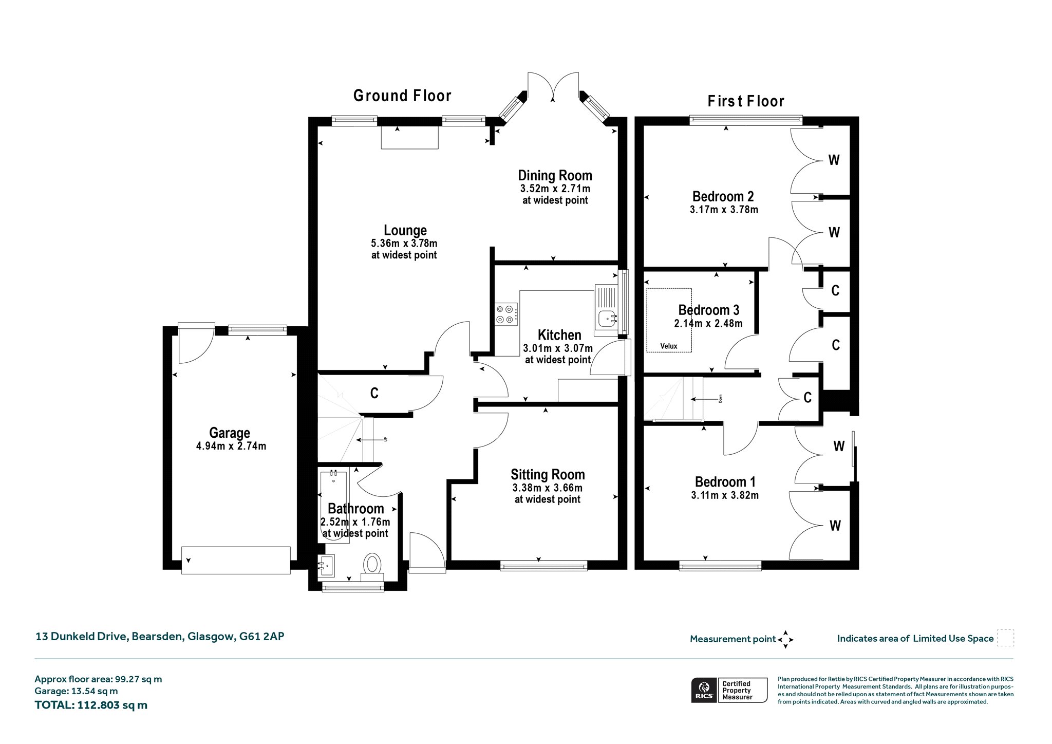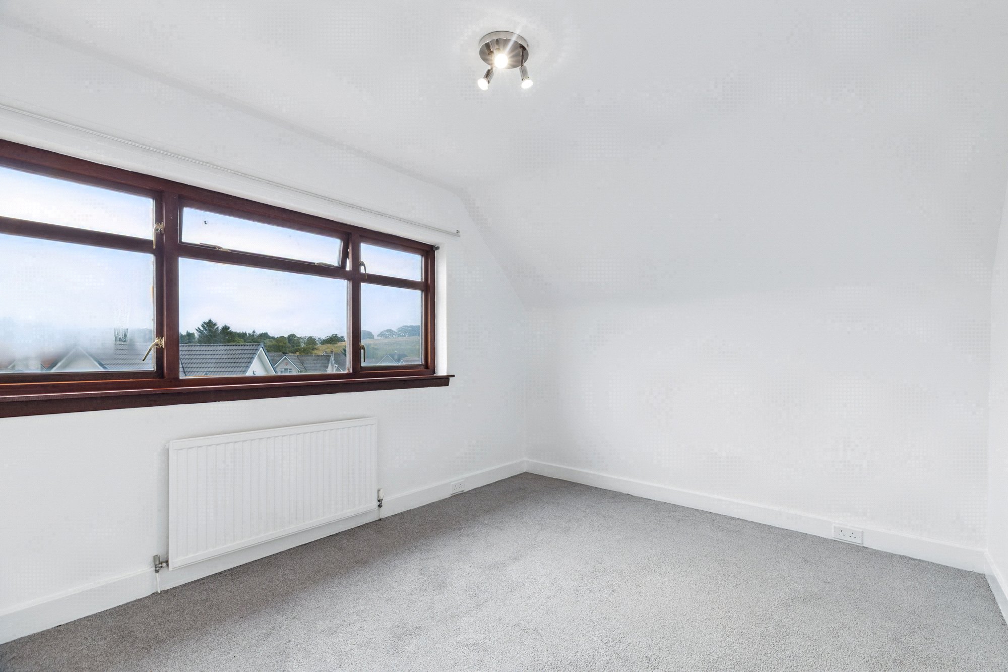A return flight stair passes a ¼ landing and ascends to a first-floor hallway with two cupboards and a third cupboard which provides access to eaves. Two good sized double bedrooms, both with double-width wardrobe provision, and eaves access, and with bedroom 1 providing a nice outlook to the front over the rooftops opposite to a field hilltop and in the distance to the horizon outline of The Campsie Fells. Bedroom 3 is a small single, with Velux window, that would be good for a kid or ideal as a Home Office.