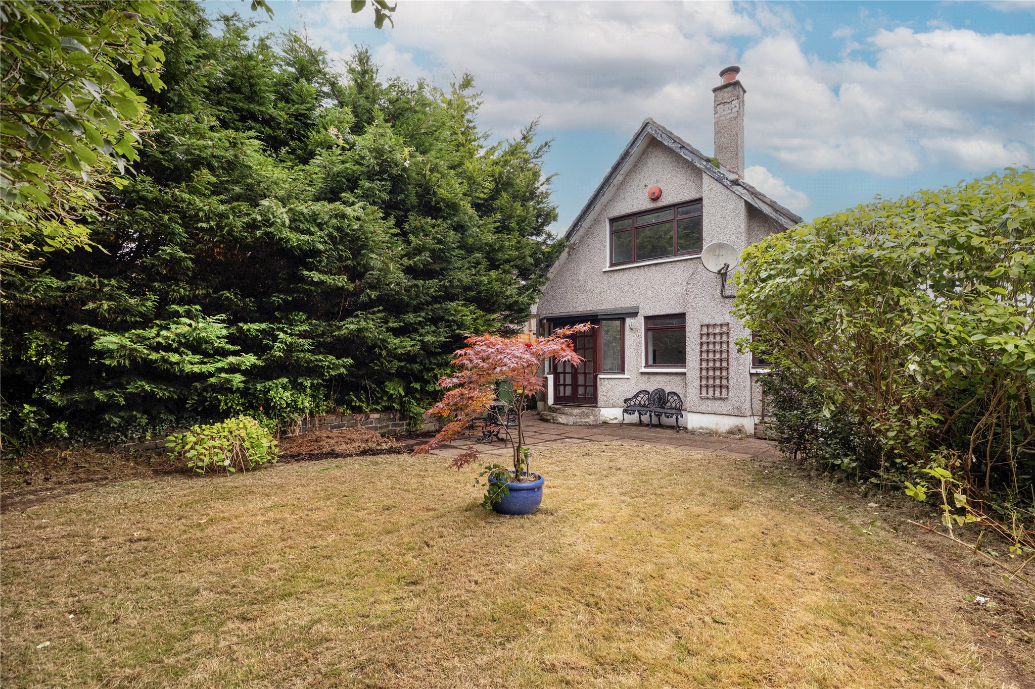 The garden is south facing at the rear. It too will require investment. The rear garden is enclosed by fences, a brick wall, and is gated. Mature conifers and some trees provide full privacy. The front garden includes a one-car drive and a small section of grass with low hedges as boundaries. A path leads around the west side of the house(gate) where there is a water tap. Attached to the east gable is a single garage with modern electric garage door, and a door to the rear garden. Behind the garage is a greenhouse.